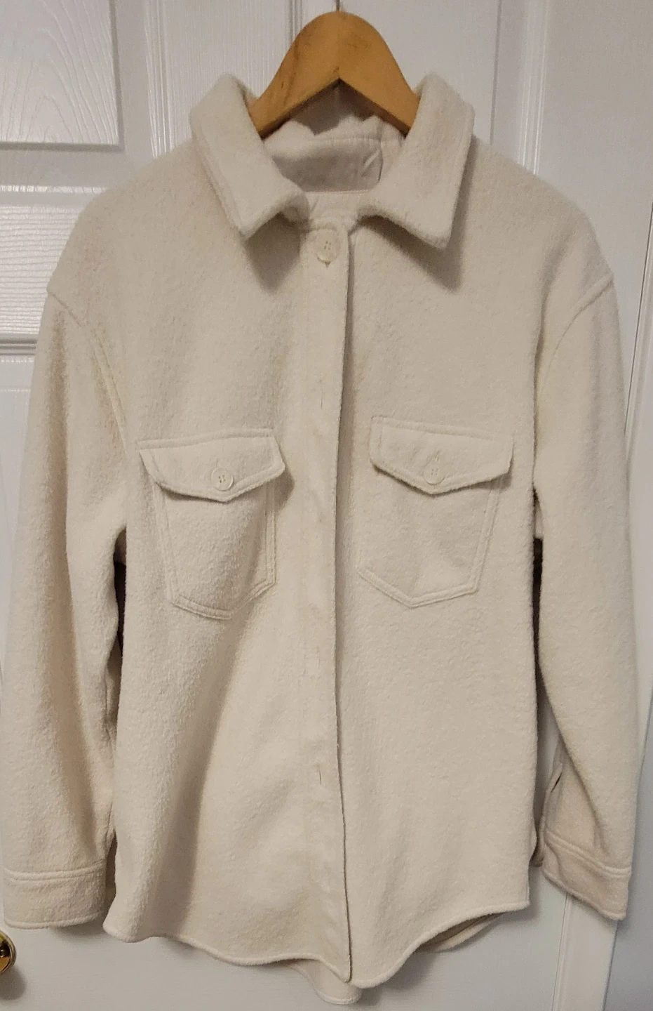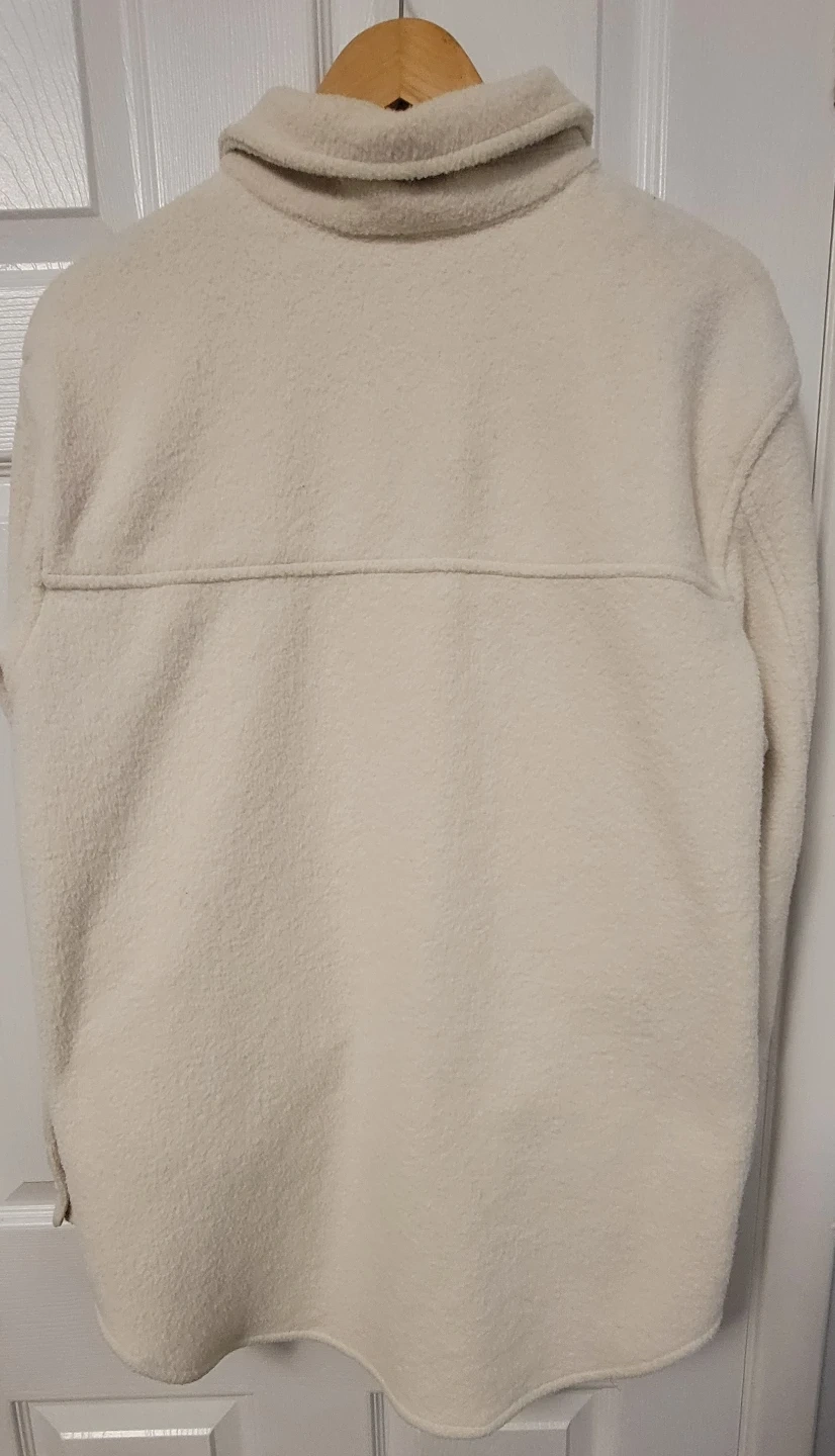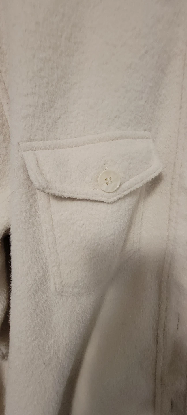Joie cream shacket in XL/TG. It's made from a fuzzy textured material with two front pockets and button closures. This versatile shacket is great for layering on cooler days!