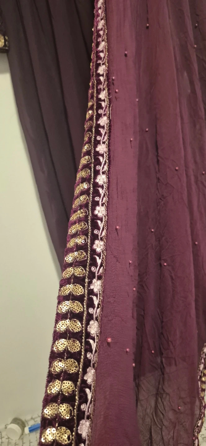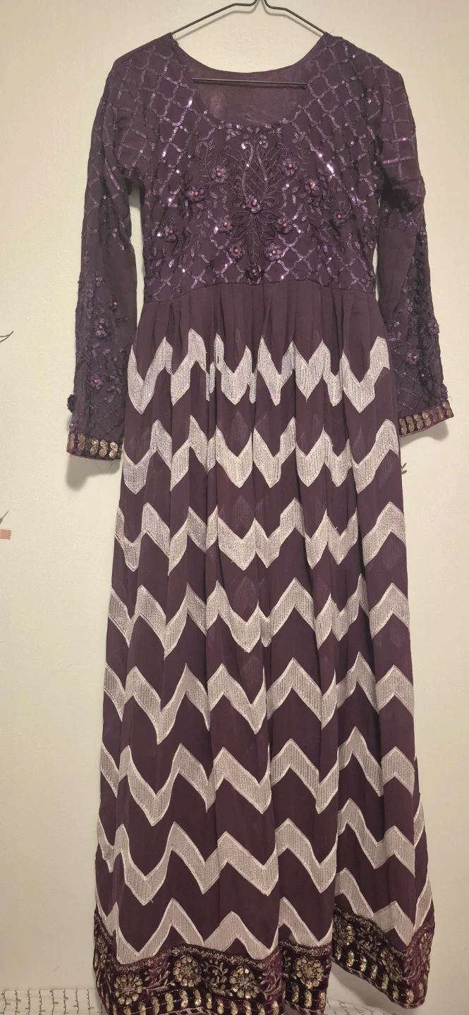Beautiful purple Anarkali suit with intricate embroidery on the yoke and sleeves. It features a tiered skirt with a chevron pattern and comes with a matching dupatta. The fabric appears to be a flowy georgette or chiffon material, perfect for special occasions.