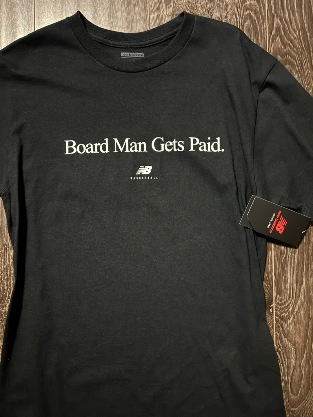 Black t-shirt. Features a white graphic reading "Board Man Gets Paid." New Balance logo and text included. New with tags.
