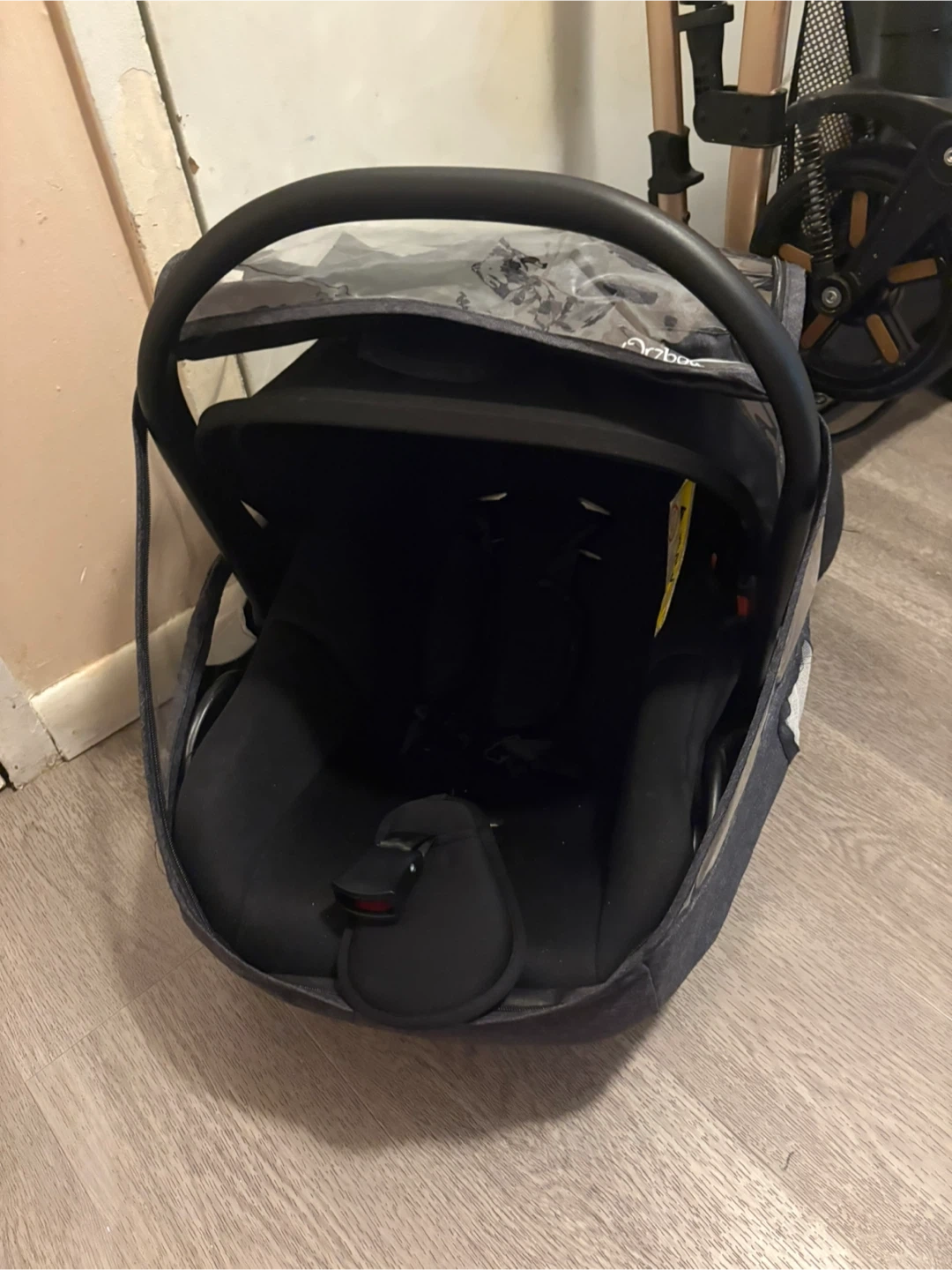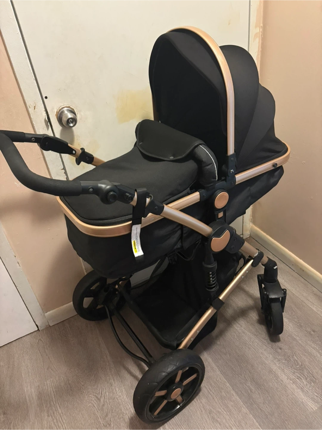 Black baby stroller featuring a rose gold colored frame. It includes a bassinet and a car seat adapter. This stroller offers a comfortable ride for your little one. It's designed for easy maneuverability.