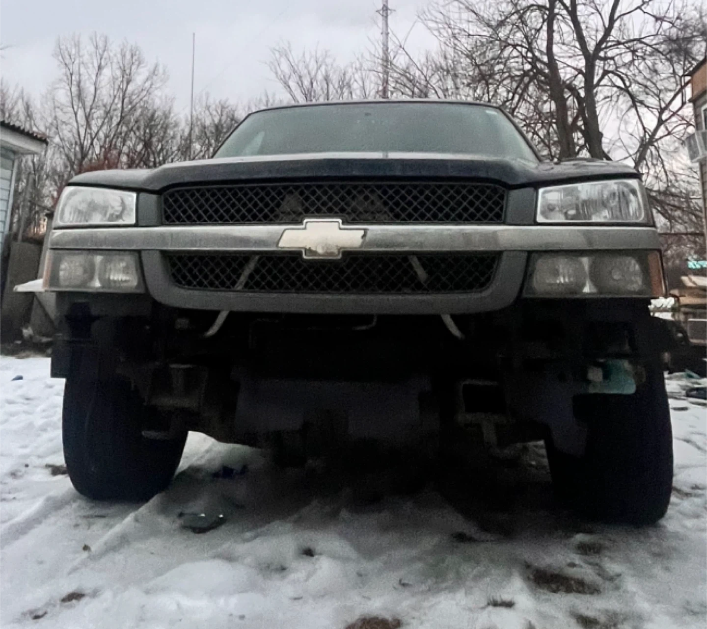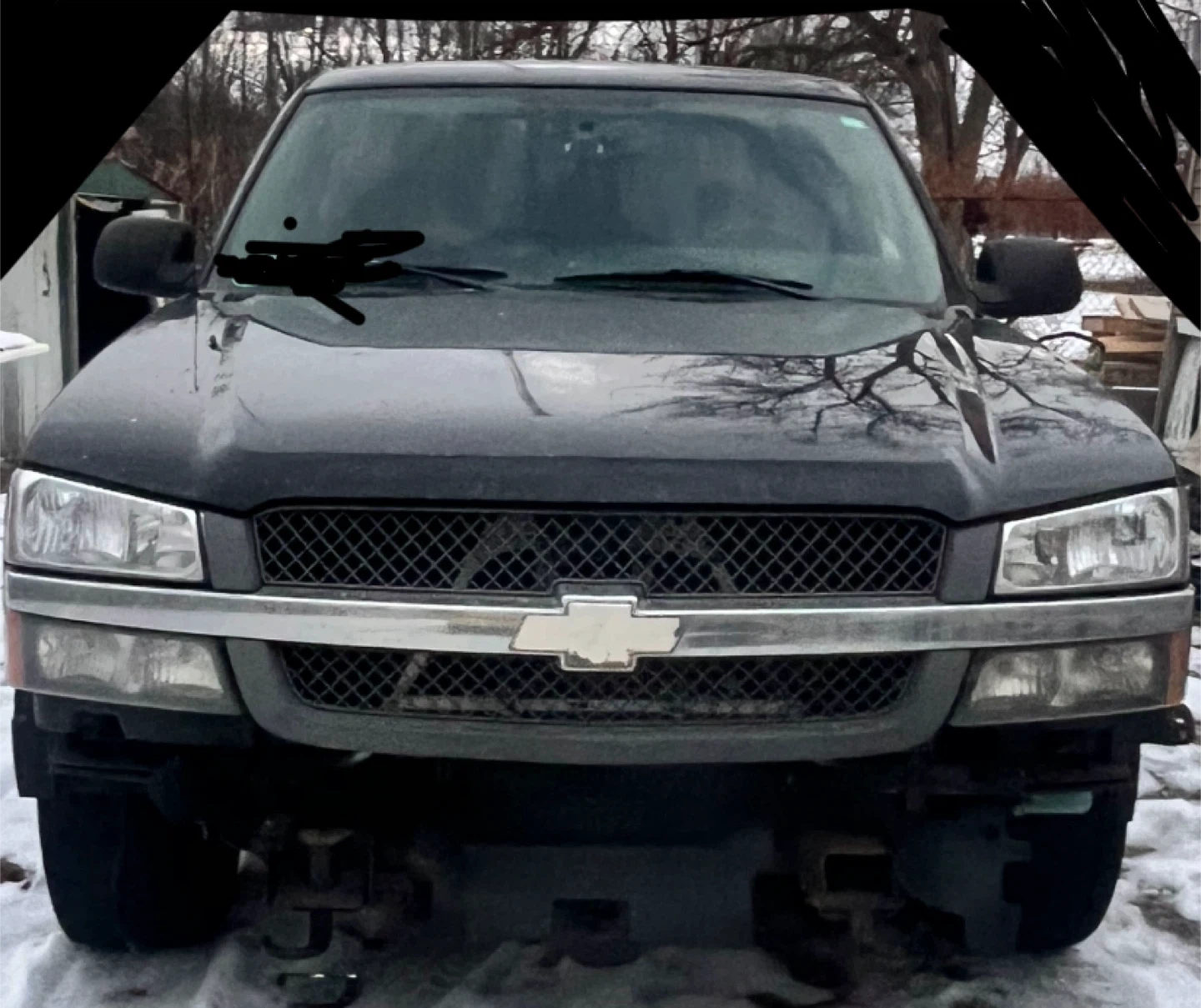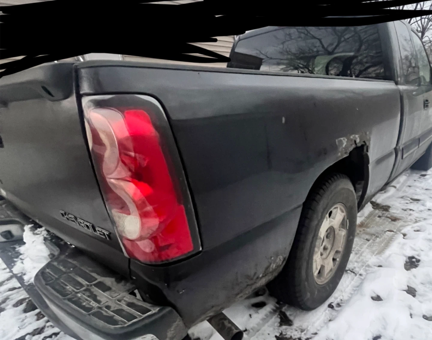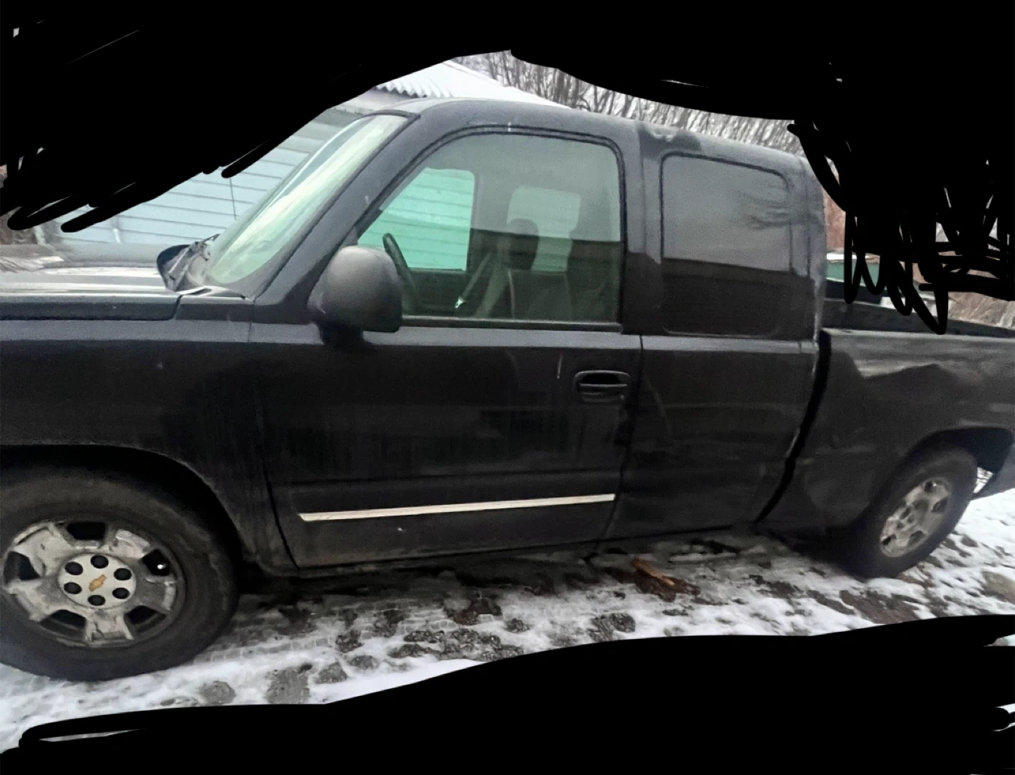 This is a black Chevrolet Silverado pickup truck. It has a crew cab and four-wheel drive. The truck shows signs of wear and tear, as expected for its age and use.