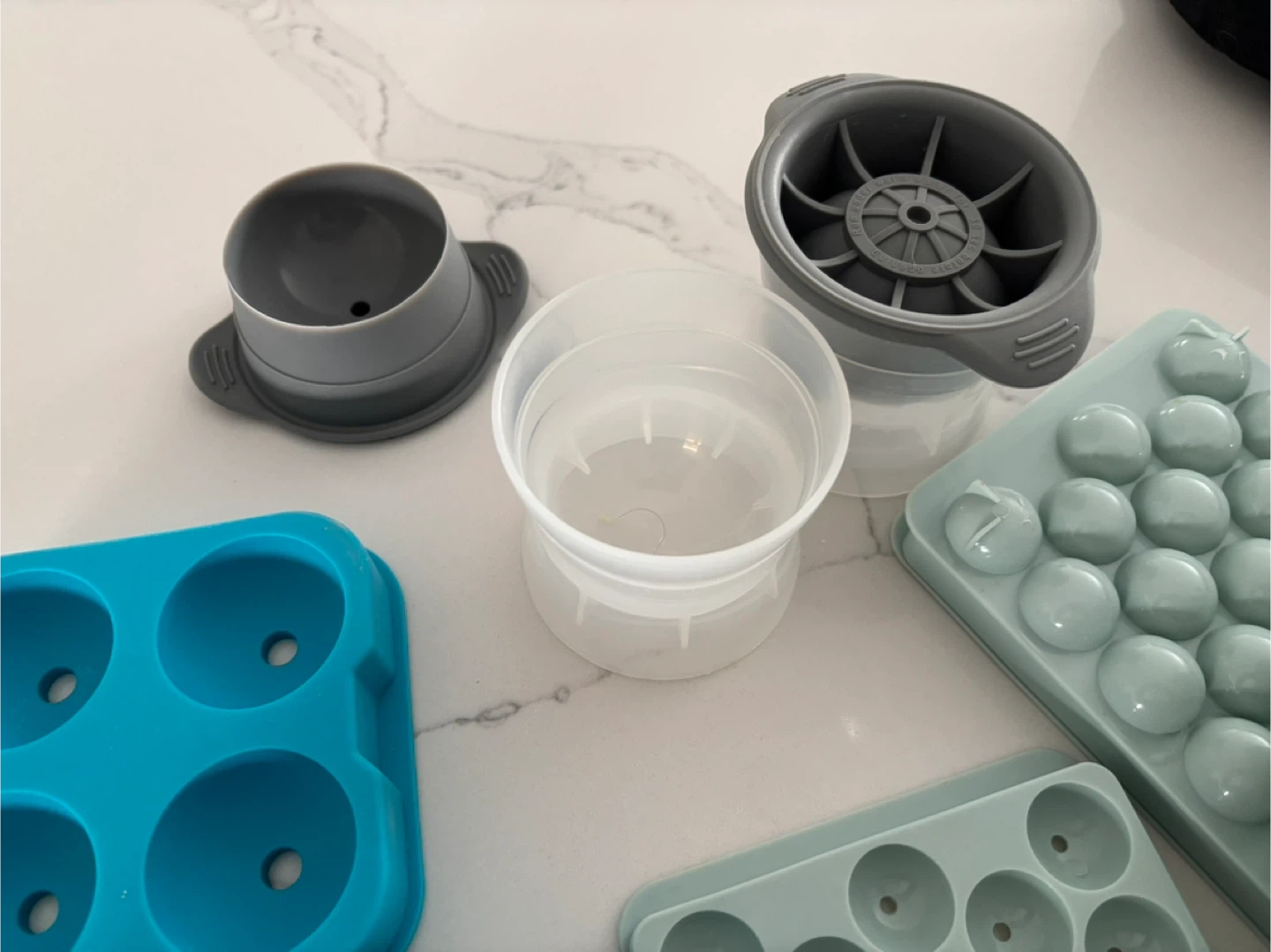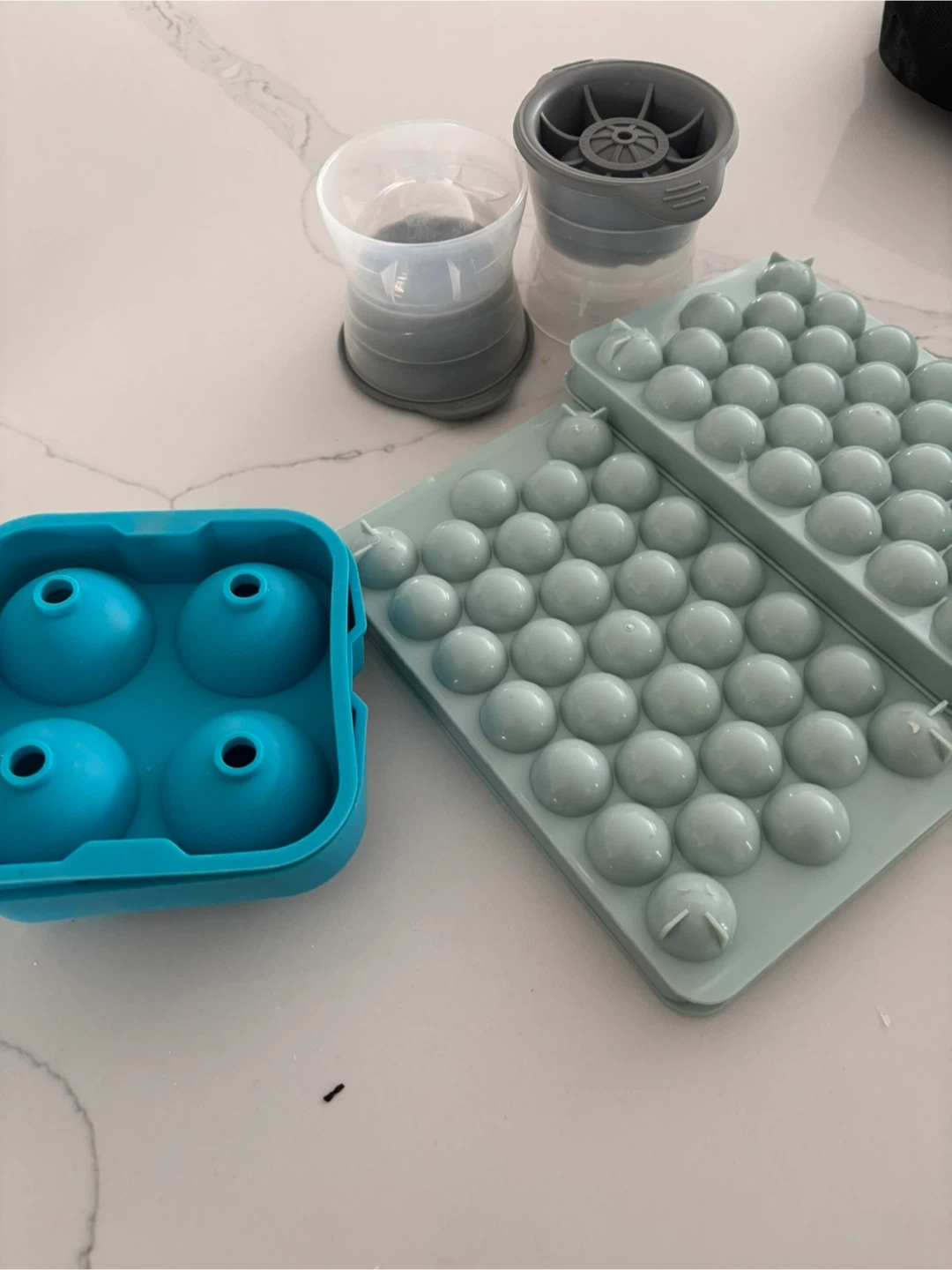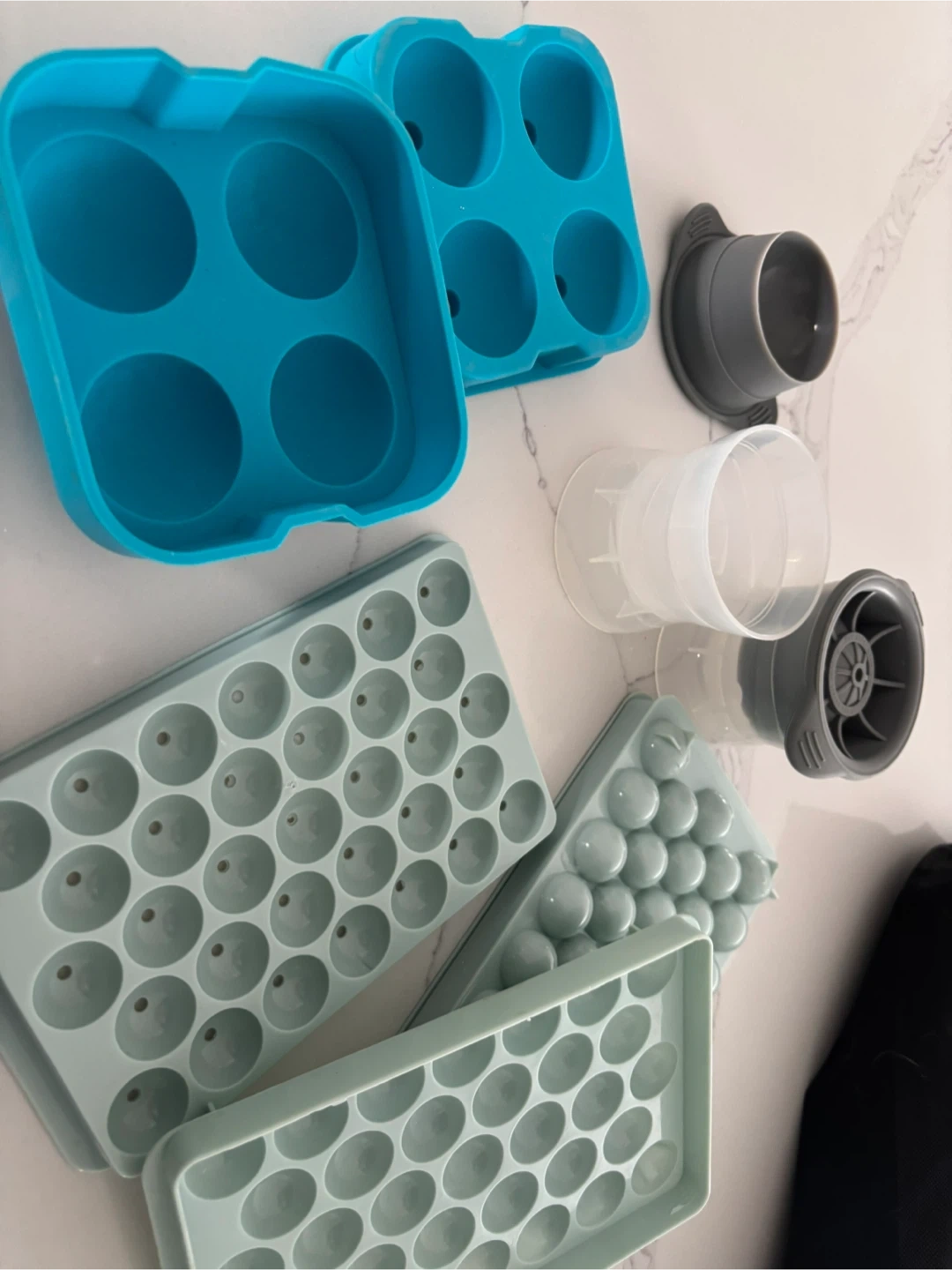 This set includes various ice cube trays and molds for making different shapes of ice. You'll get a blue tray with four large spherical molds, two light green trays with numerous small spherical molds, and a grey and white cylindrical mold. These are great for chilling drinks or making fun ice shapes!