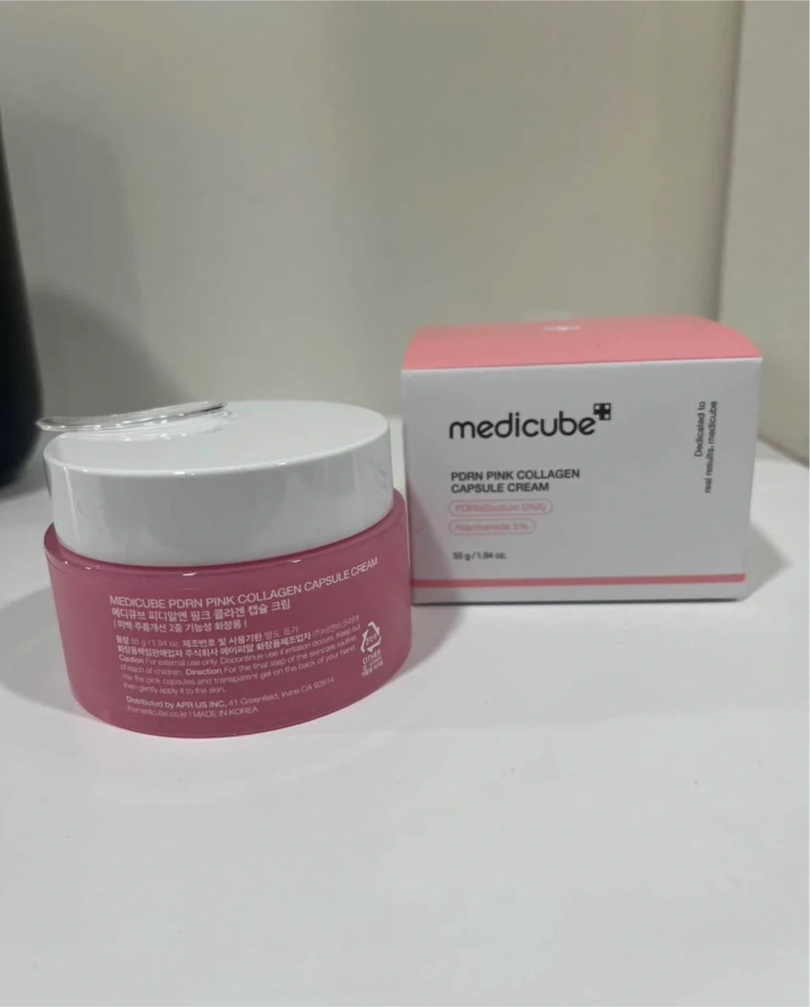 This is the Medicube PDRN Pink Collagen Capsule Cream. It contains PDRN (Sodium DNA) and Niacinamide 5%. The cream is 55g / 1.94 oz.