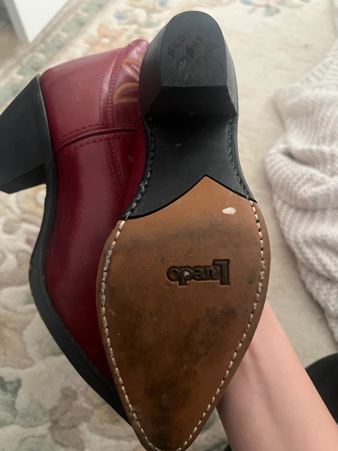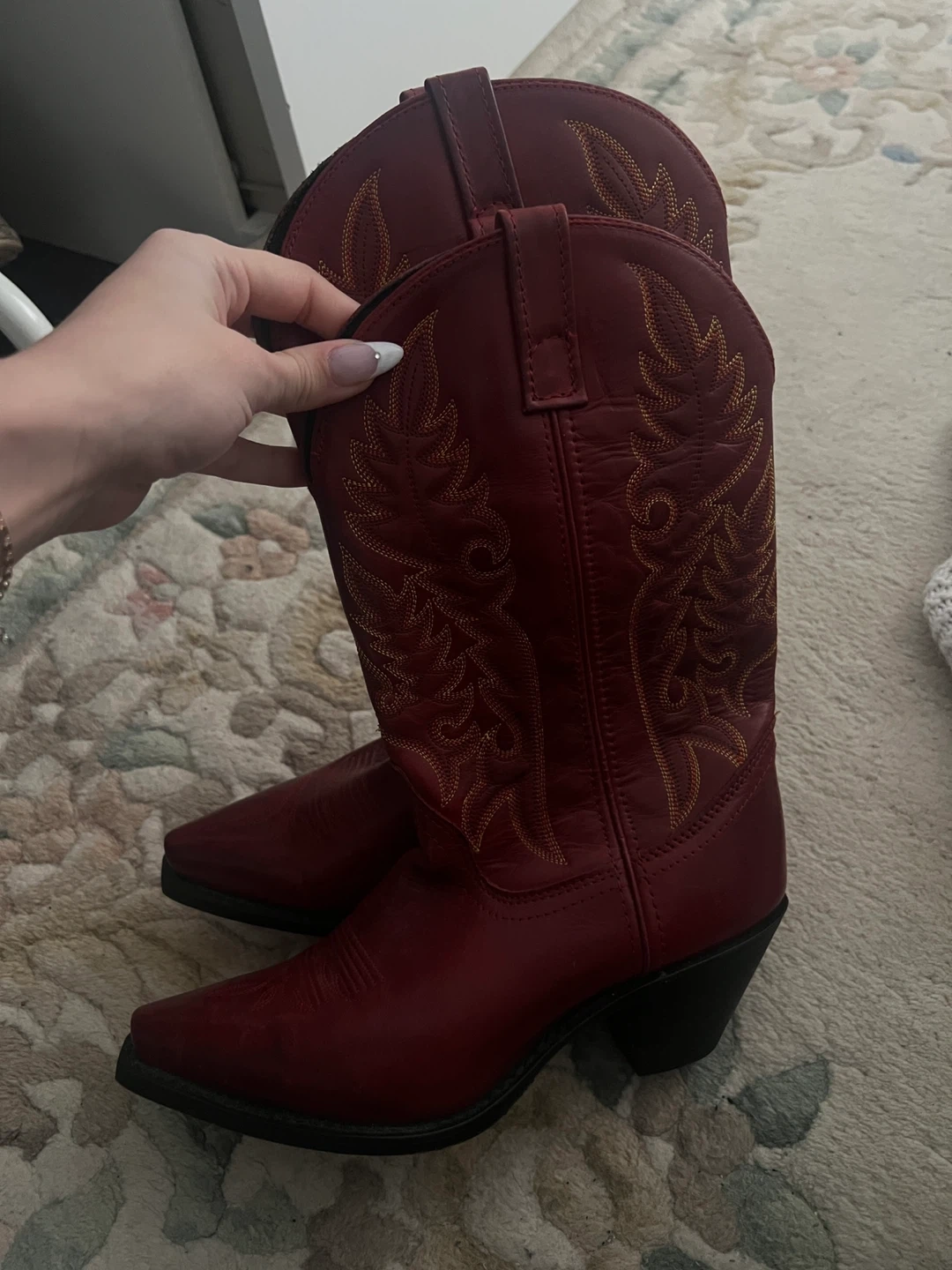 These Laredo cowboy boots are a classic red colour. They feature decorative stitching and a heel. Leather material.