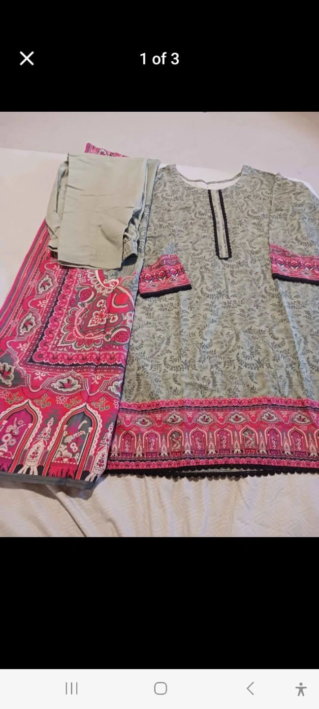 This 3-piece outfit features a light green printed kurti with pink and grey paisley accents. It comes with matching trousers and a printed dupatta. The fabric is comfortable and suitable for everyday wear.