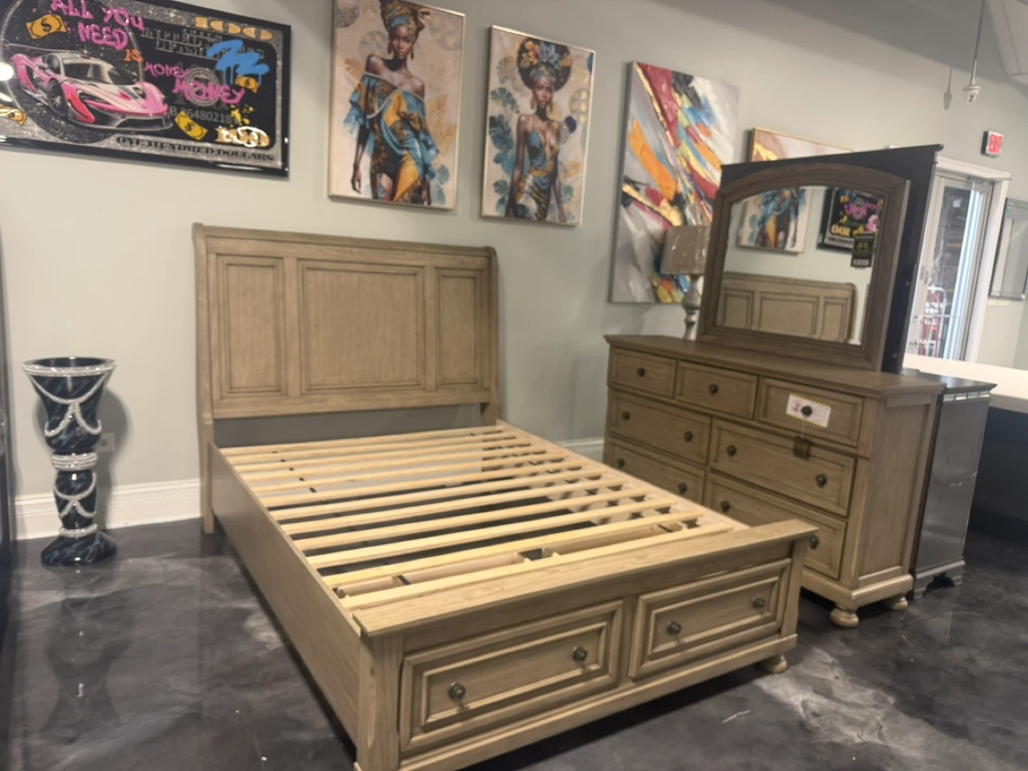 This is a queen size bed frame crafted from solid oak wood. It features two built-in storage drawers at the foot of the bed for extra space. The slatted mattress support provides good ventilation. A matching dresser with a mirror is also shown in the image but is not included with this bed frame.