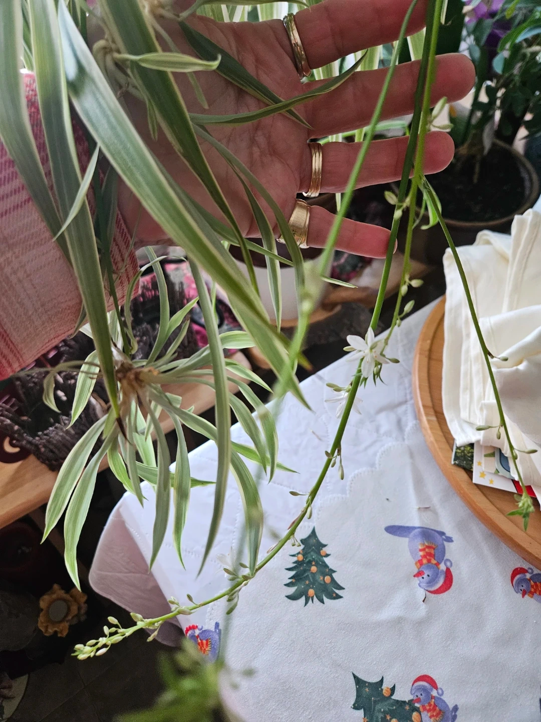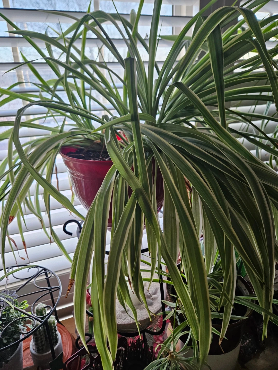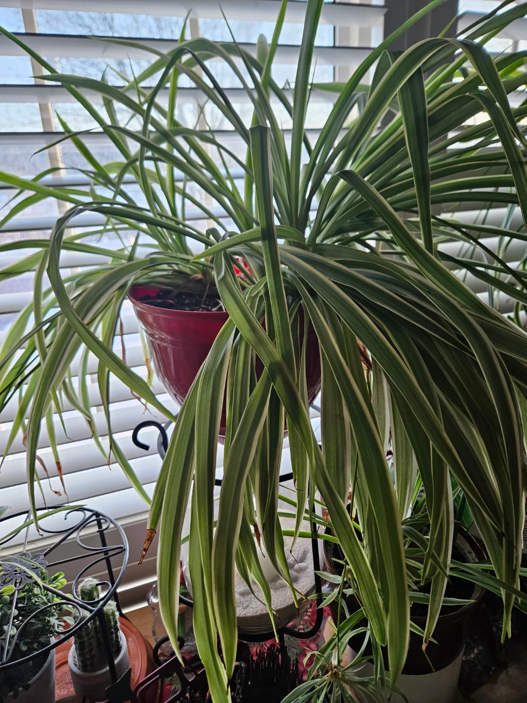 Established Chlorophytum comosum spider plant with long, arching green and white striped leaves. This plant is known for its air-purifying qualities and produces small white flowers. It's a hardy plant that thrives in bright, indirect light. Excellent for adding a touch of green to any room!