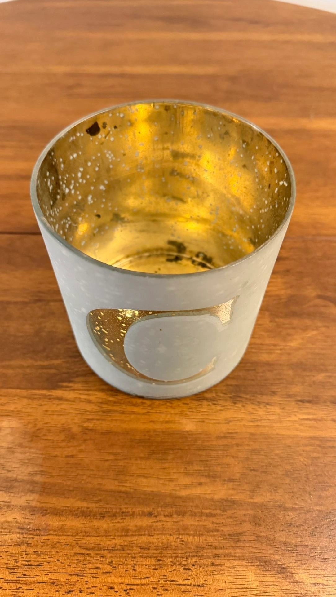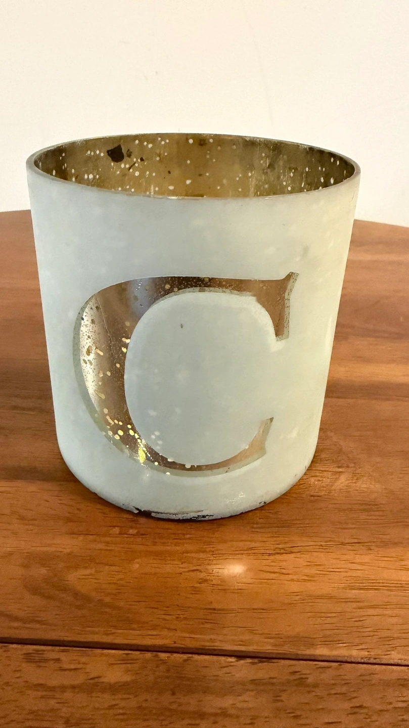 Decorative frosted glass candle holder with gold interior and large “C” monogram detail. Gives off a warm glow when lit. Approx. 5” x 5”. Frosted exterior with metallic gold interior. Great for candles or small decorative display. Lightly used. Perfect for shelf styling, coffee table décor, or gifting.