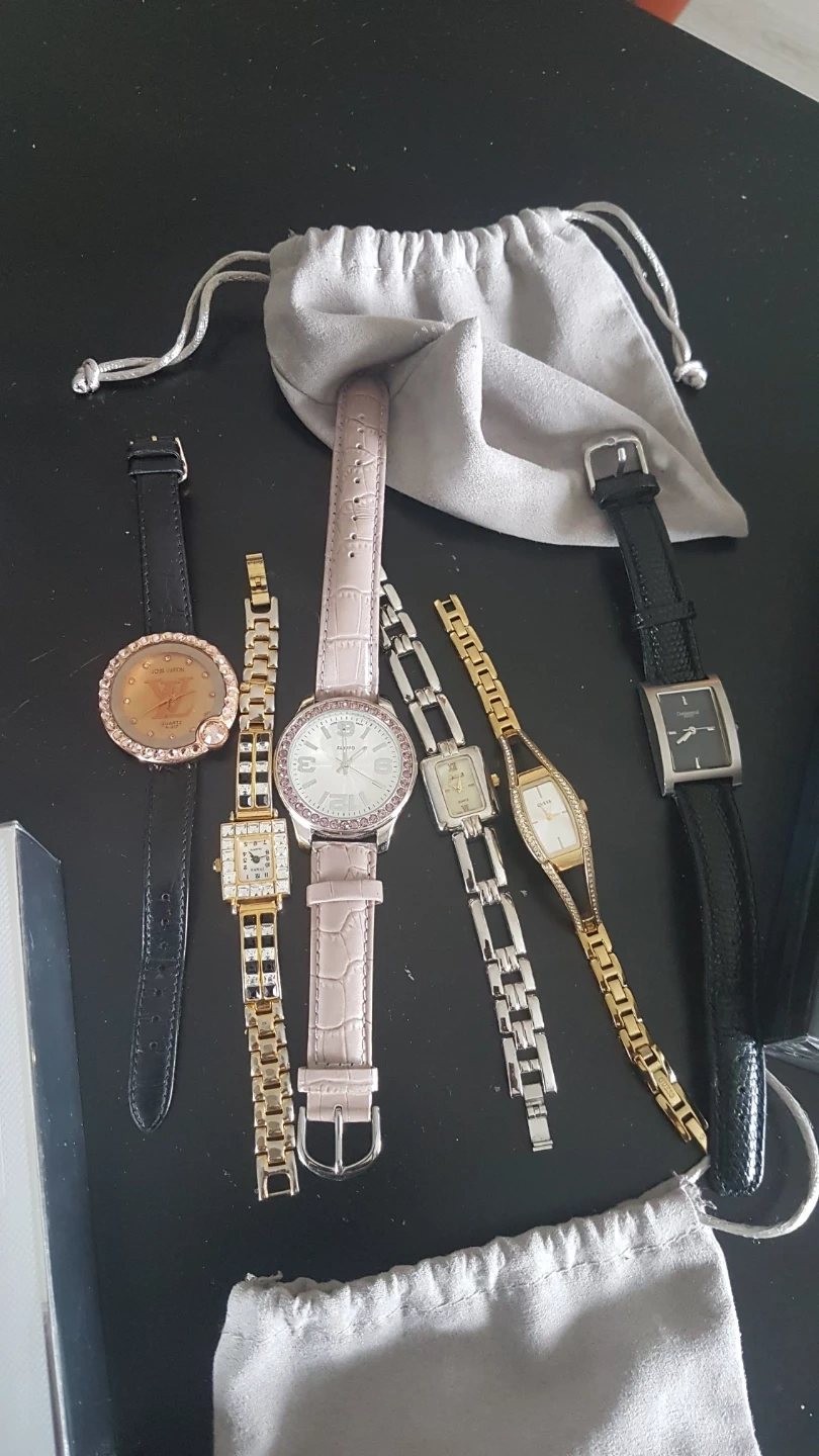 This lot includes several women's watches with various styles. You'll find a watch with a pink crocodile-patterned band and crystal accents on the bezel. There's also a gold-tone watch with a decorative bracelet and a black leather strap watch with a round face. A small grey pouch is also included for storage. Need battery change for all fyi