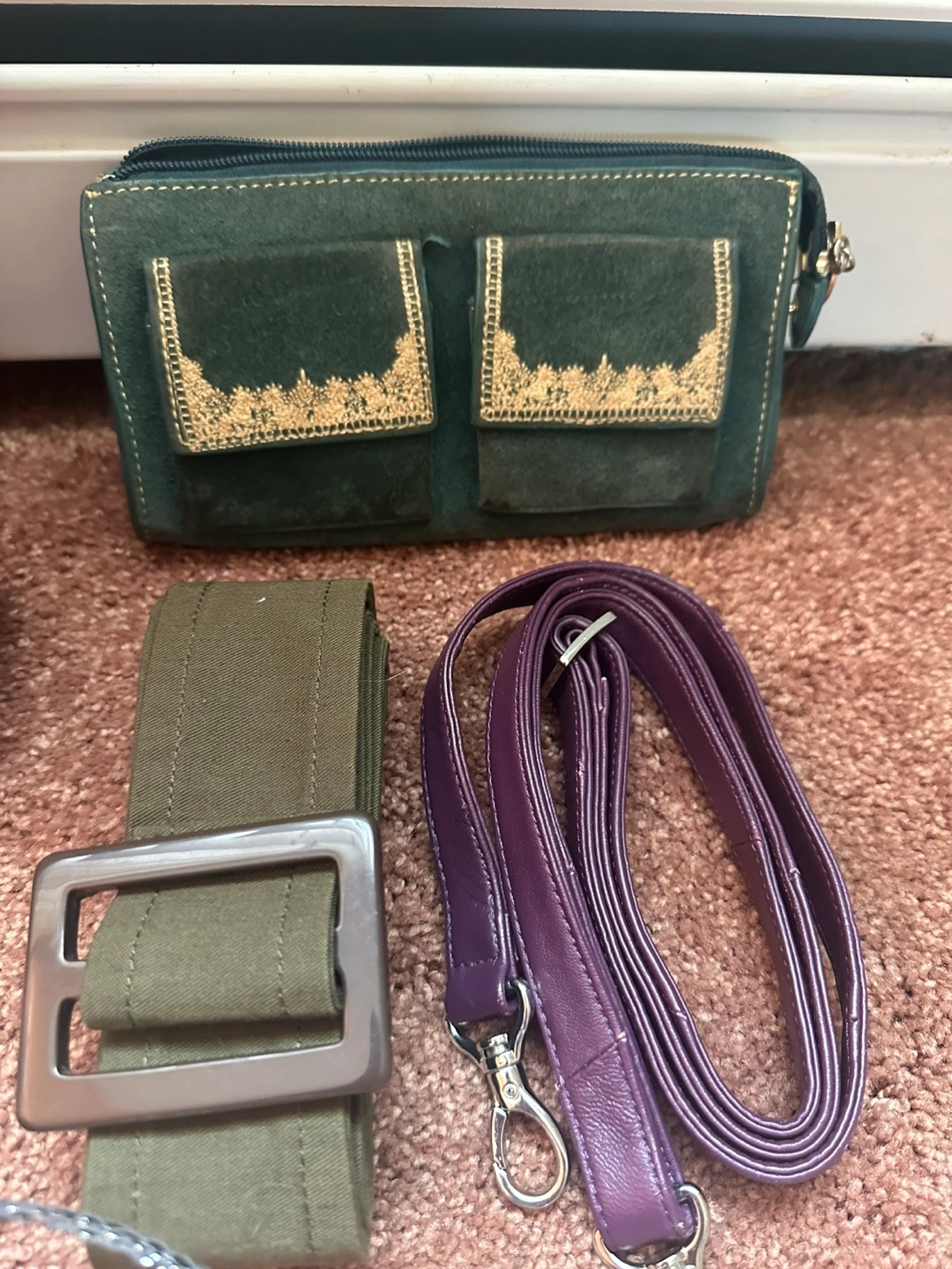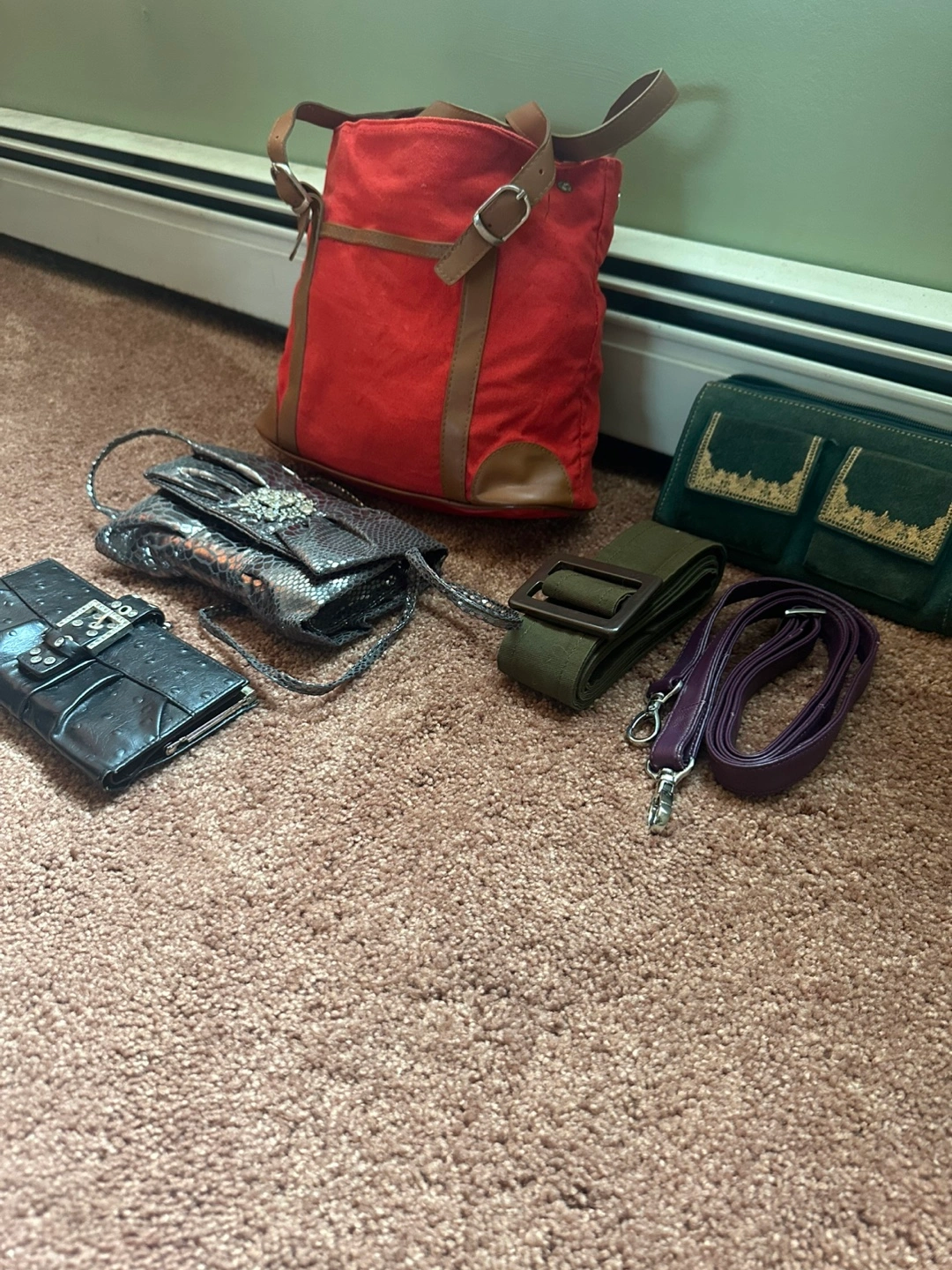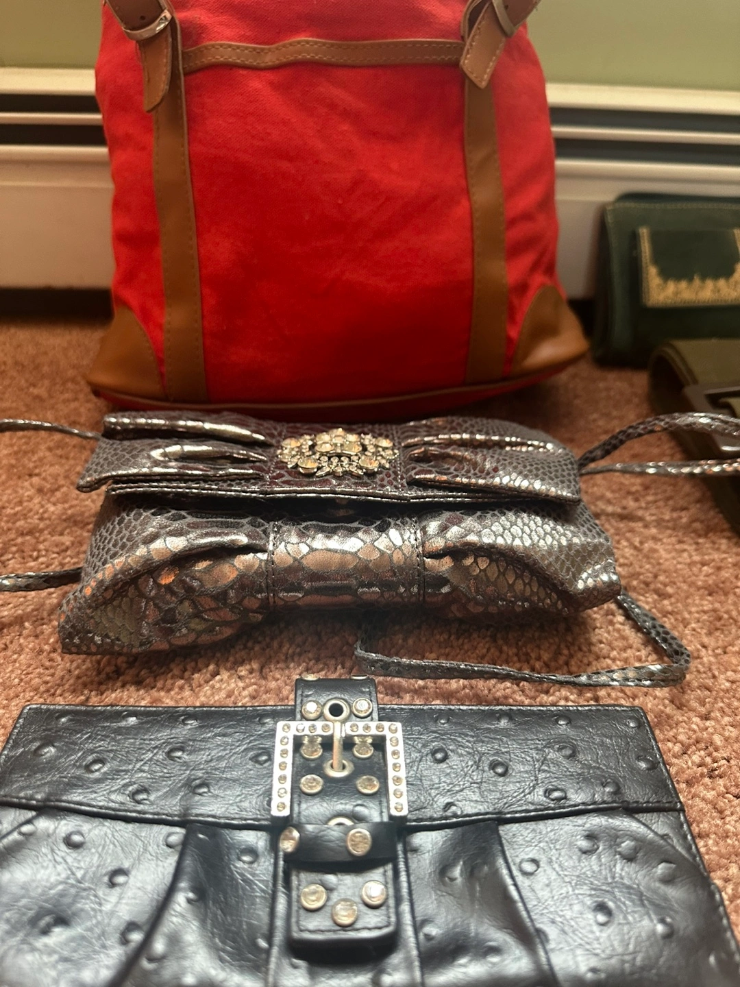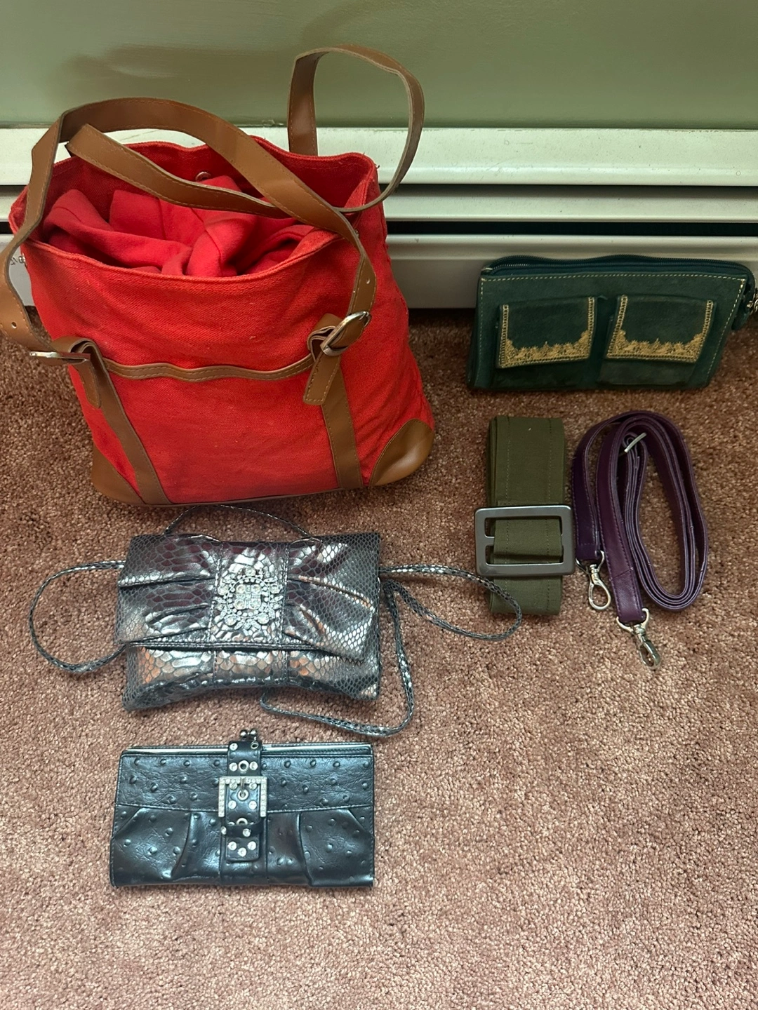 Selling a collection of bags and accessories, including a green suede-like wallet/small bag with gold trim, a red tote bag with brown accents, a silver snakeskin-patterned clutch, a black clutch with silver hardware, a green belt, and a purple shoulder strap