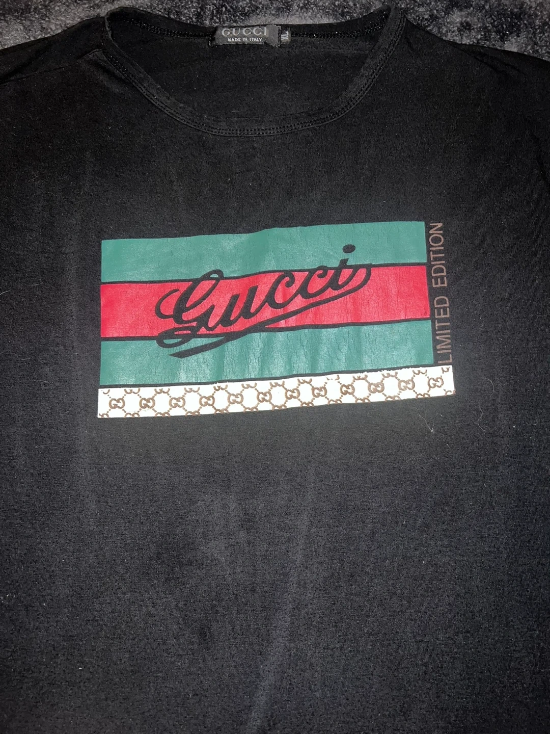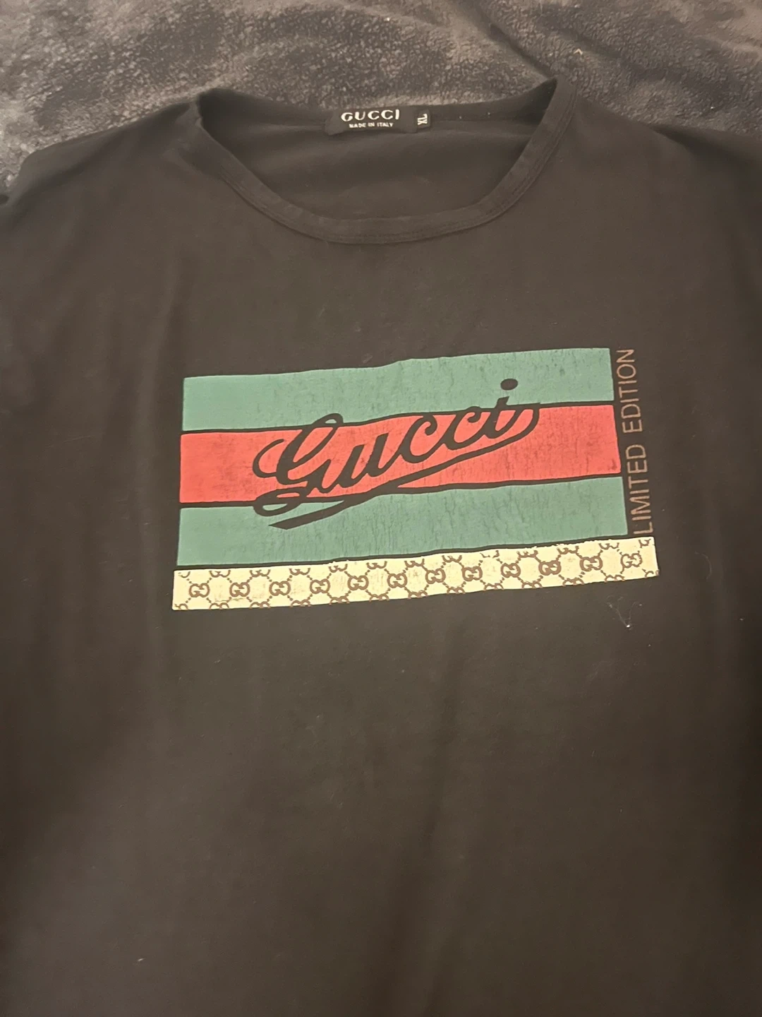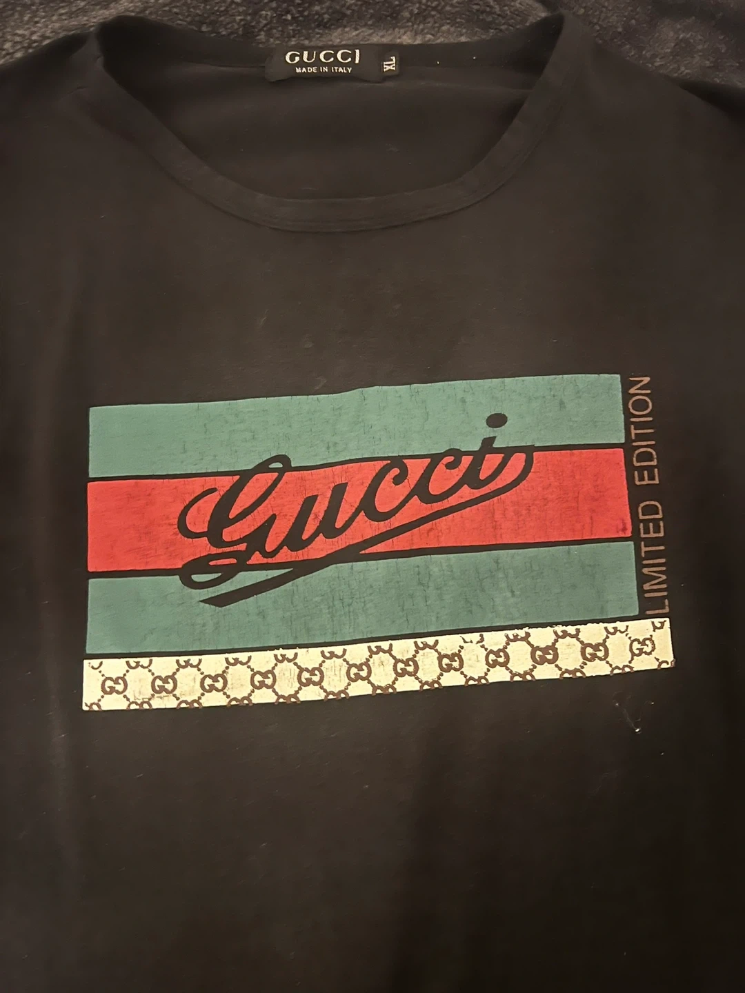 Black Gucci t-shirt with iconic stripe and logo detail. Says "Limited Edition" on the side. Size XL, made in Italy. This shirt is perfect for anyone looking to add a touch of luxury to their wardrobe!