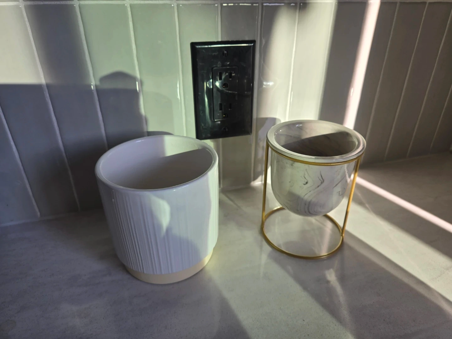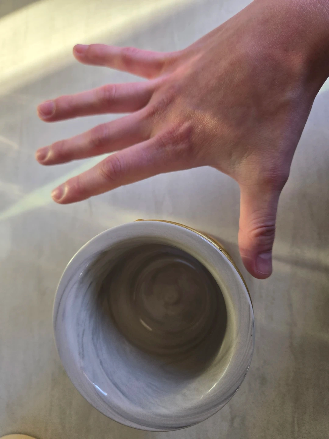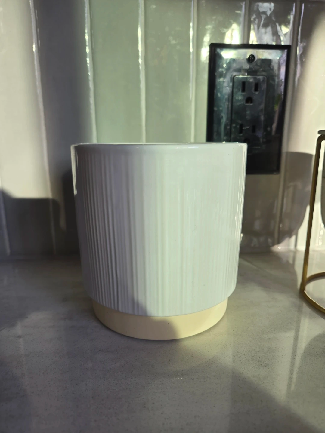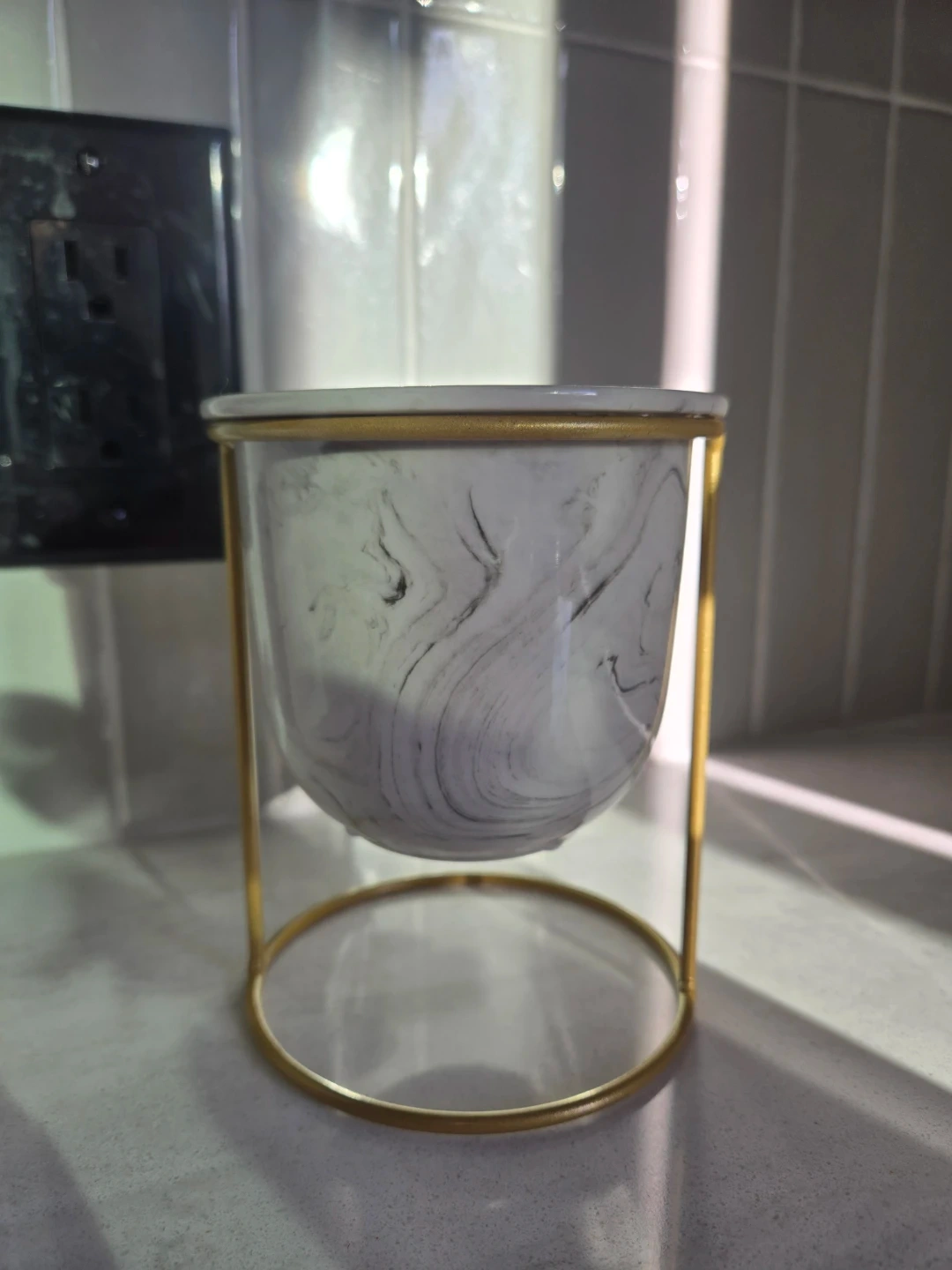 White ribbed ceramic planter pot with a beige base. Marble effect ceramic pot with gold stand. Perfect for small plants and succulents. Adds a stylish touch to any room!