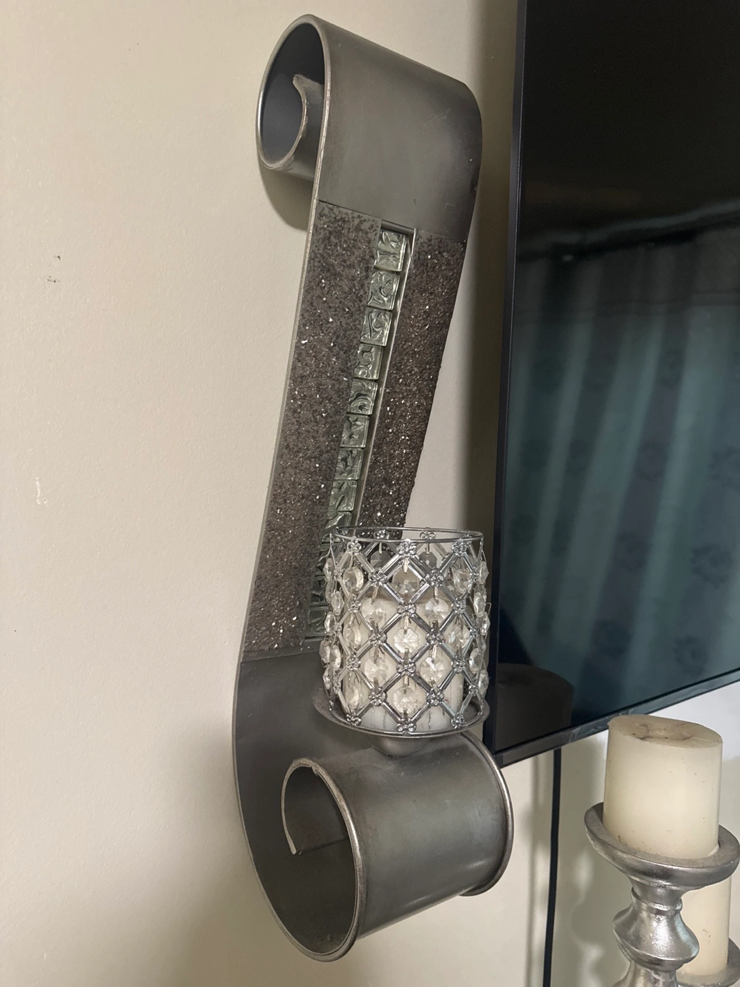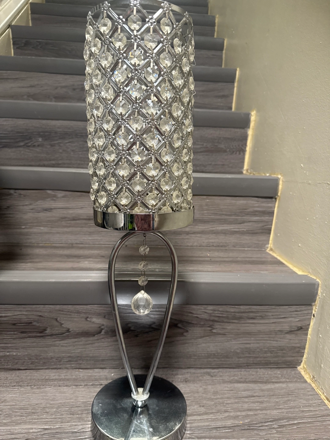 Elegant pillar candle holder featuring a crystal-encrusted cylinder and a chrome stand with hanging crystals. The base has a polished chrome finish. Perfect for adding sparkle to any room!