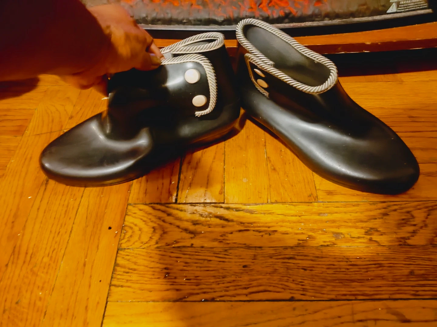 Pair of black rubber ankle boots. They feature a decorative striped trim around the opening and two button details on the side. The soles have a textured grip pattern for traction. Perfect for rainy days!
