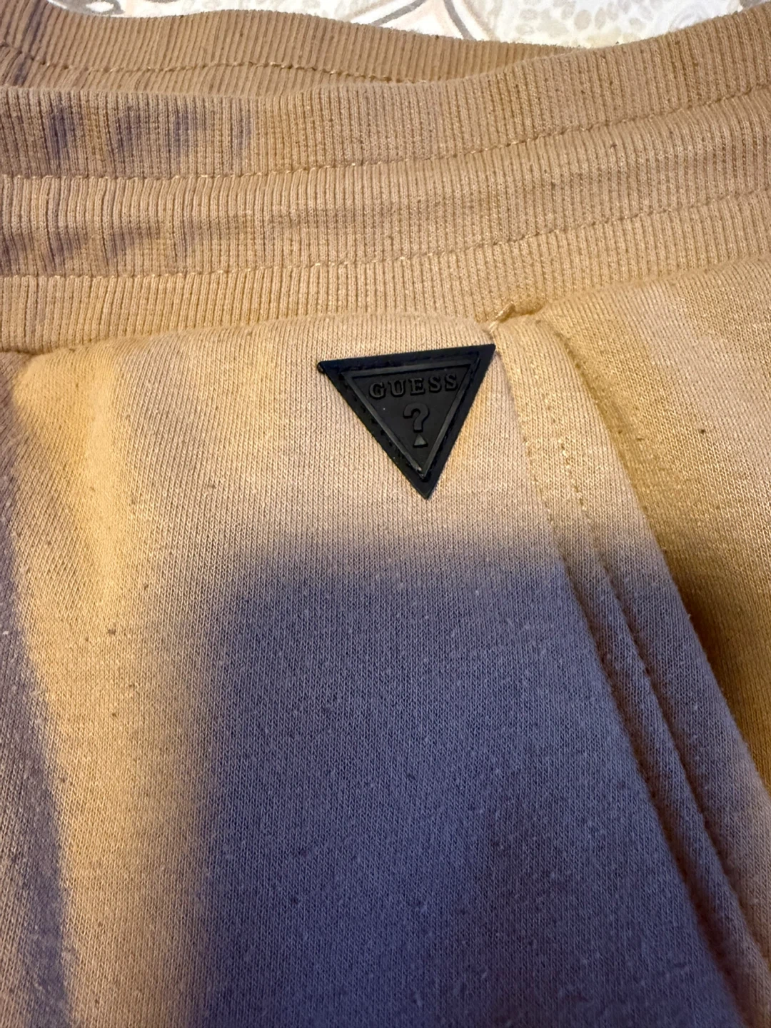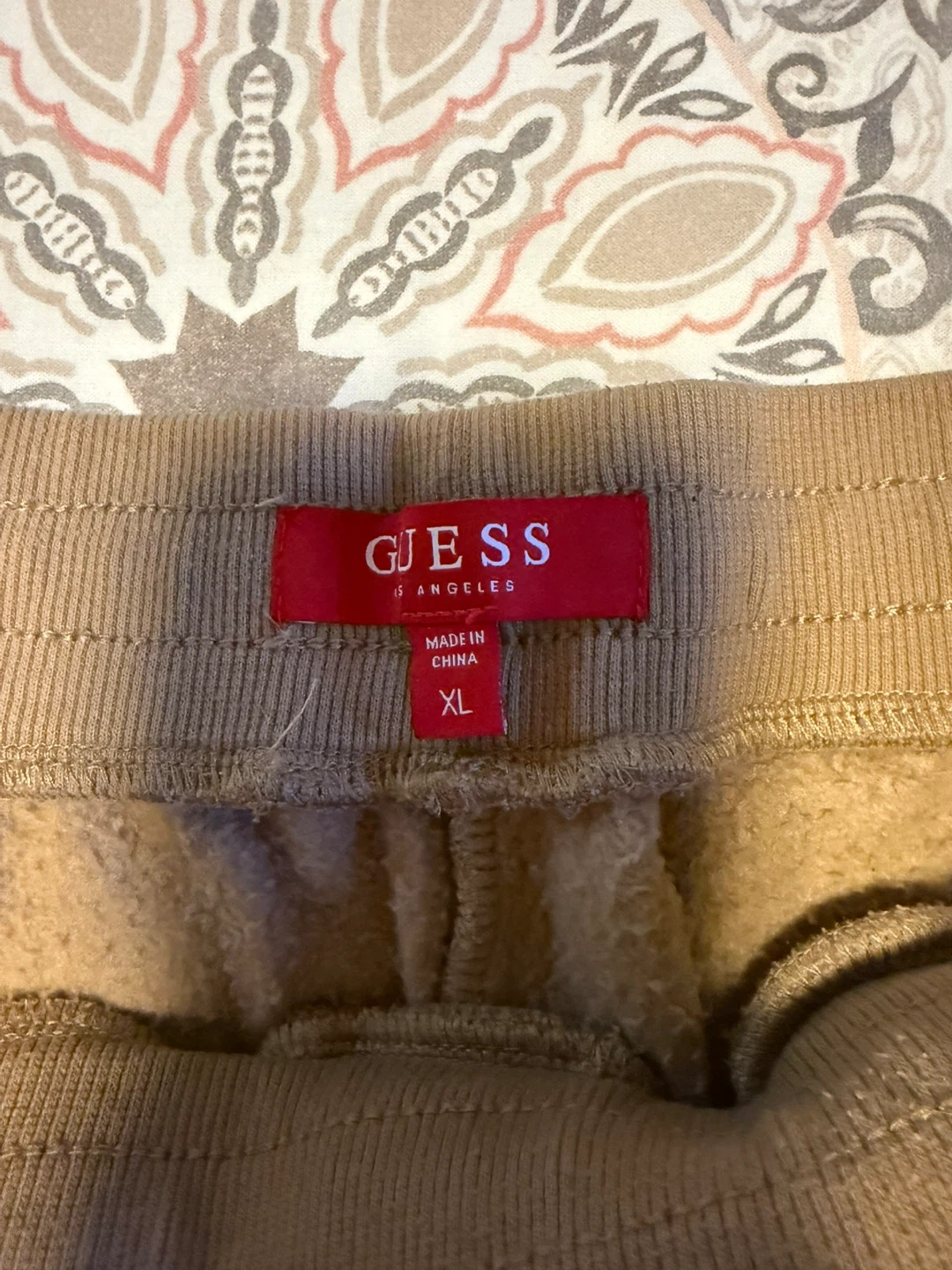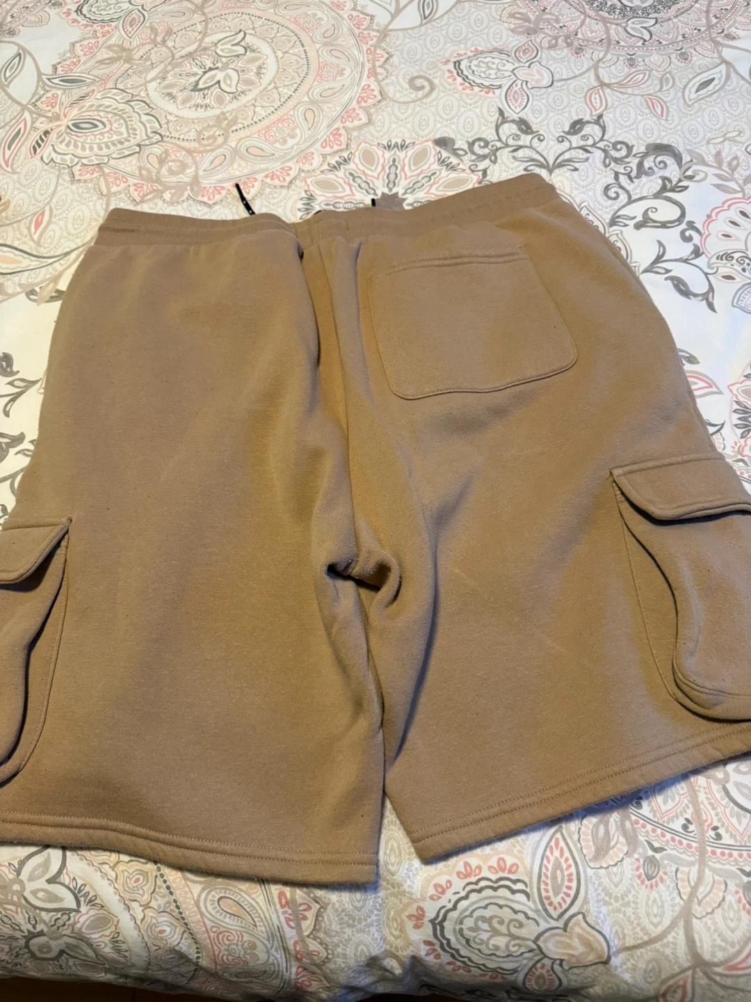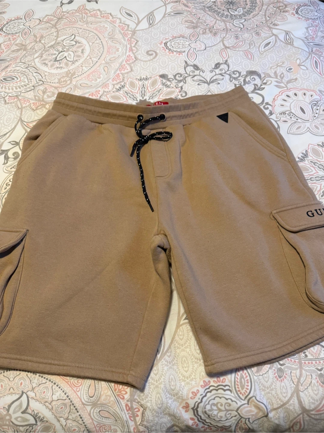 Guess men's tan cargo sweat shorts. feature a drawstring waist and a back and side pockets. Size is extra large. Made of comfortable material. great for casual wear. Perfect condition. Bundle to save!