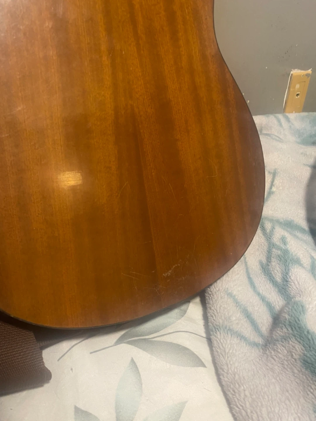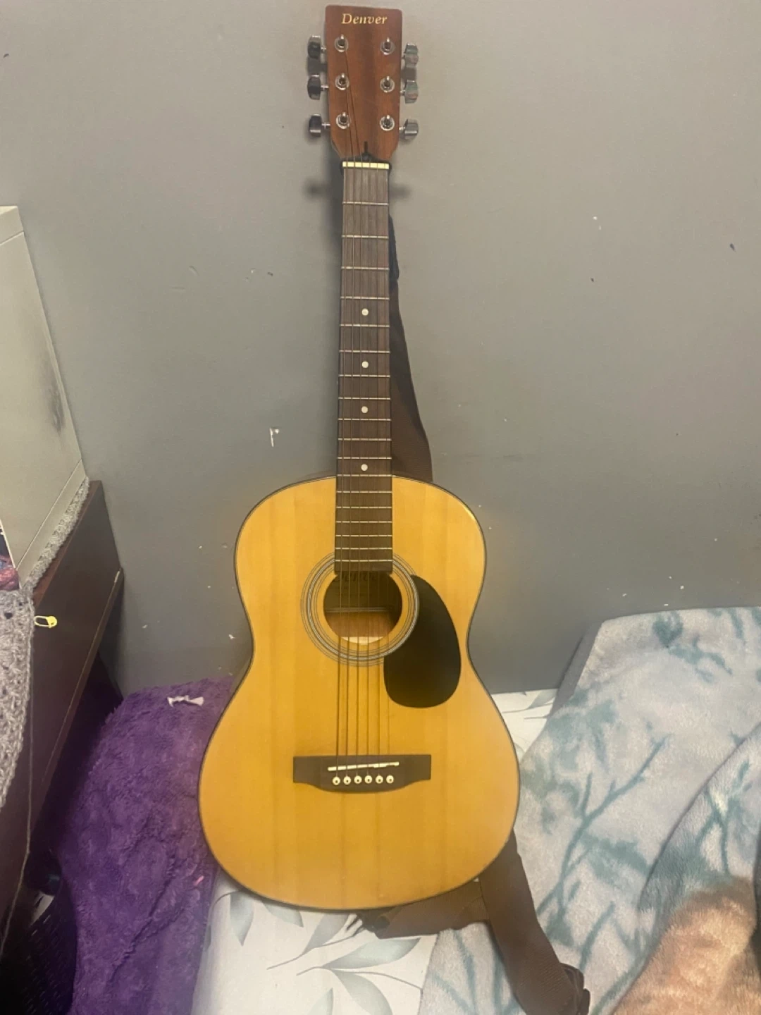 This is a Denver guitar. It has a natural wood finish perfect for beginners or anyone looking for a lightweight instrument to practice with. The guitar is in good condition there are some very unnoticeable scratches at the back as seen in the second picture It comes with a carrying case.