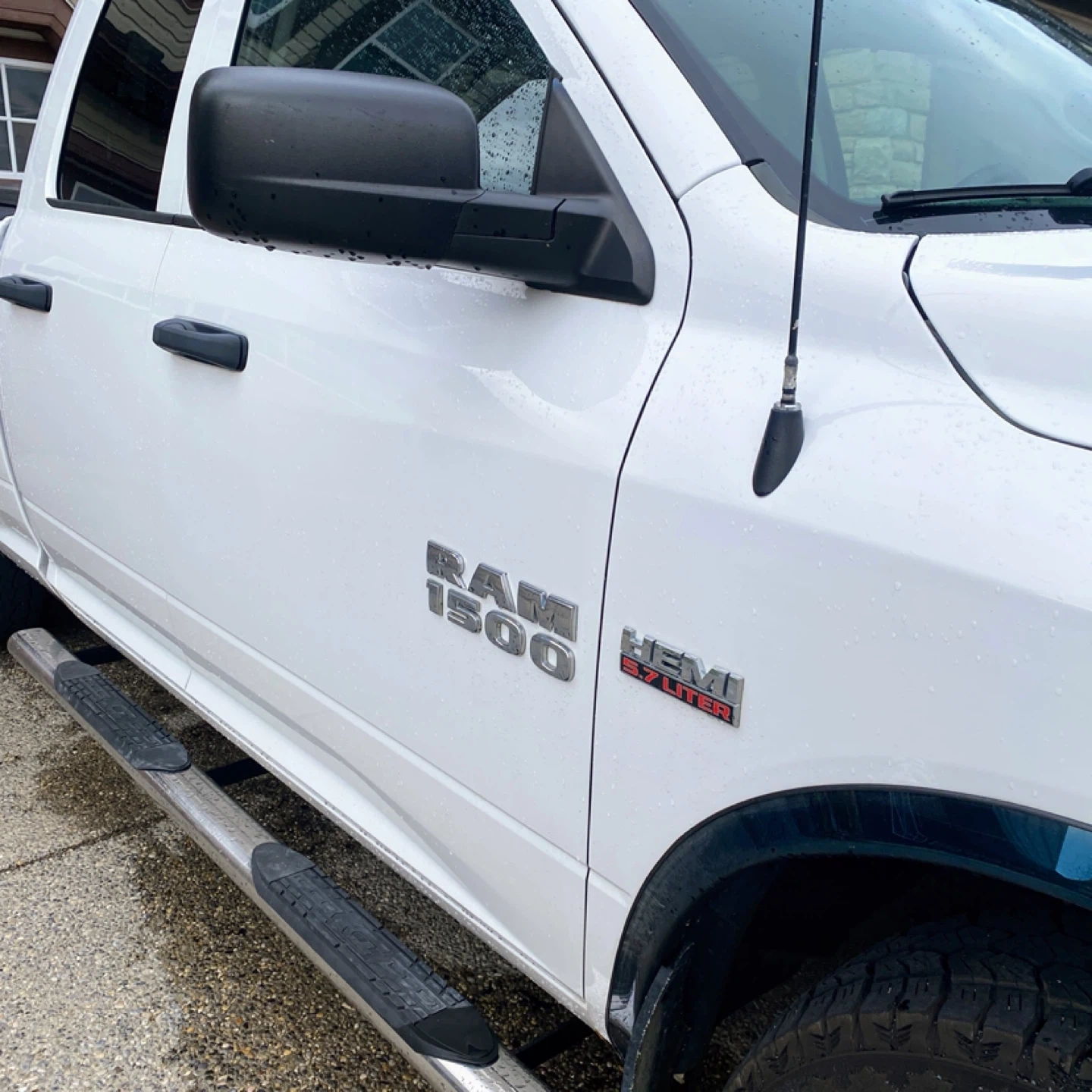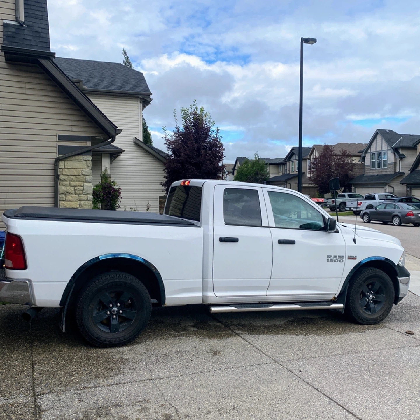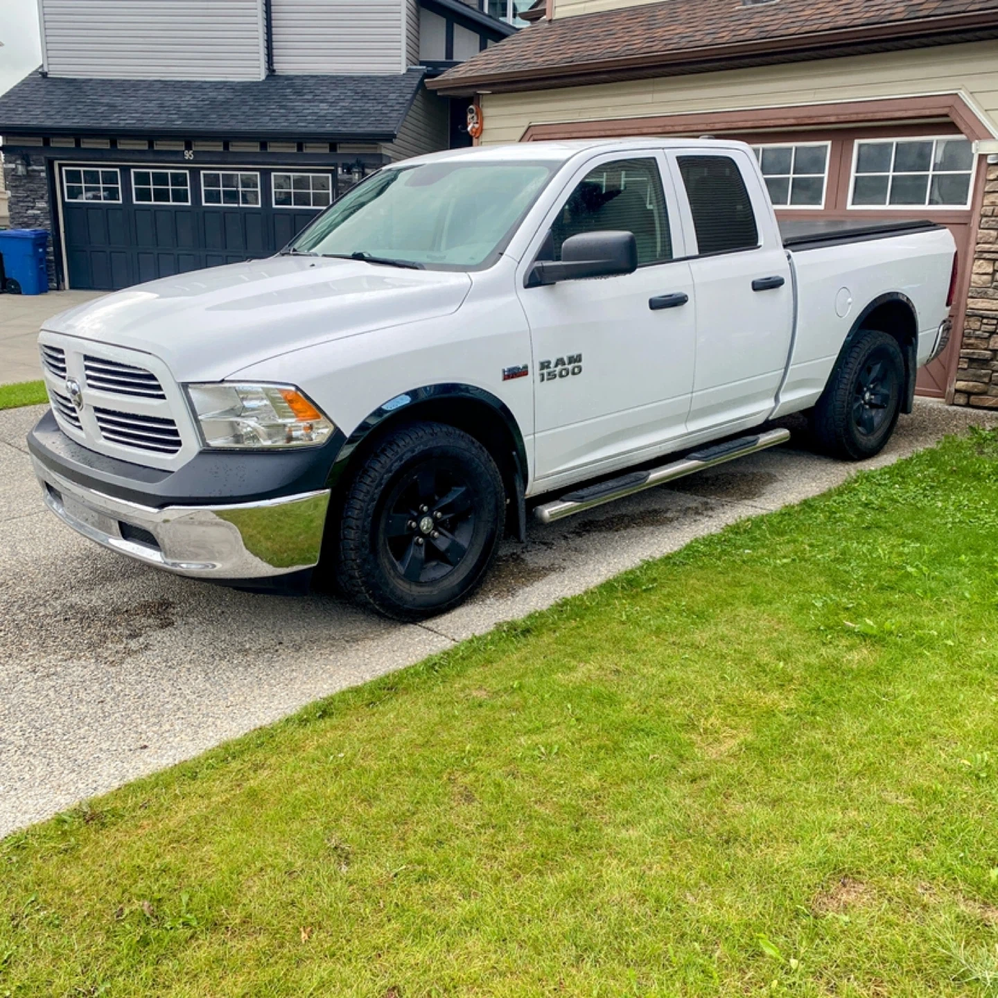 This is a white Dodge Ram 1500 pickup truck. It has a crew cab configuration and a tonneau cover on the bed. Chrome accents on the front bumper and running boards are visible.
