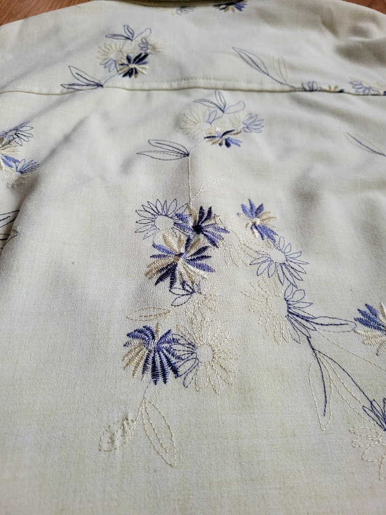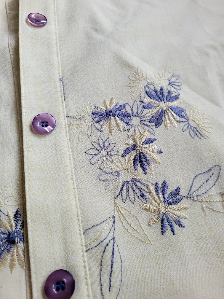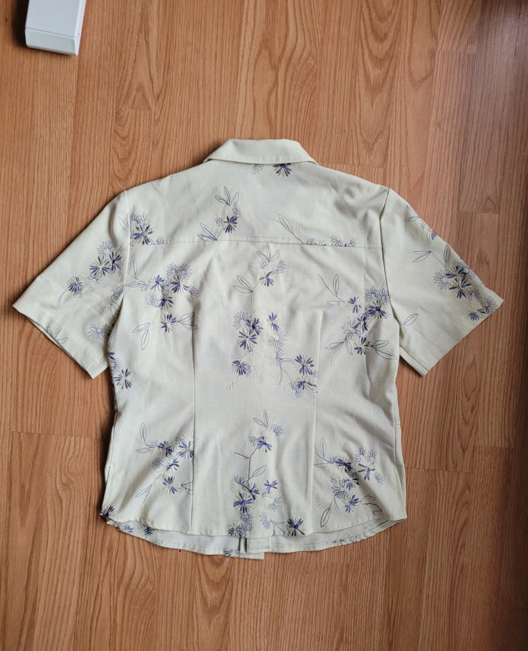 Truly vintage Liz Claiborne short-sleeved button-up shirt. It features a hafted floral pattern in shades of blue and cream on a light green background. The buttons are a matching light purple colour. It's in great condition