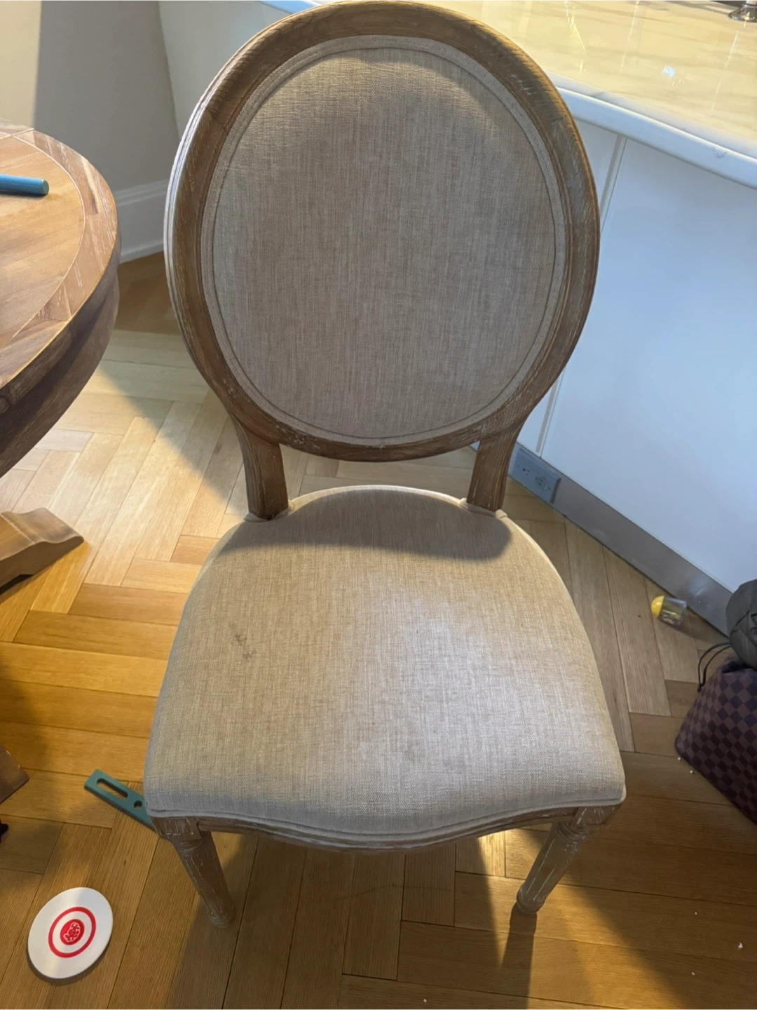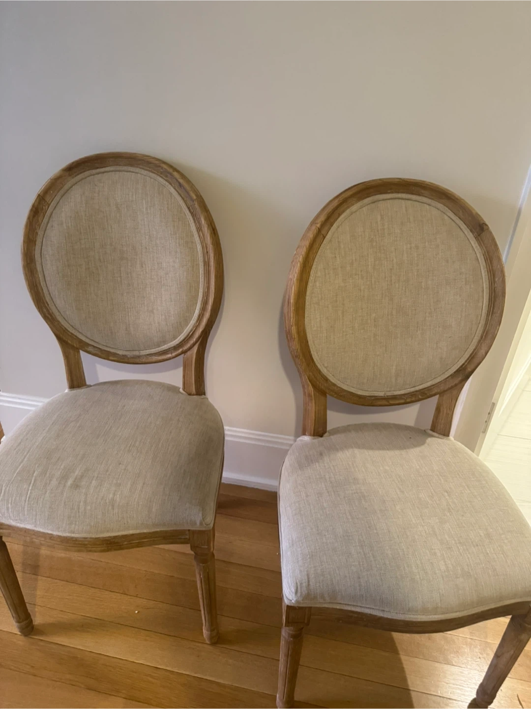 Six upholstered dining chairs with a round back and light beige linen fabric. These chairs feature a distressed wood frame with carved details. They're sturdy and ready for a new home!
