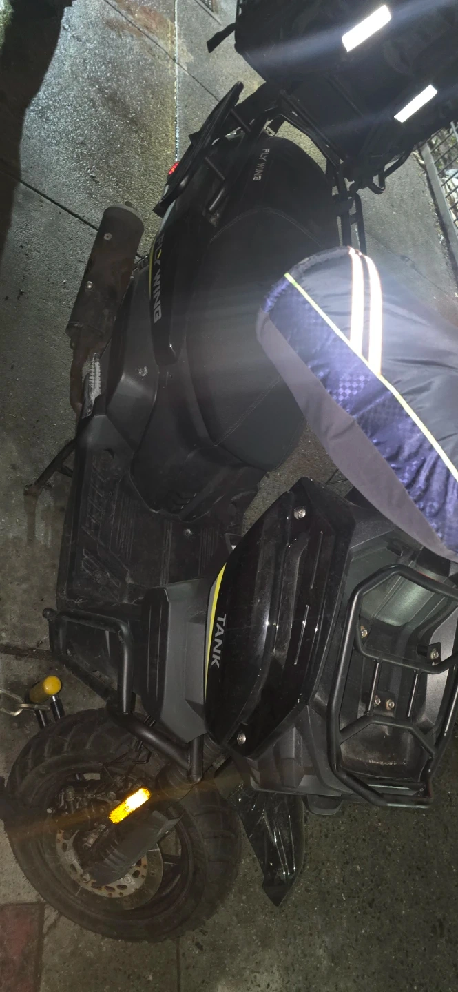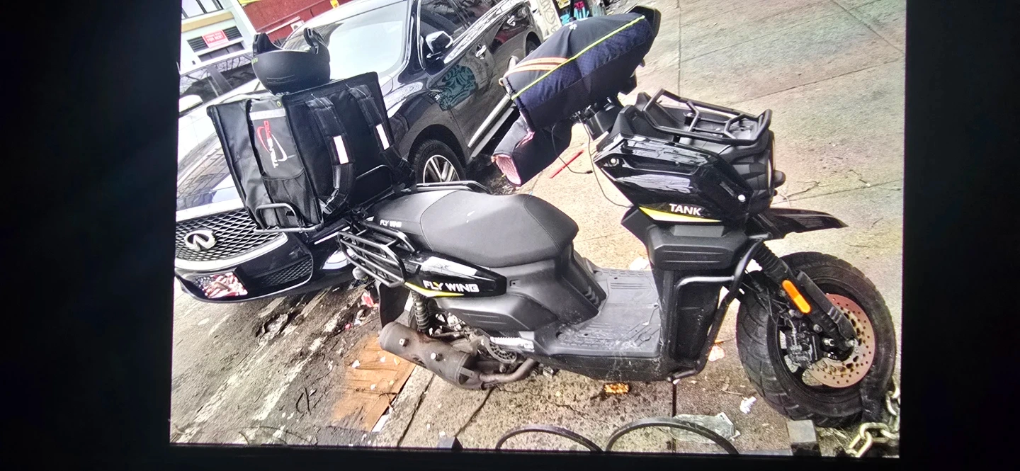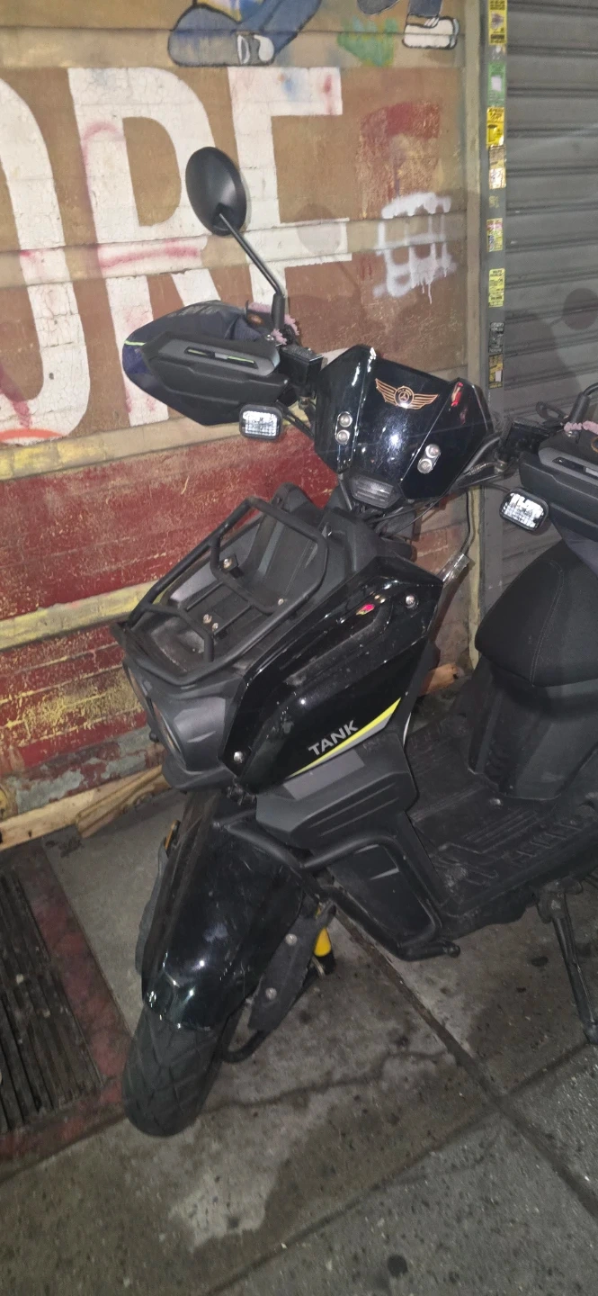 This is a Fly Wing scooter. It's a 'TANK' model designation visible on the body. 150cc The color is black and it includes a black storage bag for Uber dasher ....or any delivery. Thank you