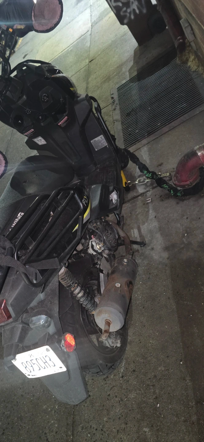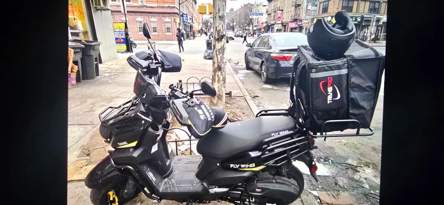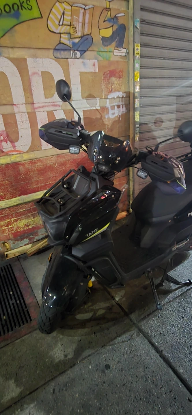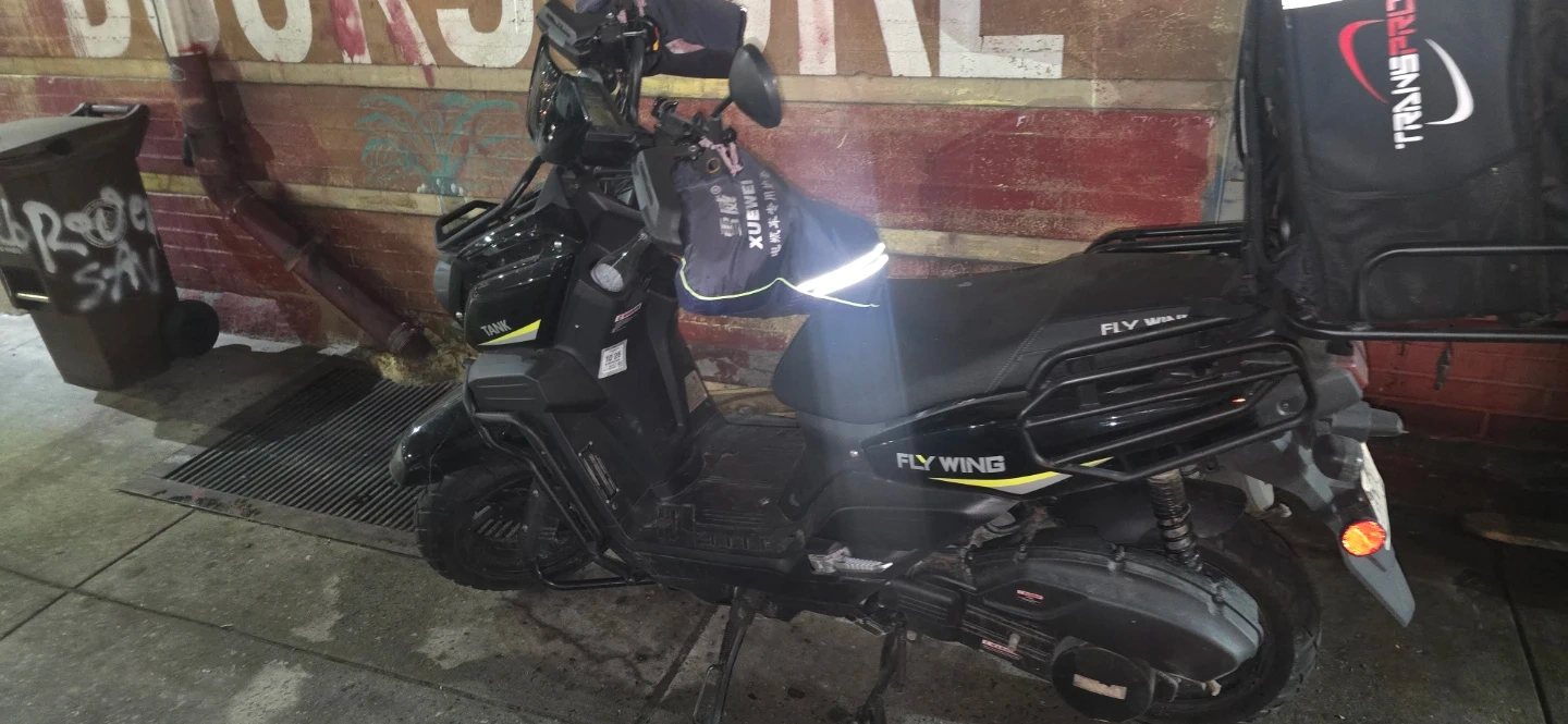 This is a Fly Wing scooter. It's a 'TANK' model designation visible on the body. 150cc The color is black and it includes a black storage bag for Uber dasher ....or any delivery. Thank you