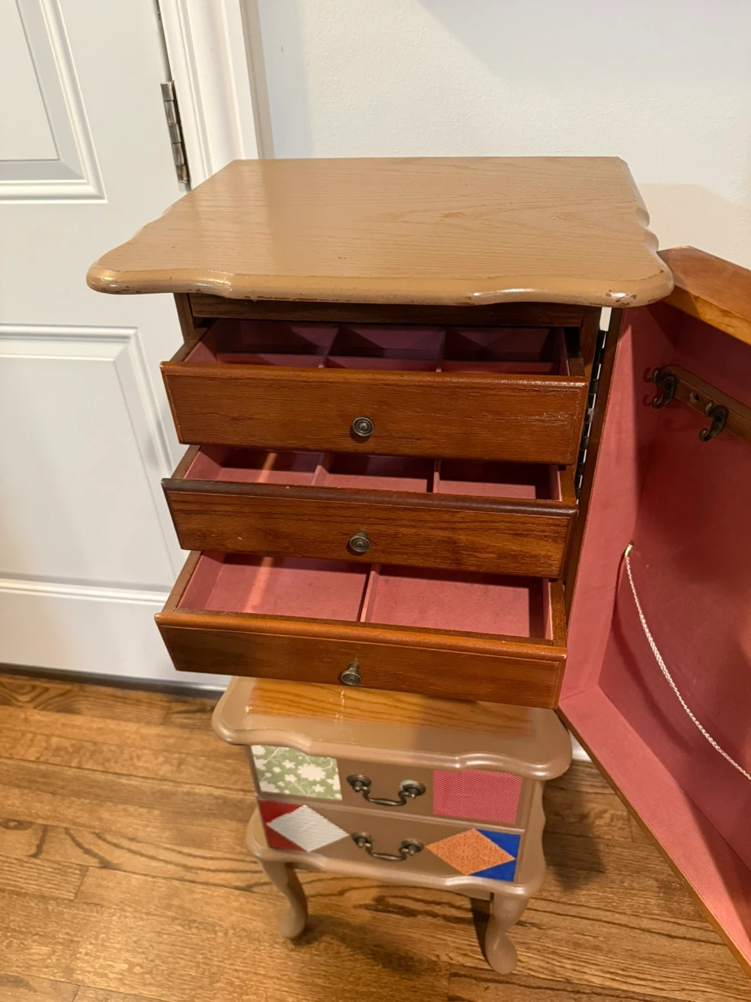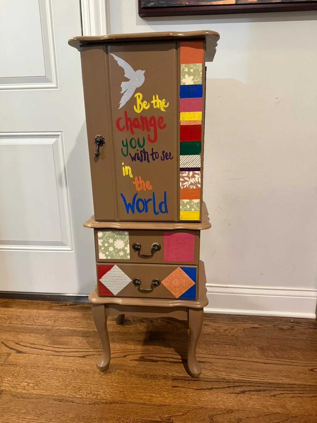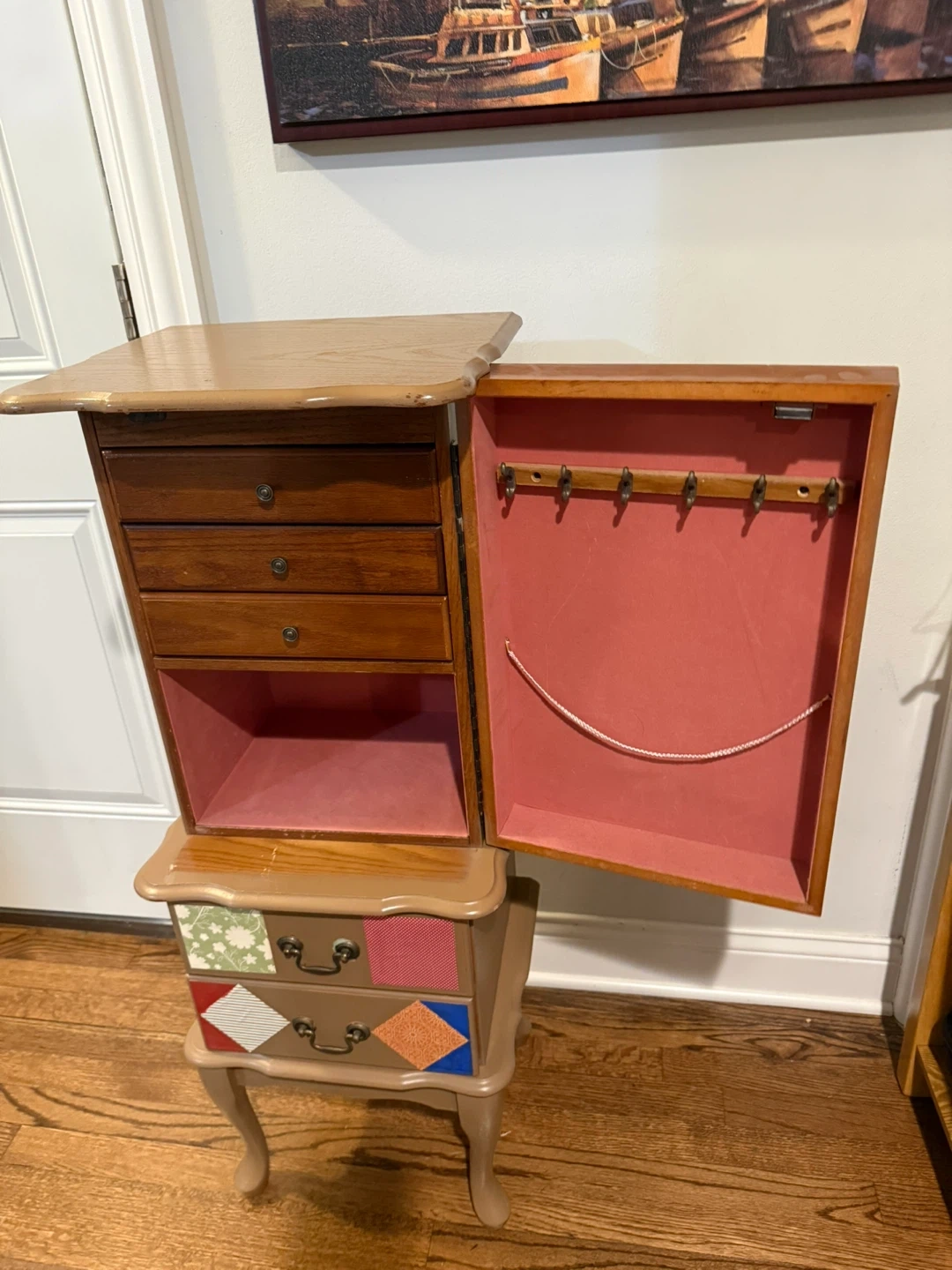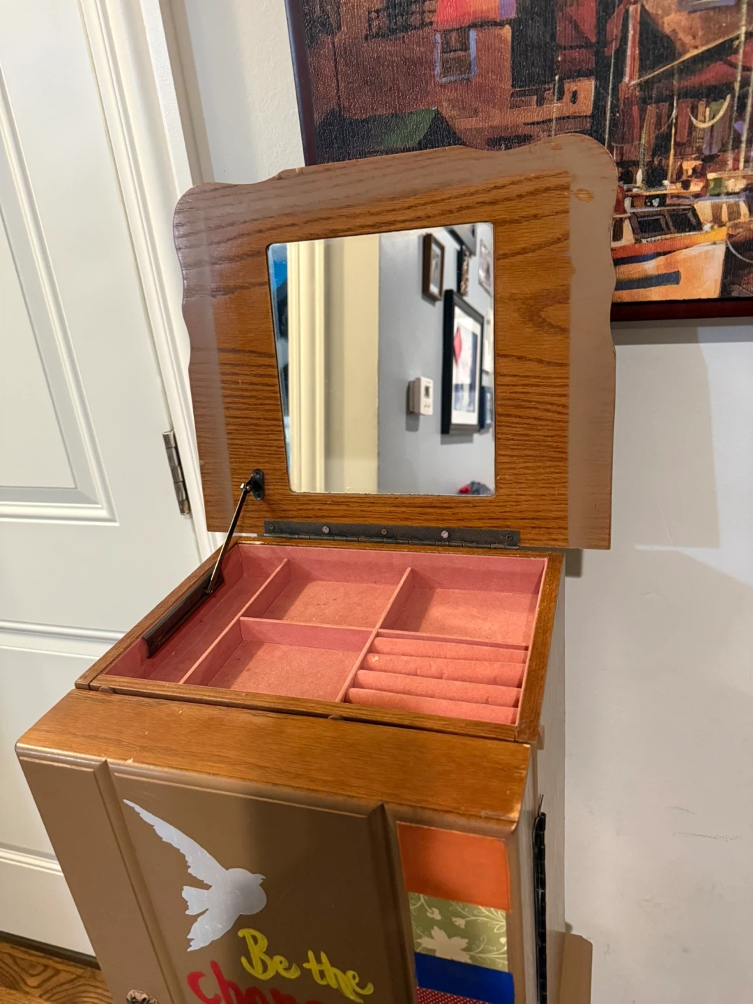 This wooden jewelry box has a mirrored lid and multiple compartments for organizing your treasures. It features three drawers on the front, plus a mirrored section inside with hooks for necklaces. The exterior has a decorative quote and colorful patchwork accents.