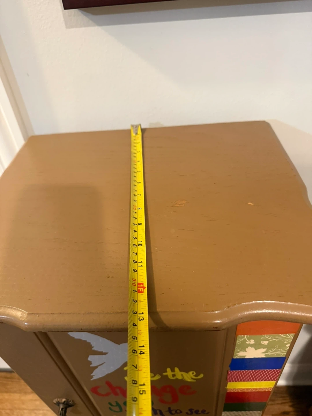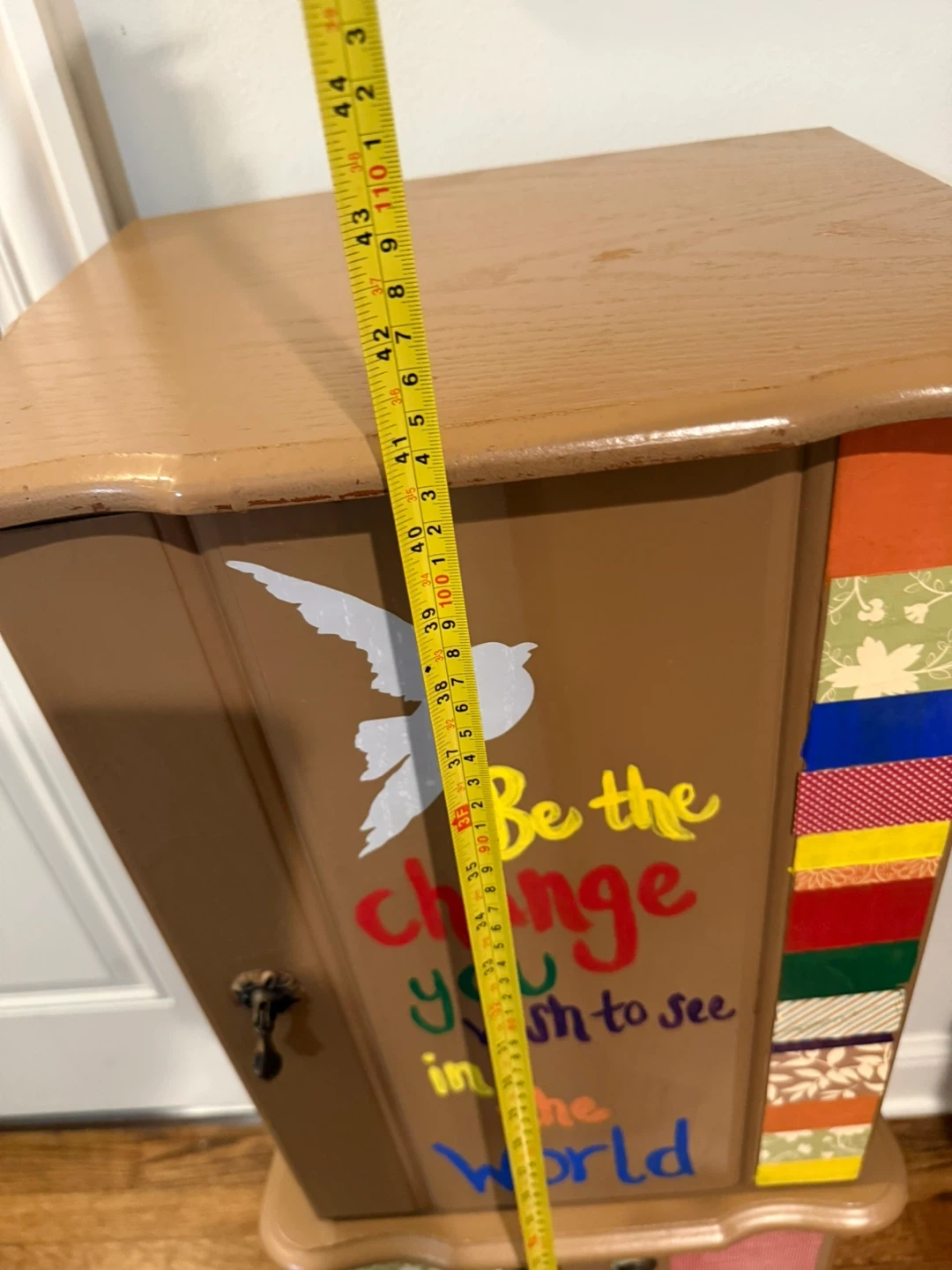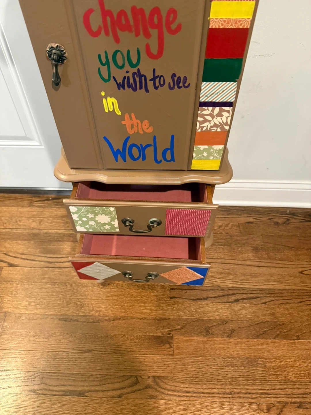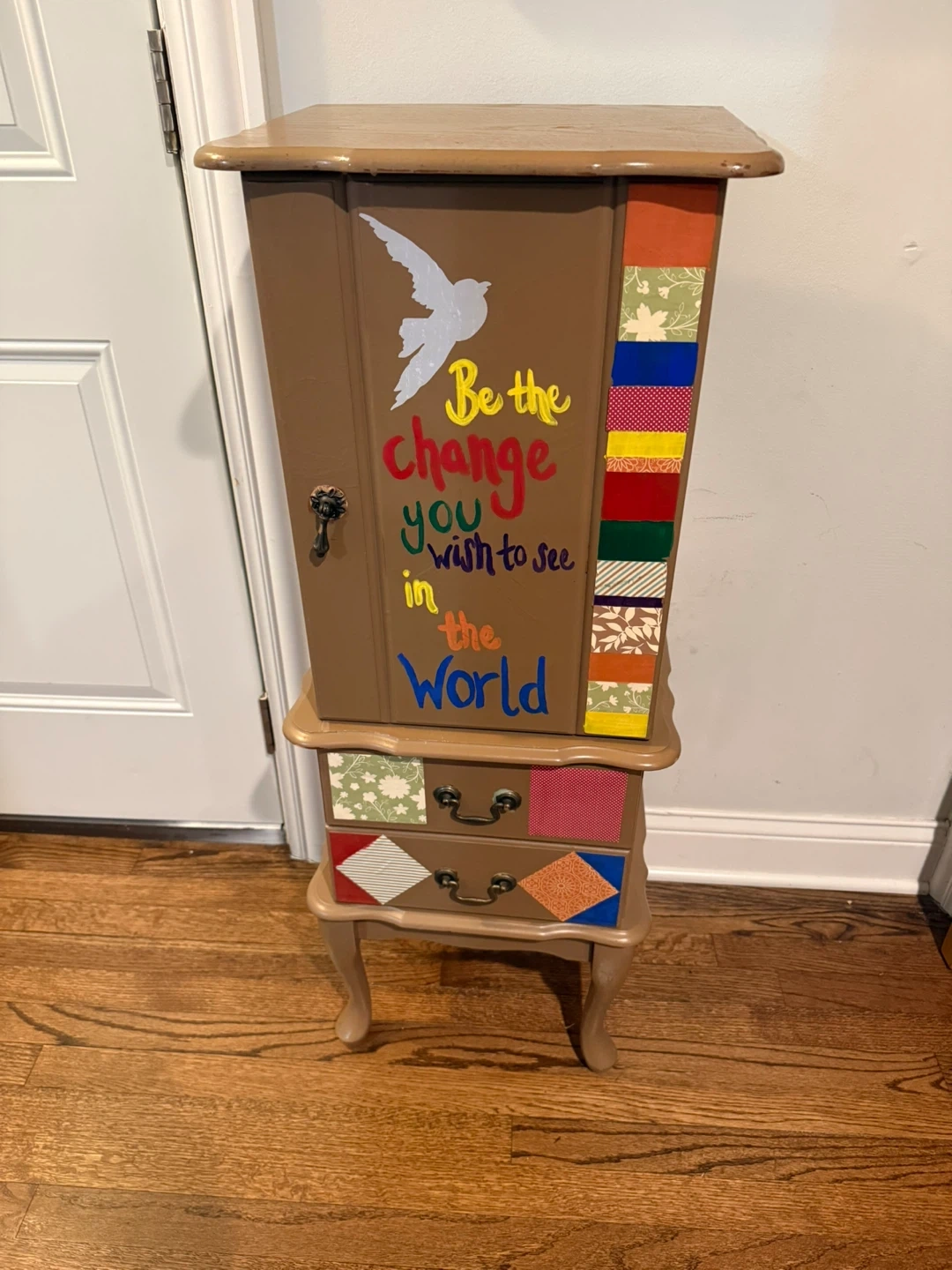 This wooden jewelry box has a mirrored lid and multiple compartments for organizing your treasures. It features three drawers on the front, plus a mirrored section inside with hooks for necklaces. The exterior has a decorative quote and colorful patchwork accents.