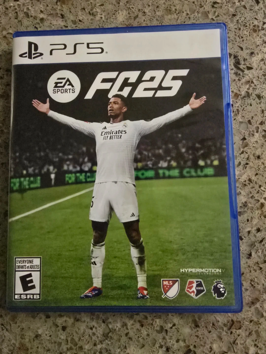 This is the EA Sports FC 25 video game for the PlayStation 5. It's rated E for Everyone by ESRB. The game features Hypermotion V technology.