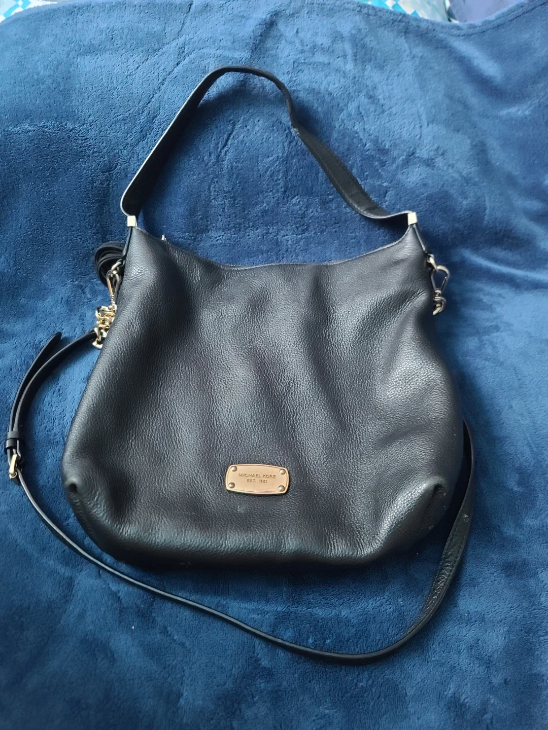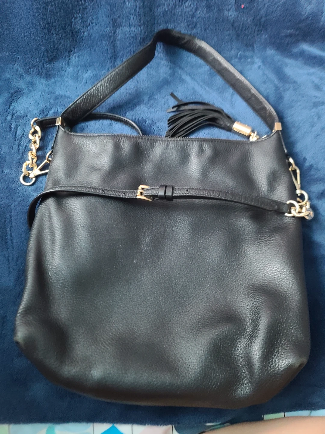 This is a black leather shoulder/ cross body bag from Michael Kors. It features gold-tone hardware and a tassel detail. The bag has two straps, one shorter shoulder strap and one longer adjustable crossbody strap.