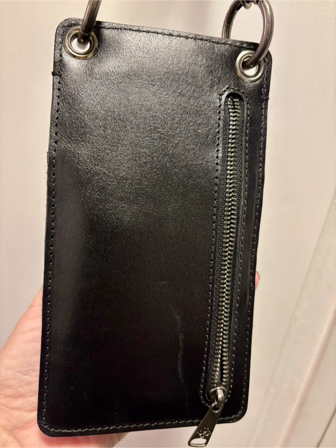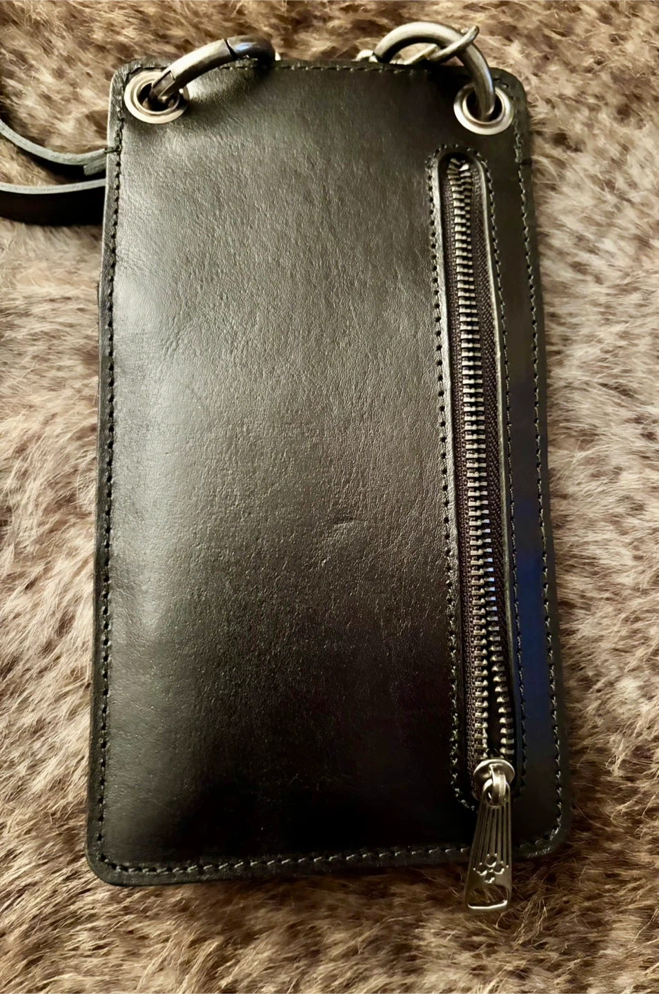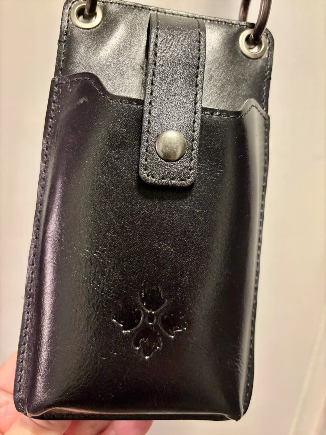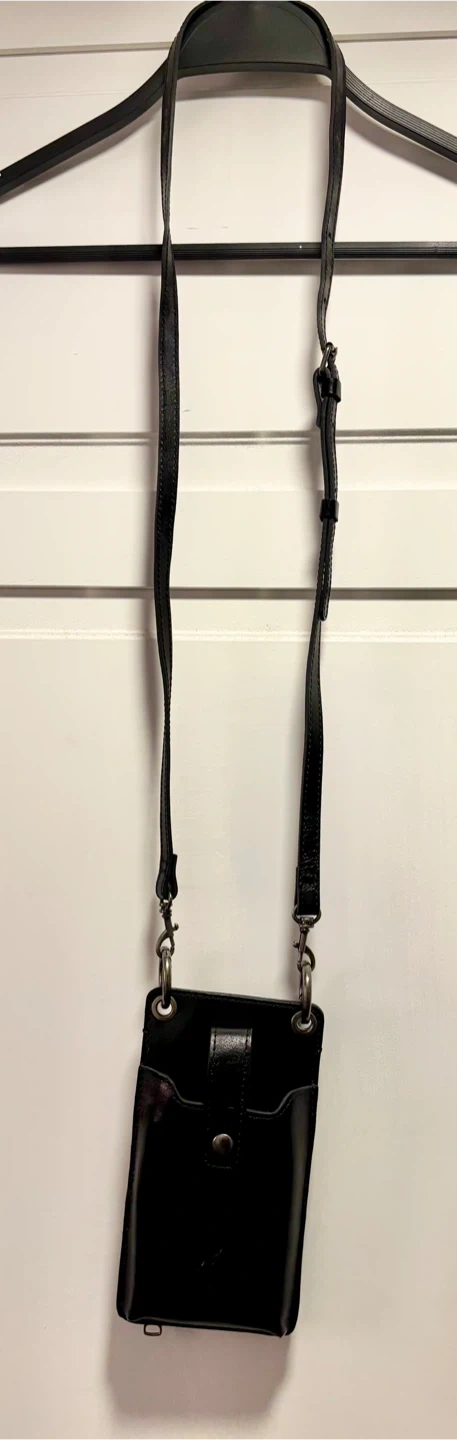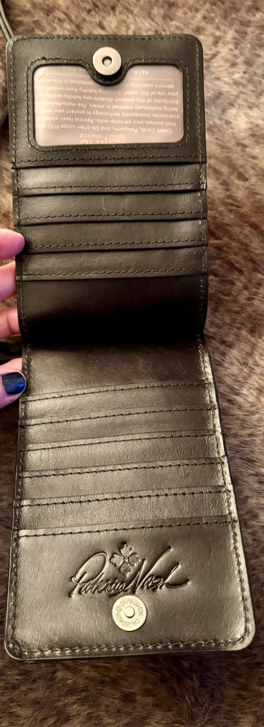 New Patricia Nash Farleigh crossbody wallet cell phone holder. It's made of heritage leather and features multiple card slots and a zippered pocket. The wallet has a snap closure and a removable crossbody strap.