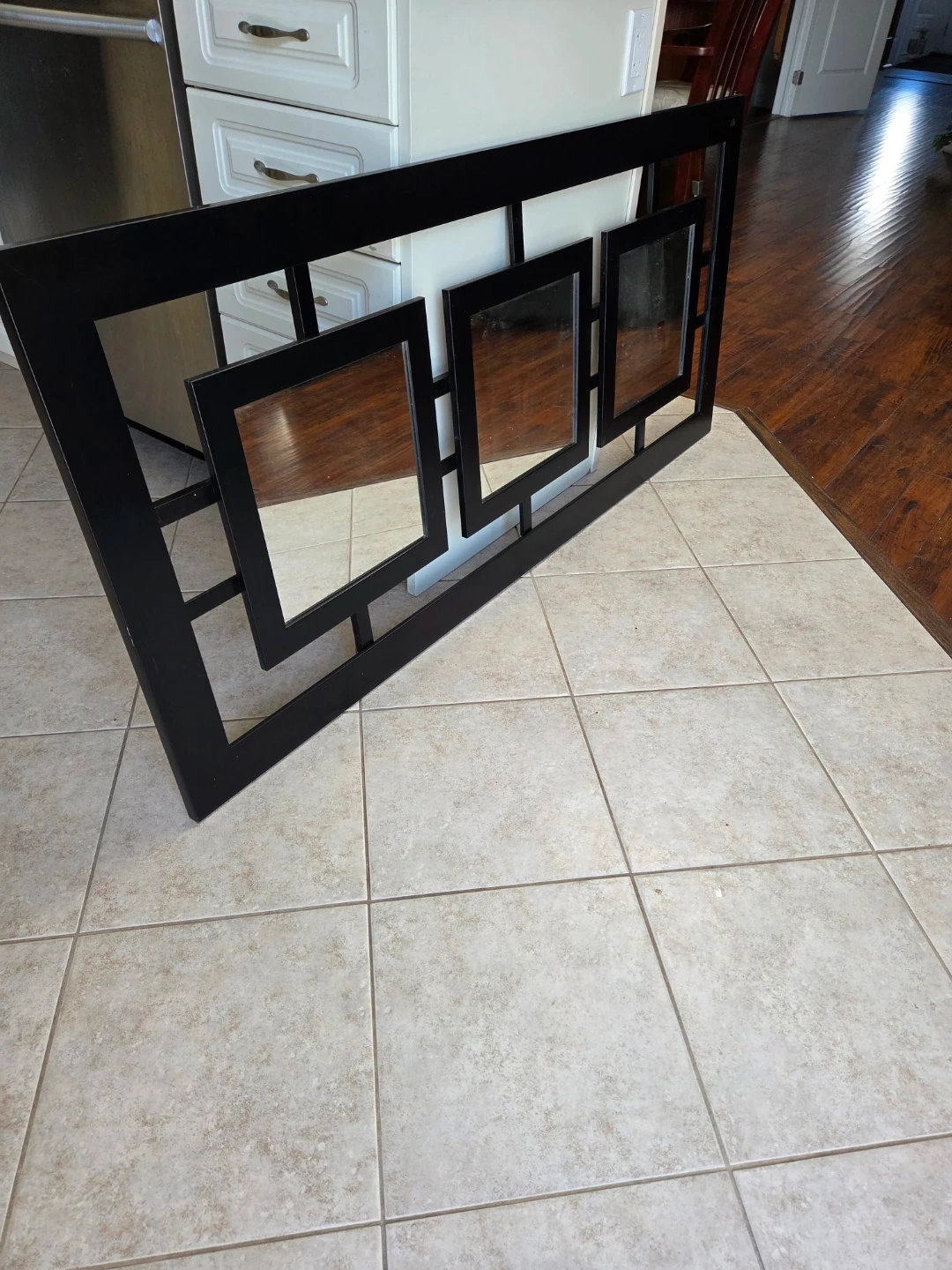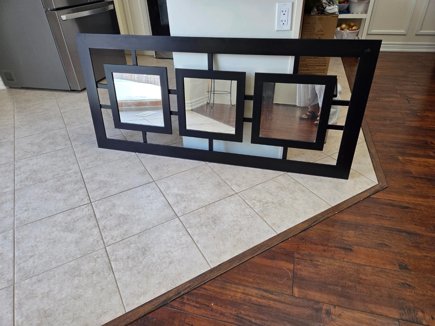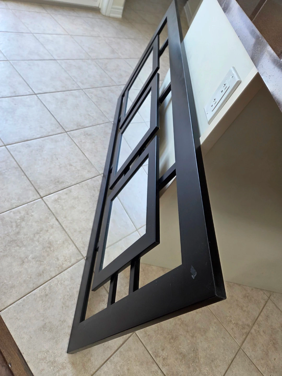 This is a black wall framed mirror with three square panels. It's designed with an interesting geometric pattern. The frame has a black finish.