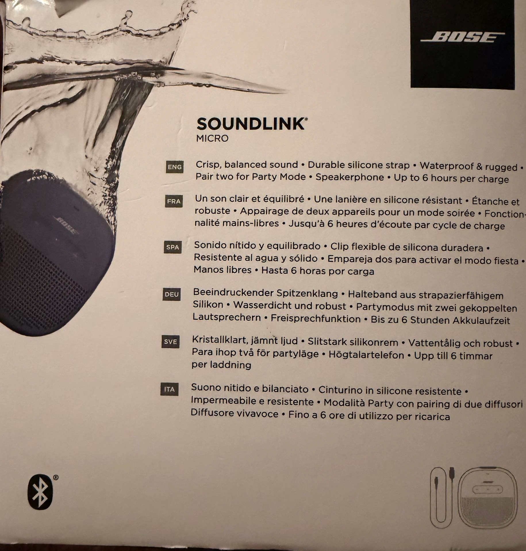 Small but powerful, the Bose SoundLink Micro Bluetooth speaker produces loud, clear sound with shockingly deep bass. It packs a custom-designed transducer and passive radiators for crisp, balanced sound. This small portable speaker comes equipped with an easy-to-use, tear-resistant silicone strap. Secure it to your backpack, beach cooler, or handlebars, and the reliable strap will hold tight through shocks and shakes. Constructed from durable materials, including a rubberized silicone exterior, SoundLink Micro resists drops, dents, cracks, and scratches. Plus, its soft-touch finish almost never shows a mark. The SoundLink Micro Bluetooth speaker has been rigorously tested to meet an IP67 rating. It’s waterproof, dustproof, and protected from extreme temperatures, liquids, and other substances. Enjoy up to 6 hours of music and charge anytime via the included Micro-USB cable.