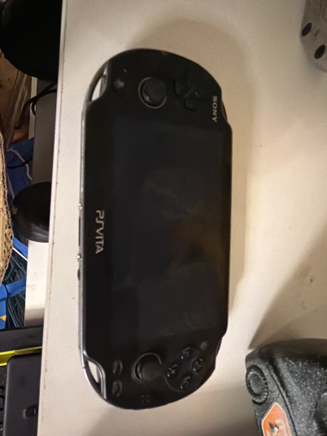 This is a Sony PS Vita handheld game console. It's black and comes with all the standard controls. Perfect for gaming on the go! Comes with charging. Cable