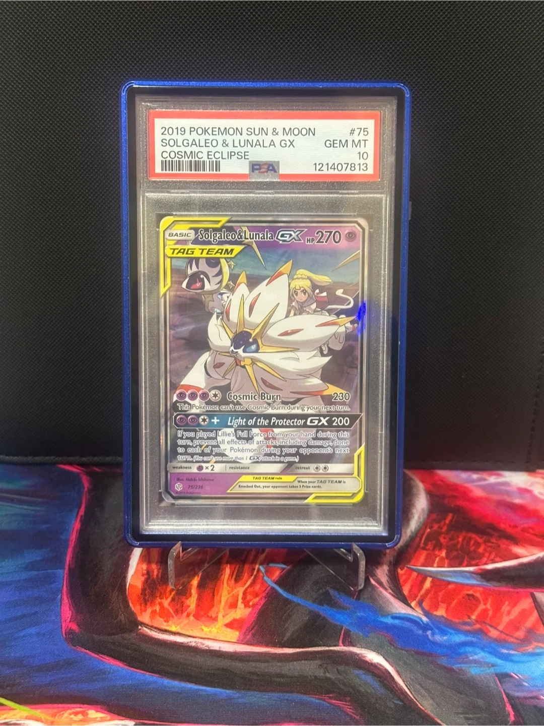 This is a 2019 Pokemon Sun & Moon Solgaleo & Lunala GX Tag Team card. It's from the Cosmic Eclipse set and has a Gem Mint 10 rating from PSA. The card number is #75.