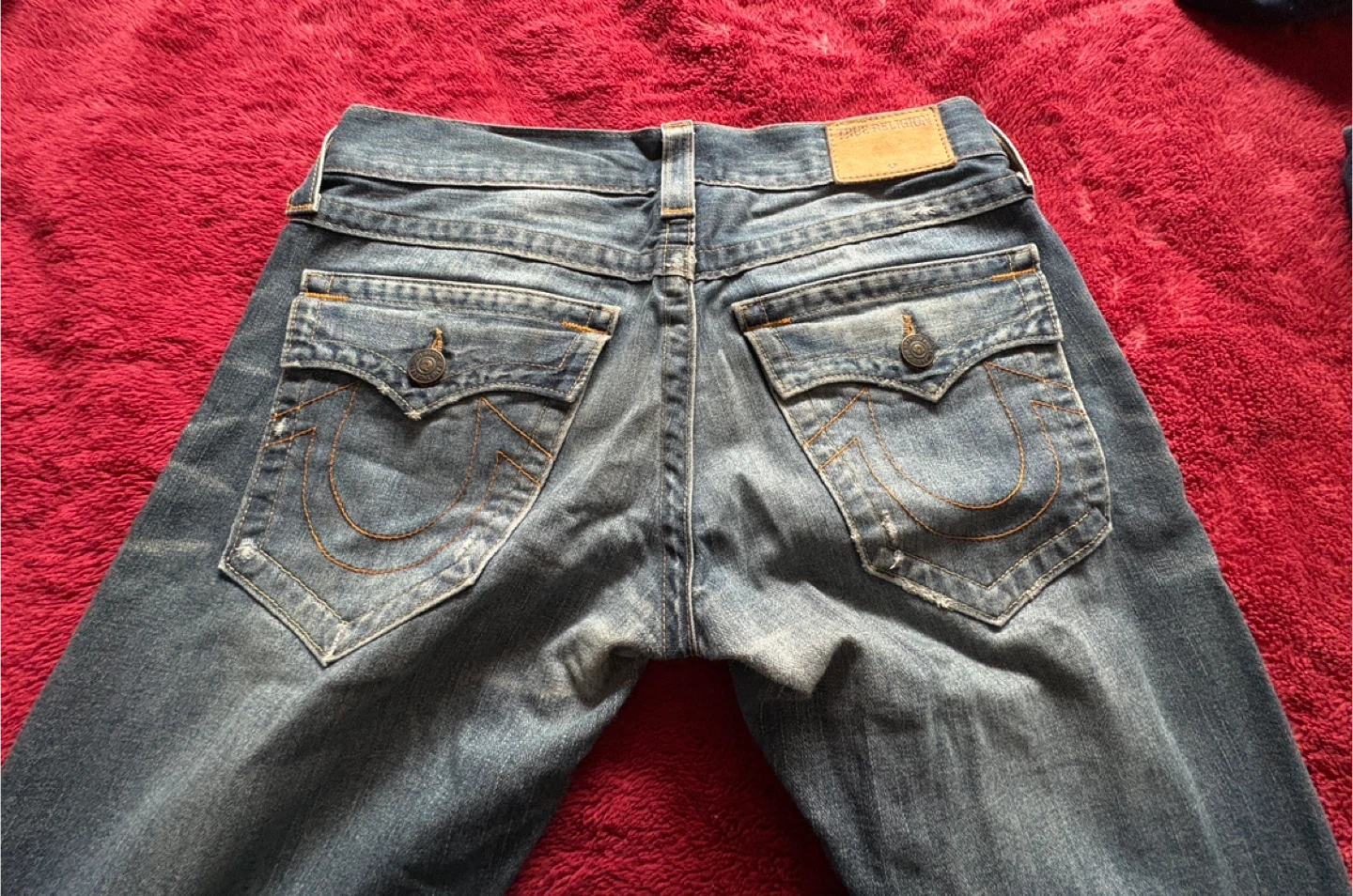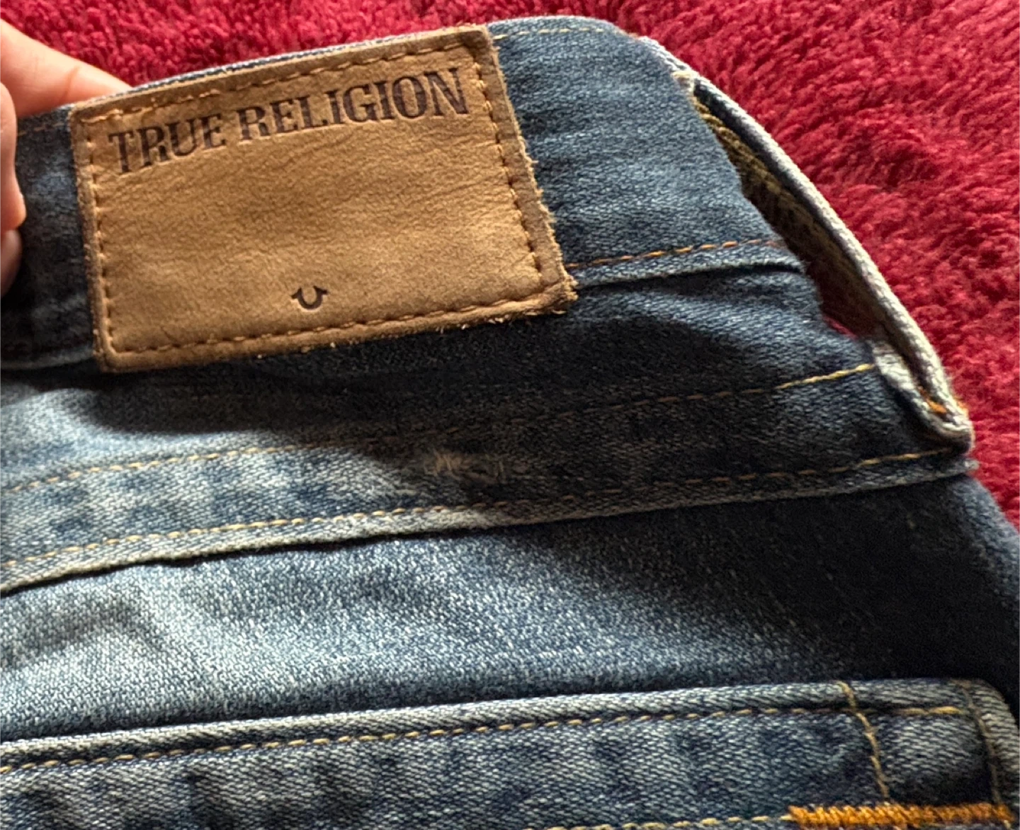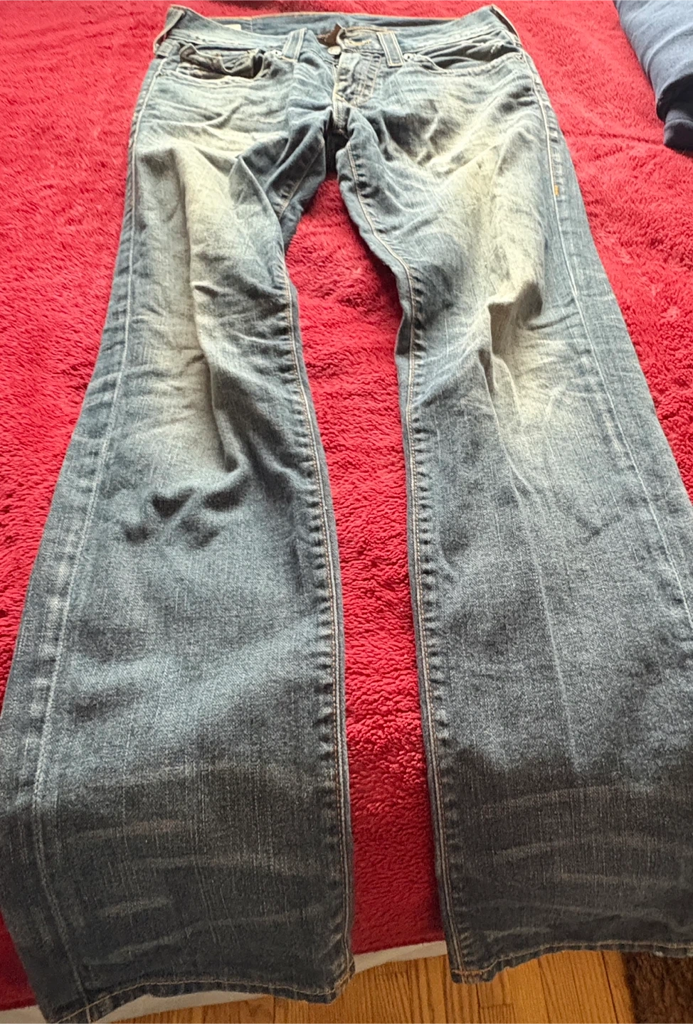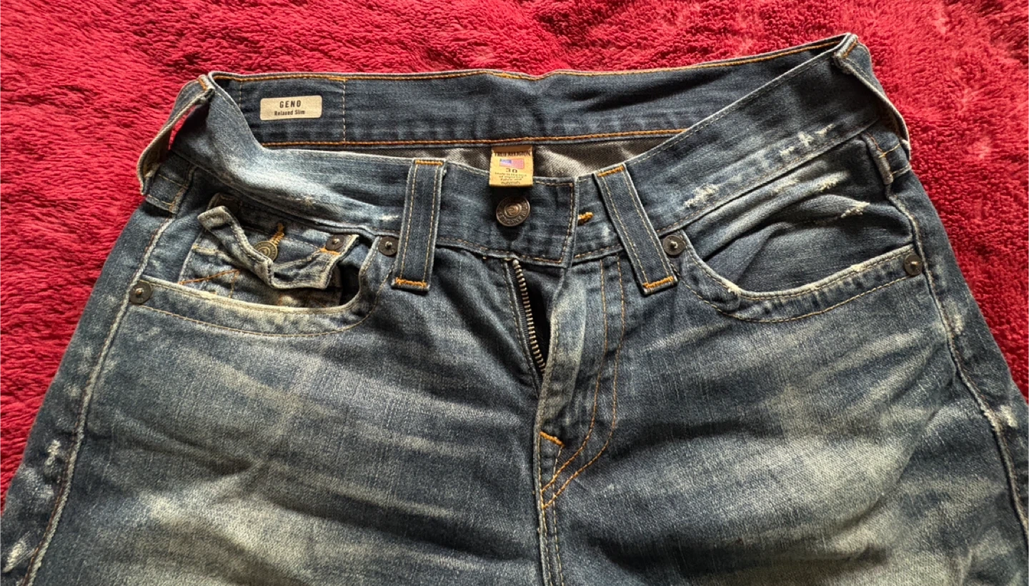 Blue denim jeans by True Religion. These are the "Geno" Relaxed Slim fit. Made with a blend of cotton and elastane for comfort.