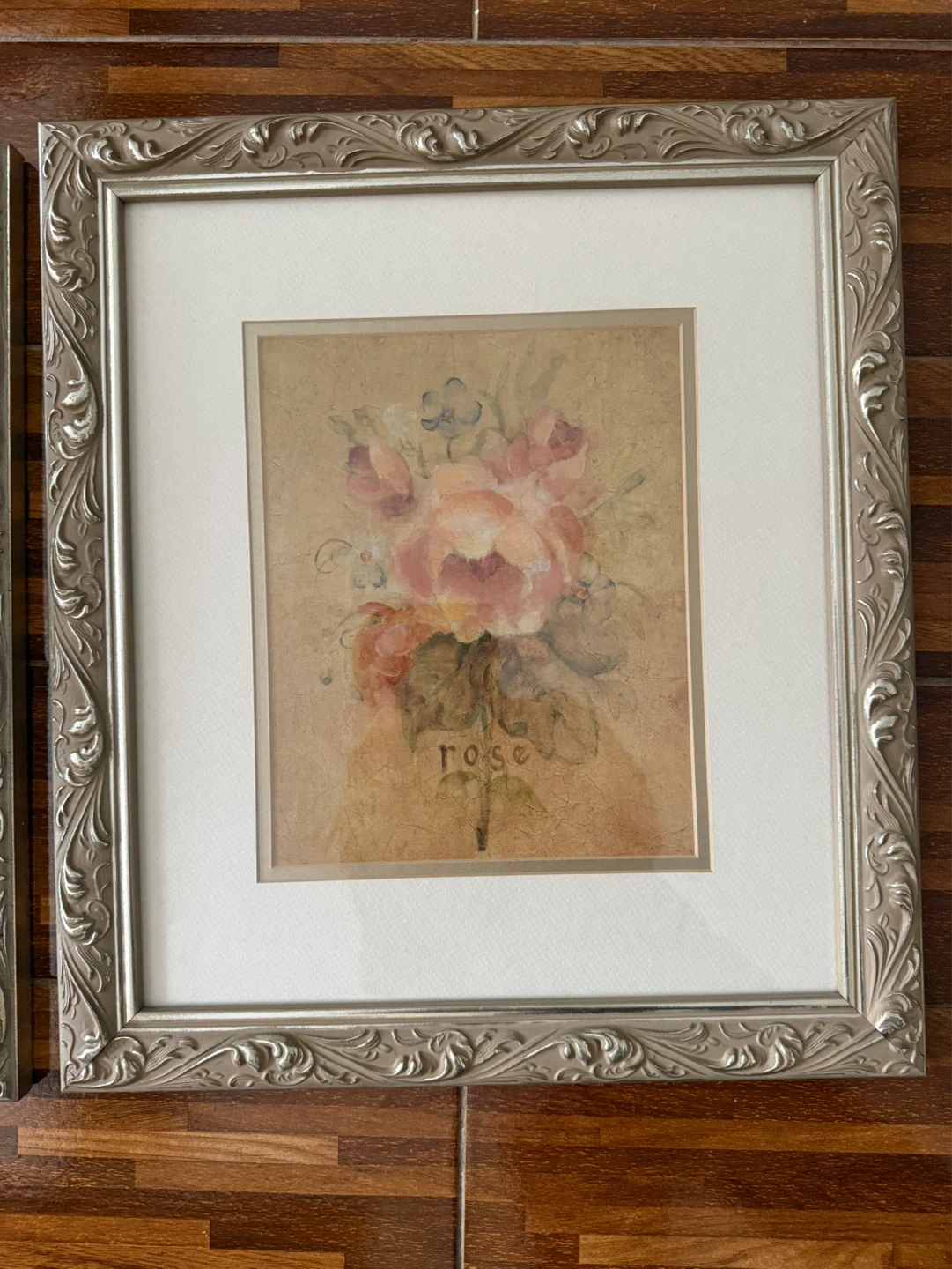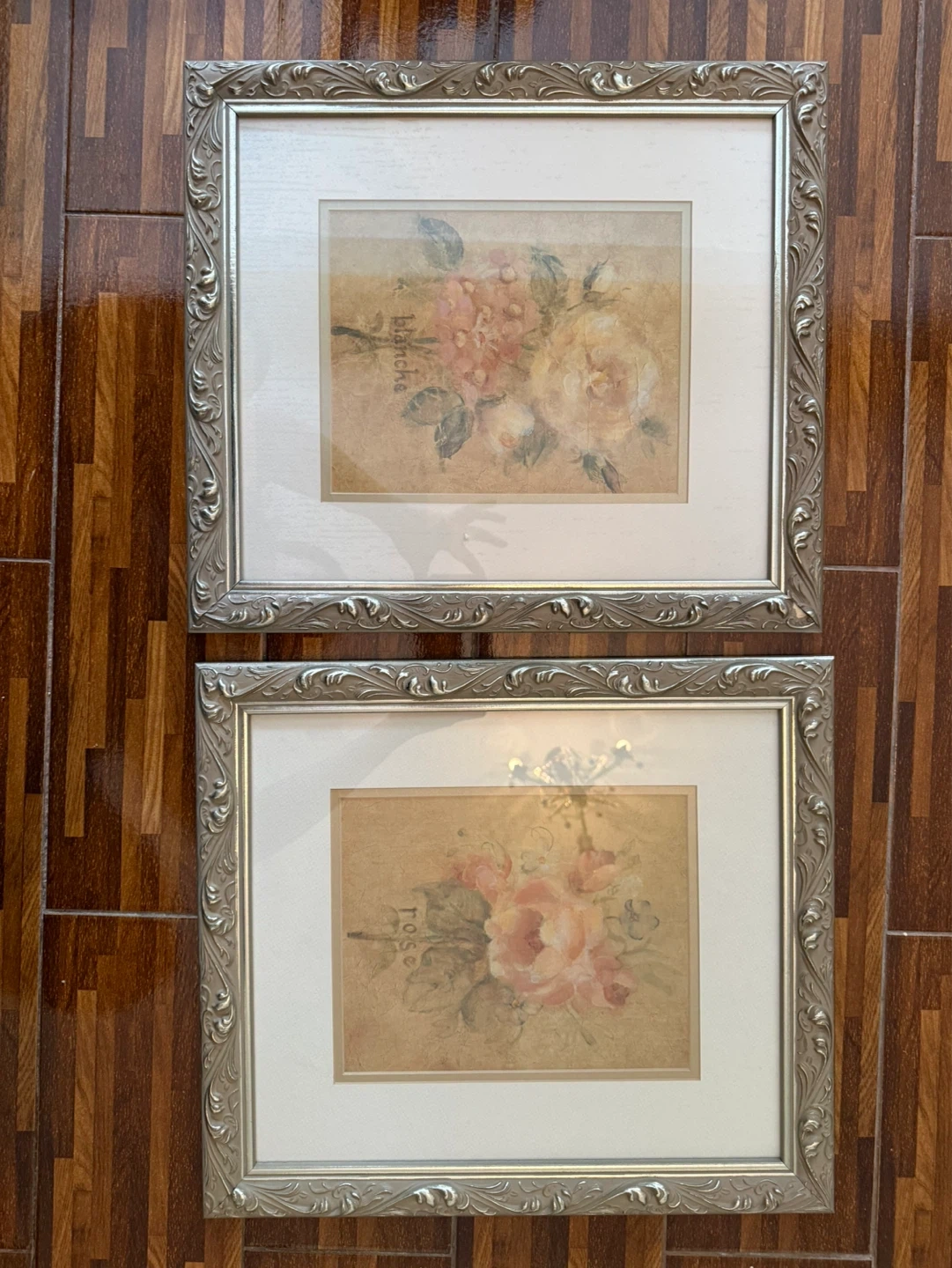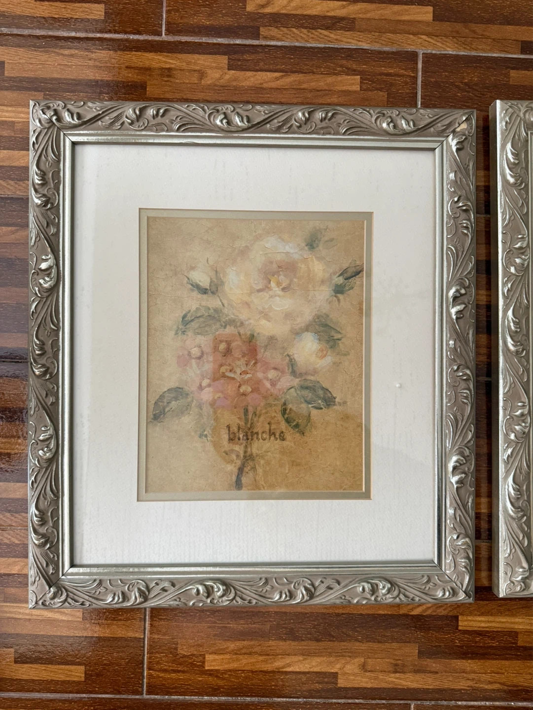 Charming set of two vintage framed prints featuring floral artwork. One print is titled 'Blanche' and the other 'Rose'. They're housed in ornate, silver-toned frames. Perfect for adding a touch of classic beauty to any room!