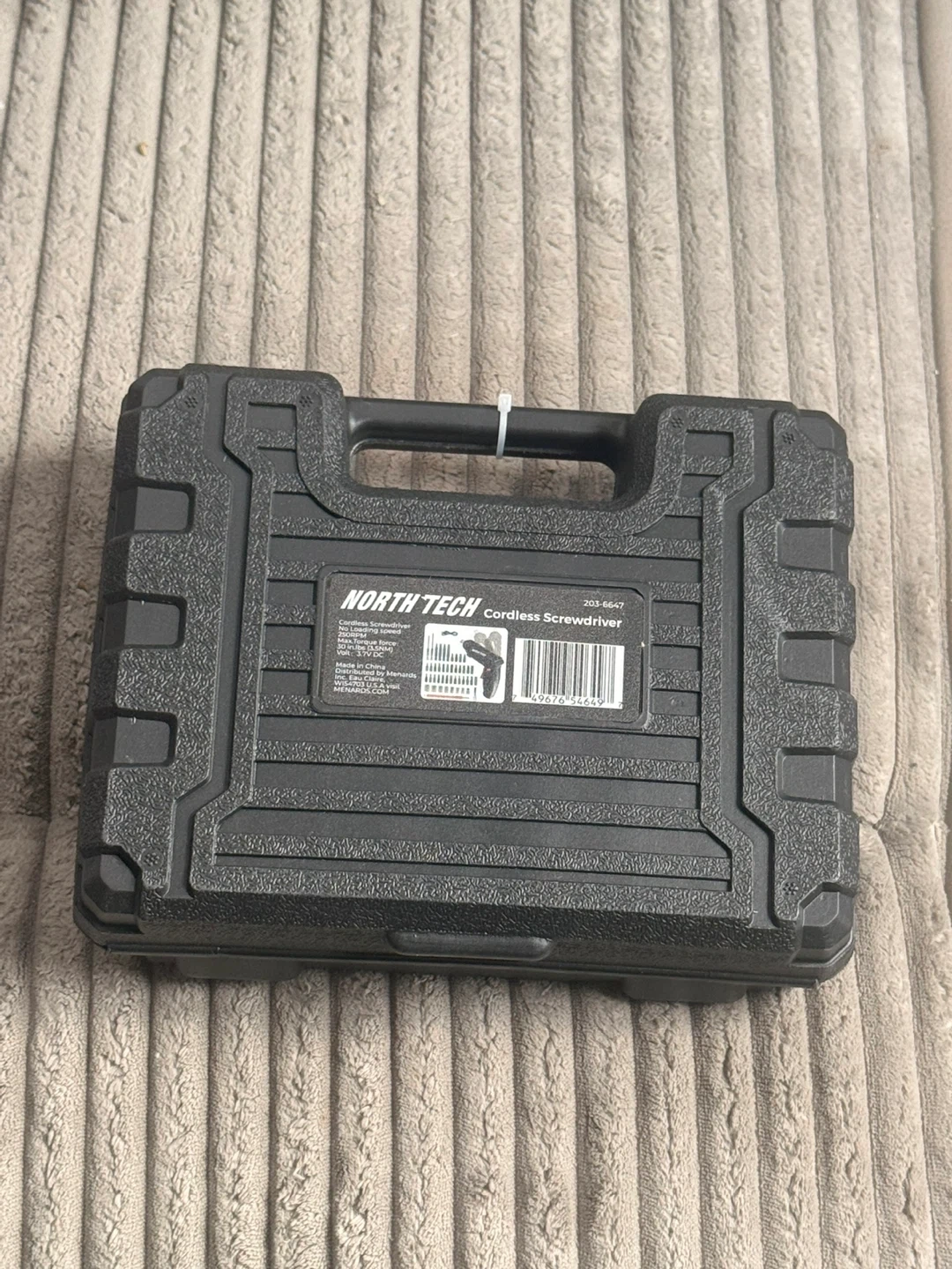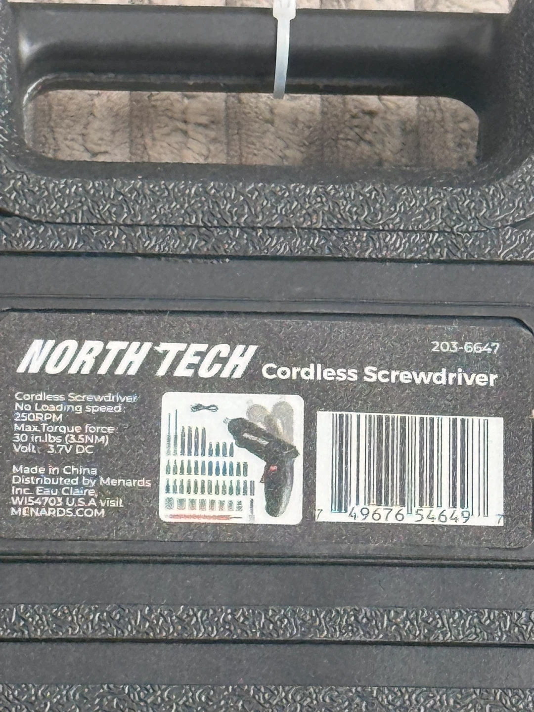 This is a North Tech cordless screwdriver. It has a no-loading speed of 200 RPM and a max torque force of 30 in-lbs (3.5 Nm). The voltage is 3.7V DC. This set includes various bits for different tasks.