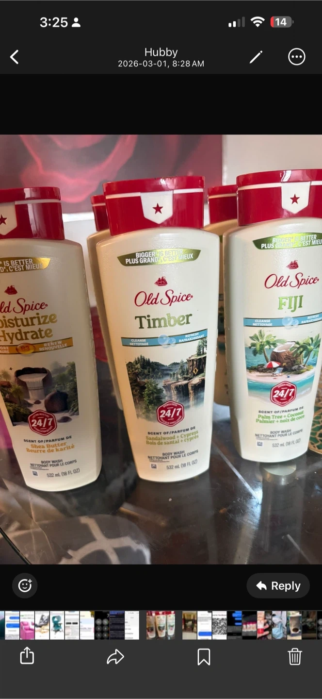 Old Spice body wash in three scents: Moisturize Hydrate with Shea Butter, Timber with Sandalwood + Cypress, and Fiji with Palm Tree + Coconut. Each bottle contains 532 ml (18 FL OZ). They're designed for cleansing and refreshing the body.