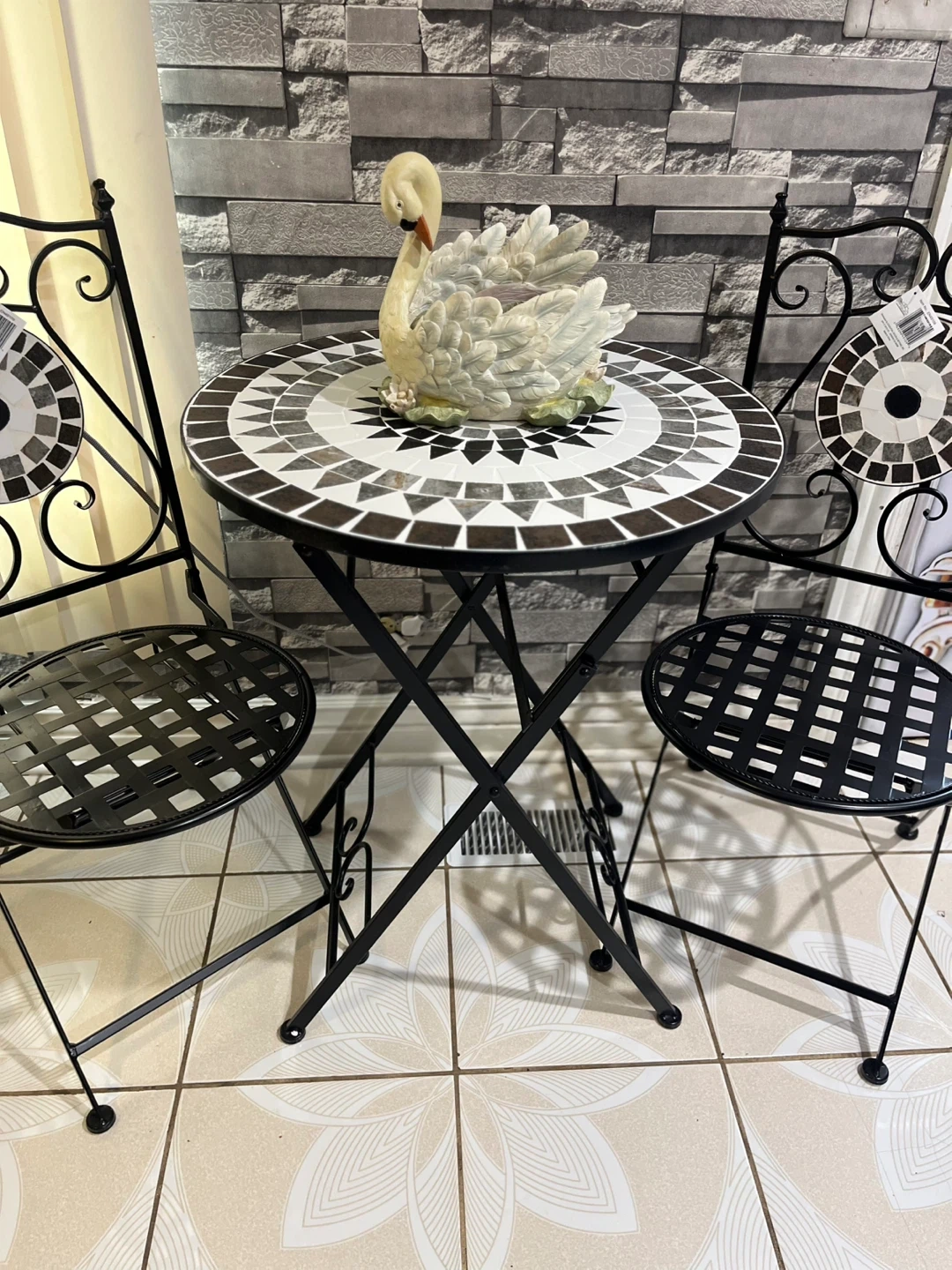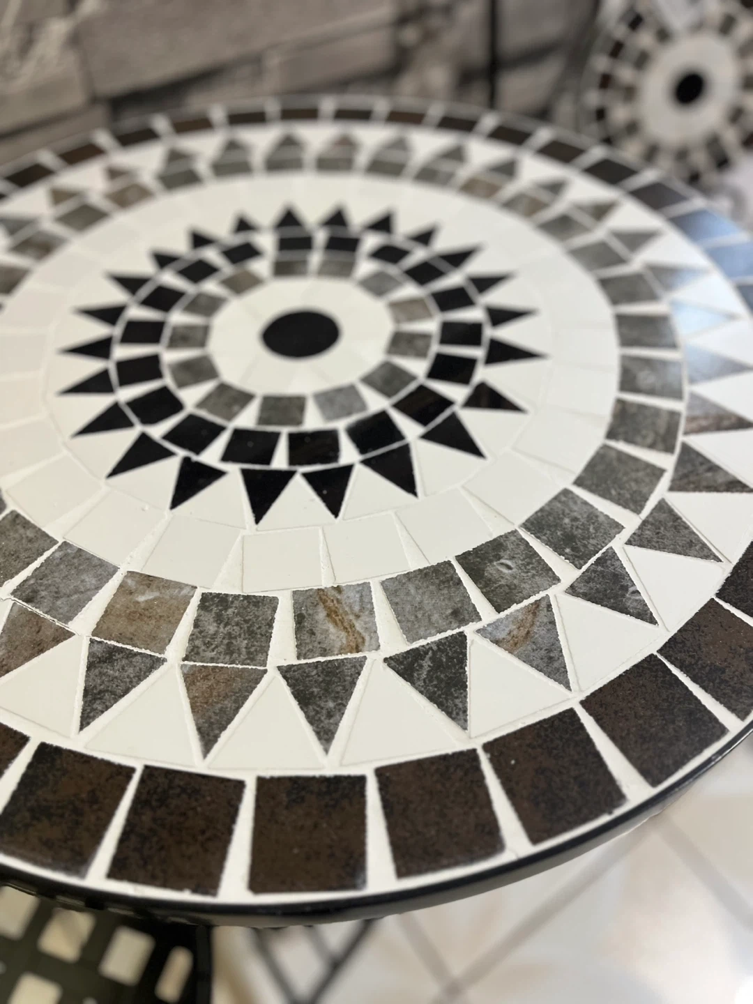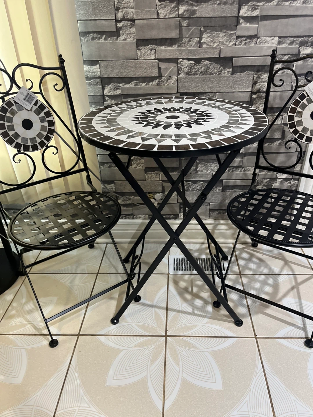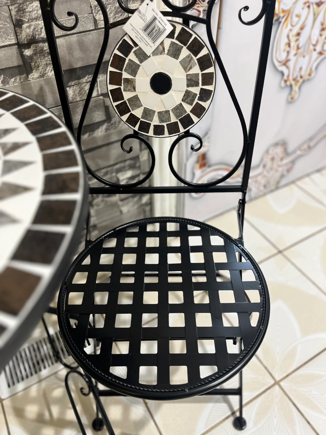 This bistro set features a round mosaic table and two chairs. The table has a decorative mosaic pattern in shades of black, white, and brown. Chairs have a black metal frame with a woven seat. It's perfect for outdoor seating or a cozy patio corner!