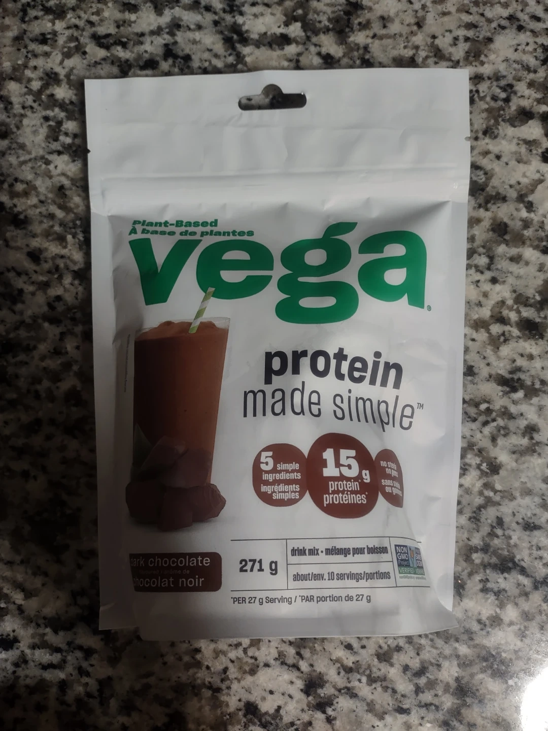 Selling a bag of Vega Plant-Based Protein Made Simple in Dark Chocolate flavour. It's a drink mix with about 10 servings per bag. The best before date is August 2026, so you have plenty of time to enjoy it!