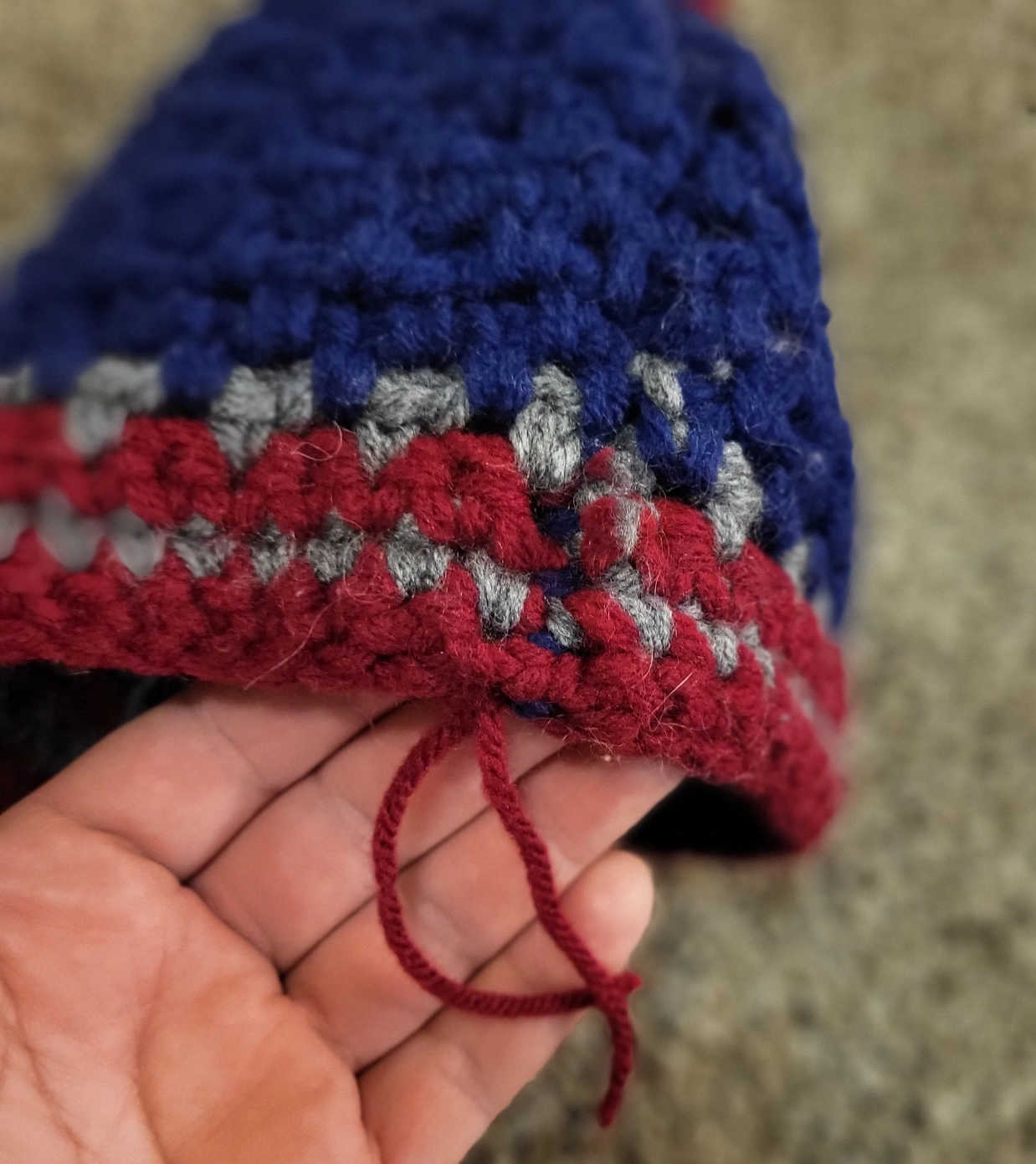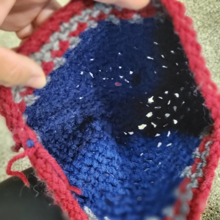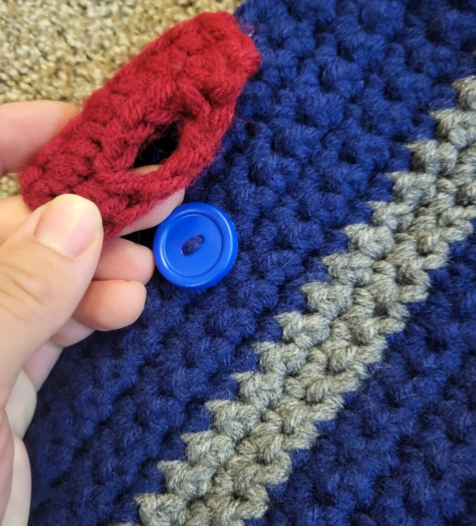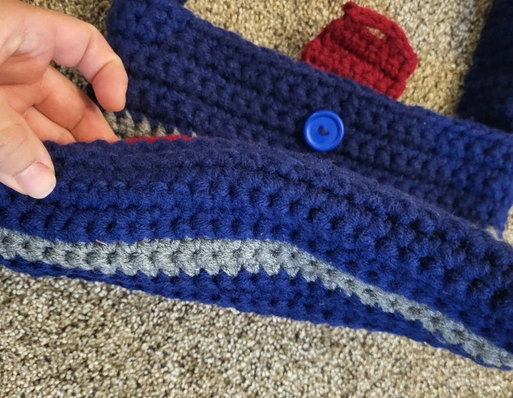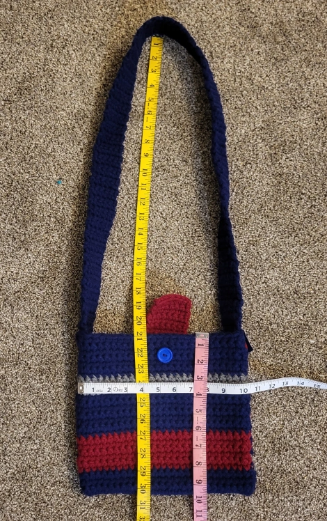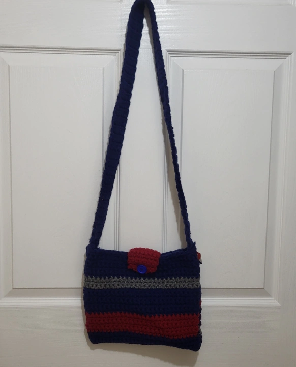 This handmade crochet knit crossbody bag is the perfect accessory for any casual occasion. The bag features a square shape with a button closure and a blue crossbody strap that adds a touch of bohemian style to your outfit. The multicolor striped pattern in navy blue, gray, red and crochet accents give the bag a unique and colorful vibe that is sure to turn heads.
