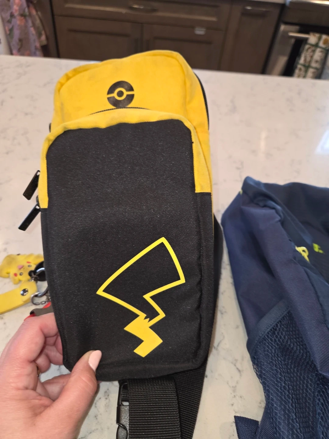 Yellow and black sling bag featuring a Pikachu lightning bolt design and a Poké Ball logo. It's made of durable fabric with a zippered main compartment and an adjustable strap. A Pikachu charm is attached to the zipper.