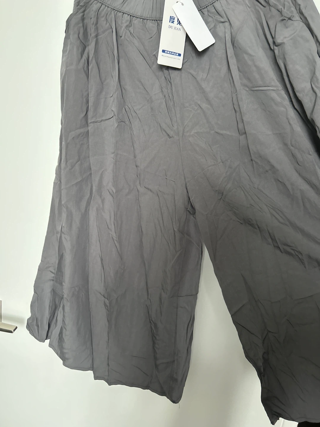 These are a pair of grey wide leg pants from Du Jian. They are in good condition and ready for a new home! These are grey wide-leg pants. They're brand new, but I bought them too big, so I need to sell them.