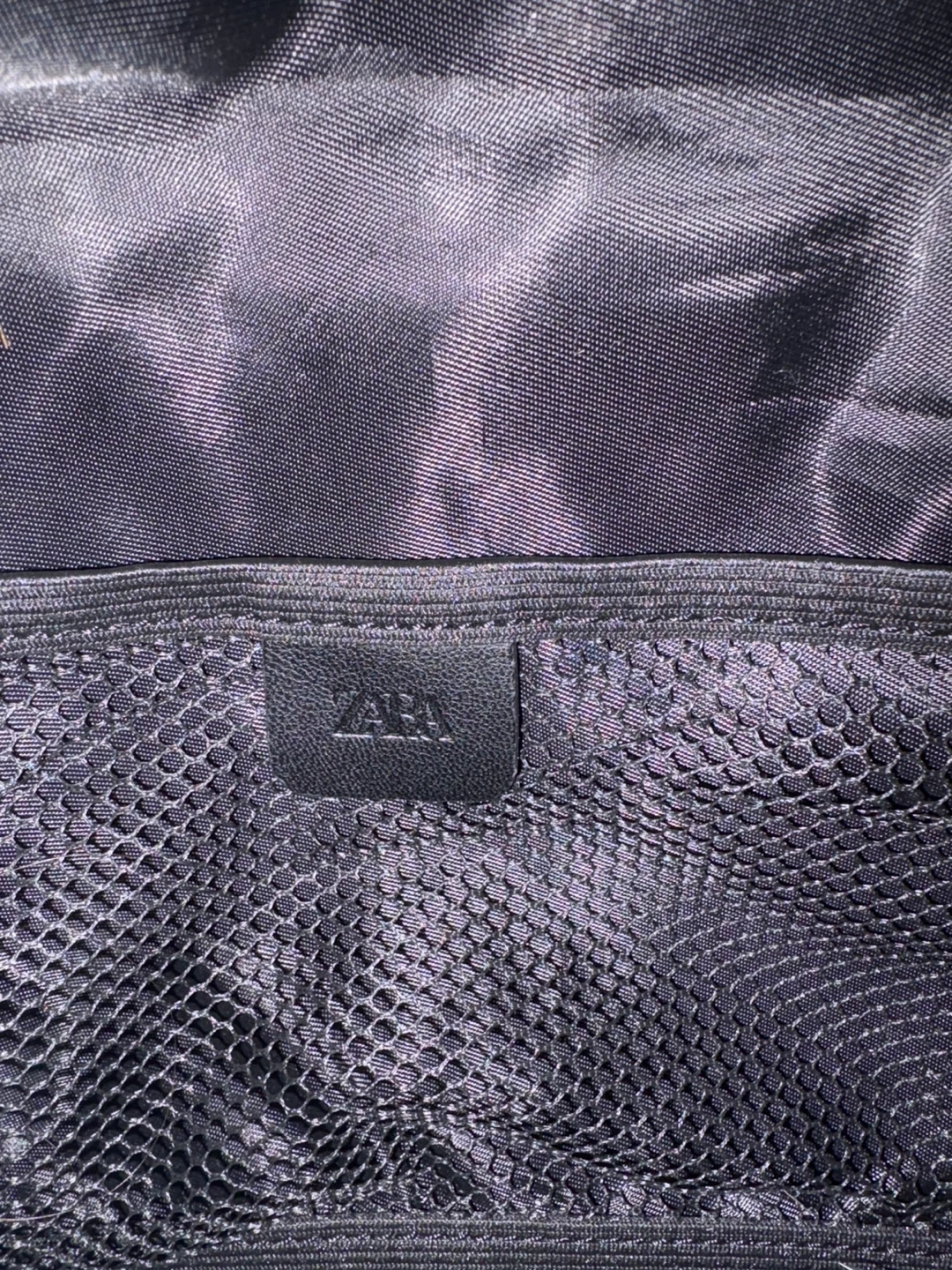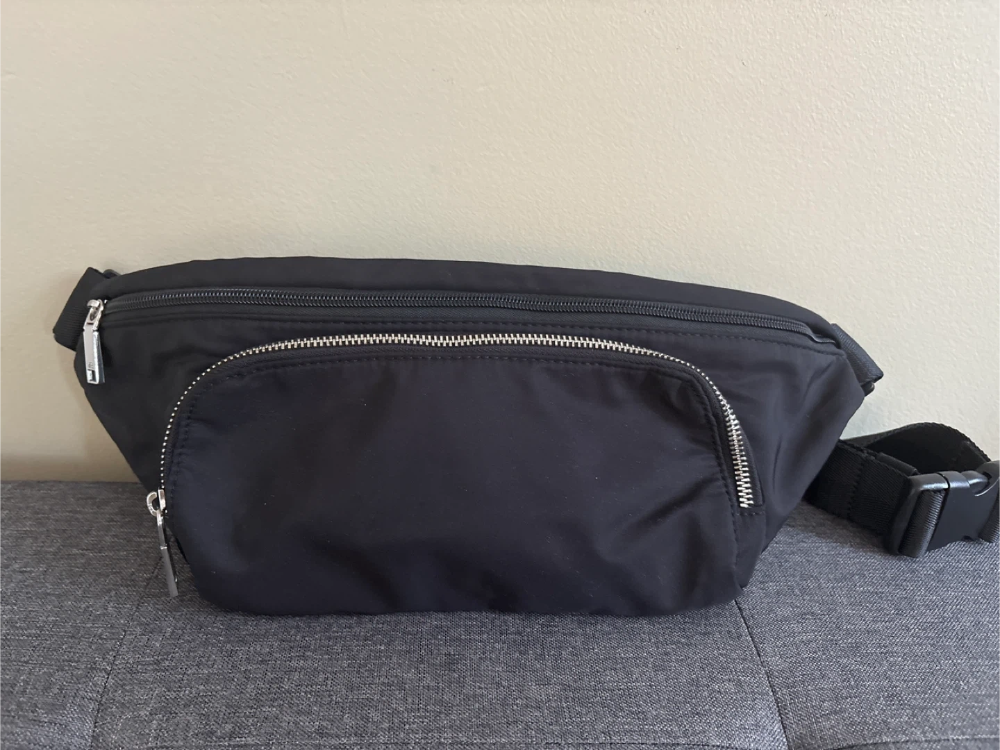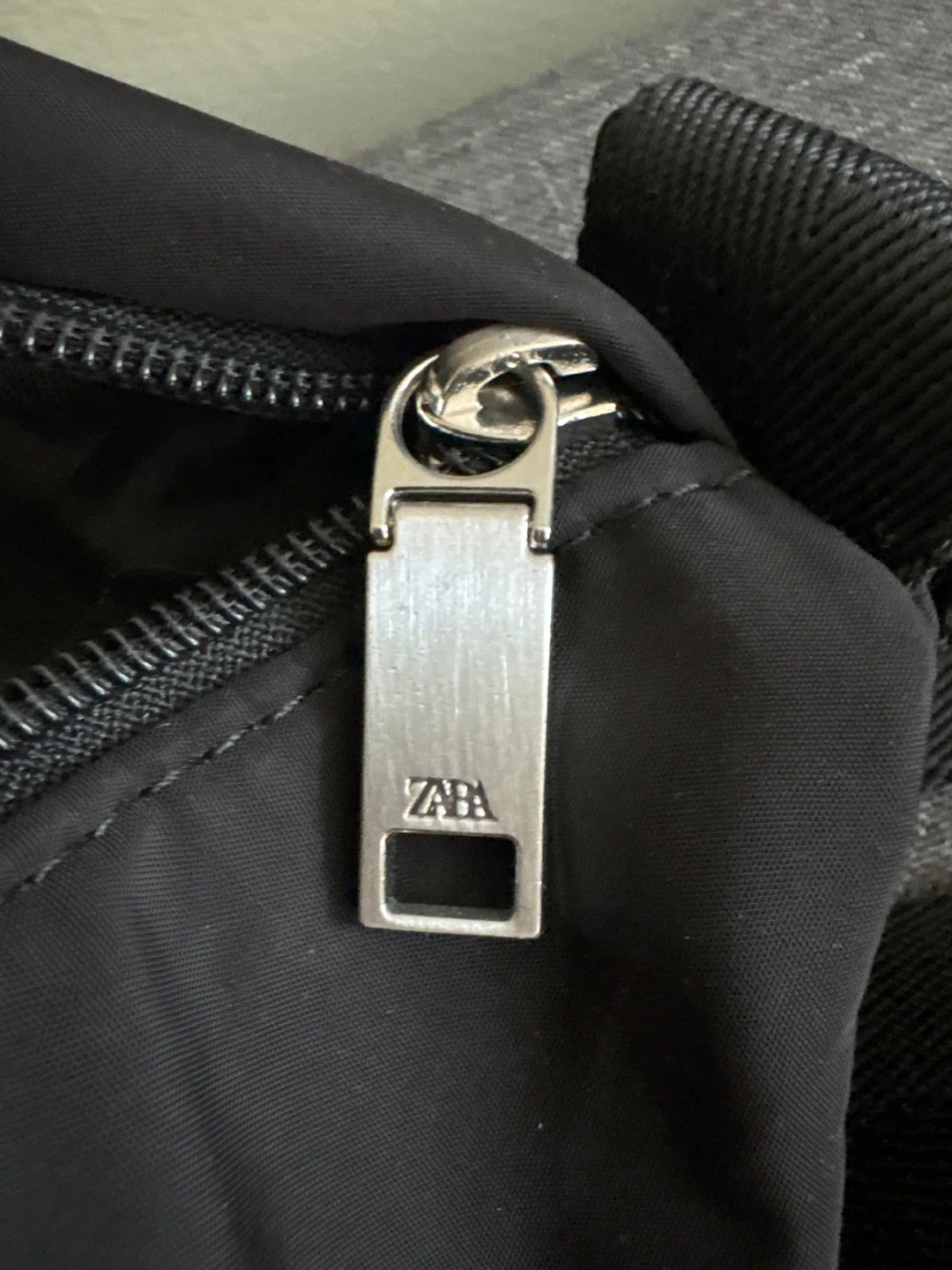 This is a black fanny pack from Zara. It's made of nylon and features multiple zippered compartments. It has an adjustable strap with a buckle closure.
