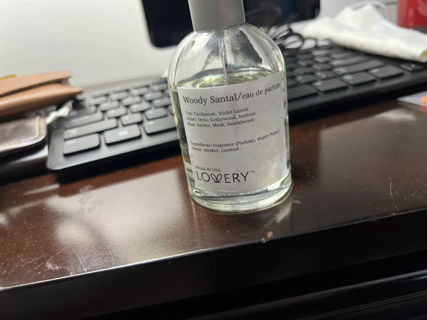 Woody Santal Eau de Parfum. Notes include Cardamom, Violet Leaves, Orris, Cedarwood, Ambrox, Amber, Musk, Sandalwood.