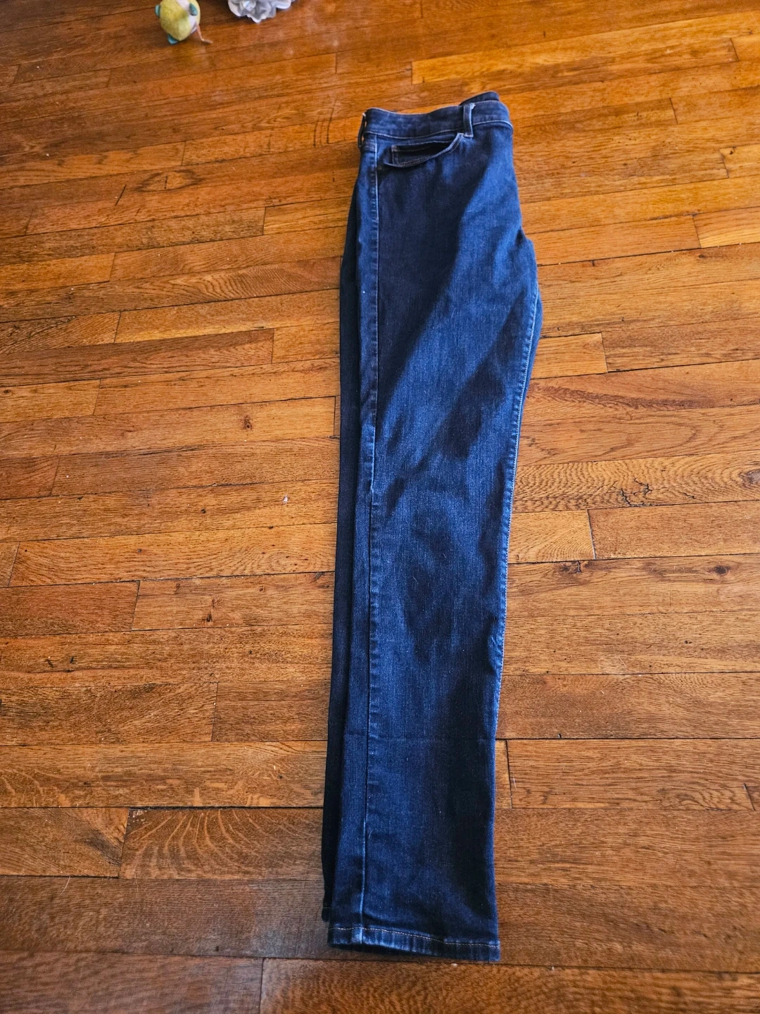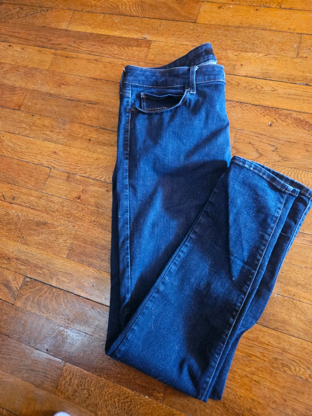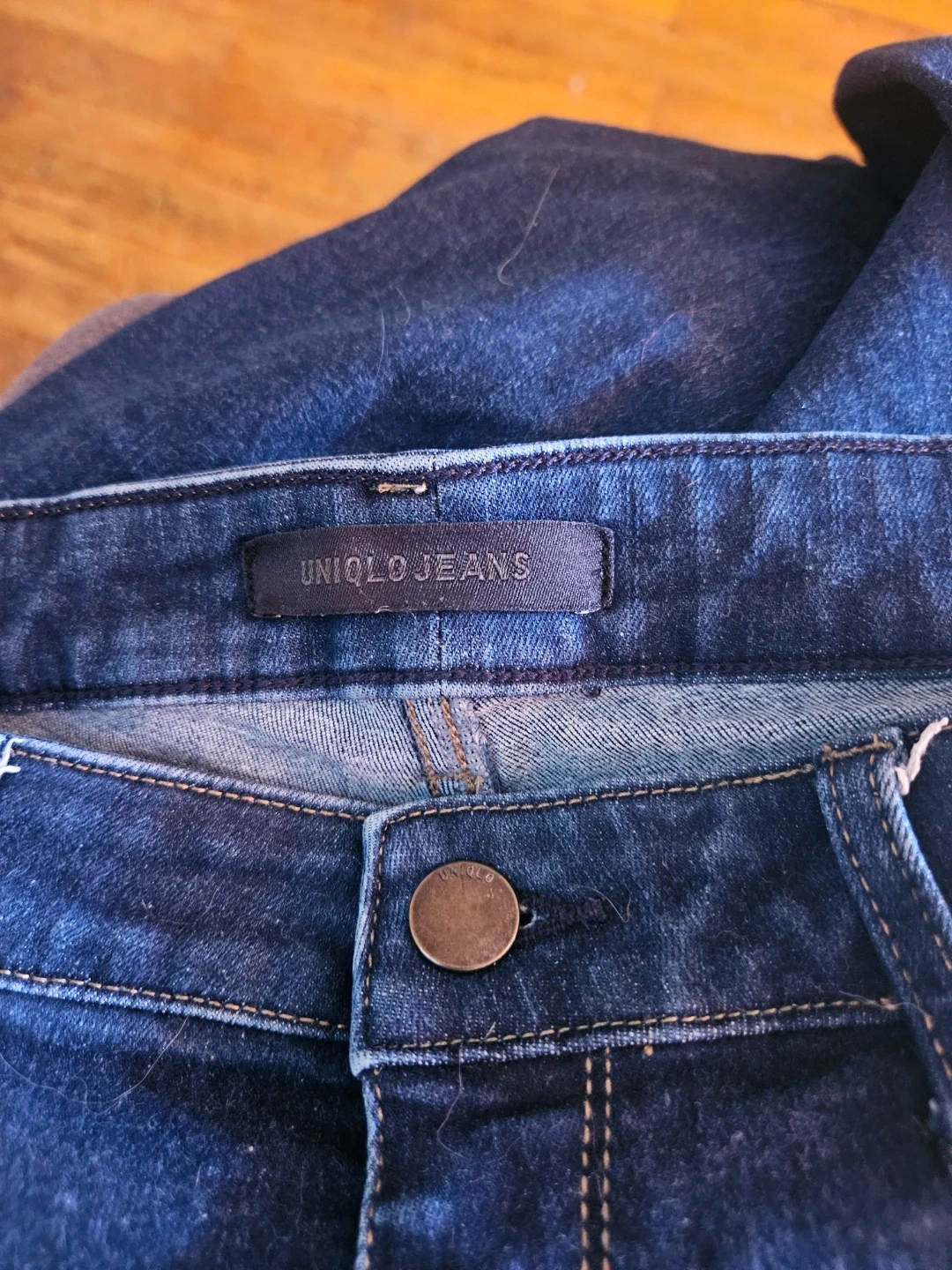 Dark wash denim jeans from Uniqlo. These jeans are made from a comfortable stretch denim. Classic five-pocket style.