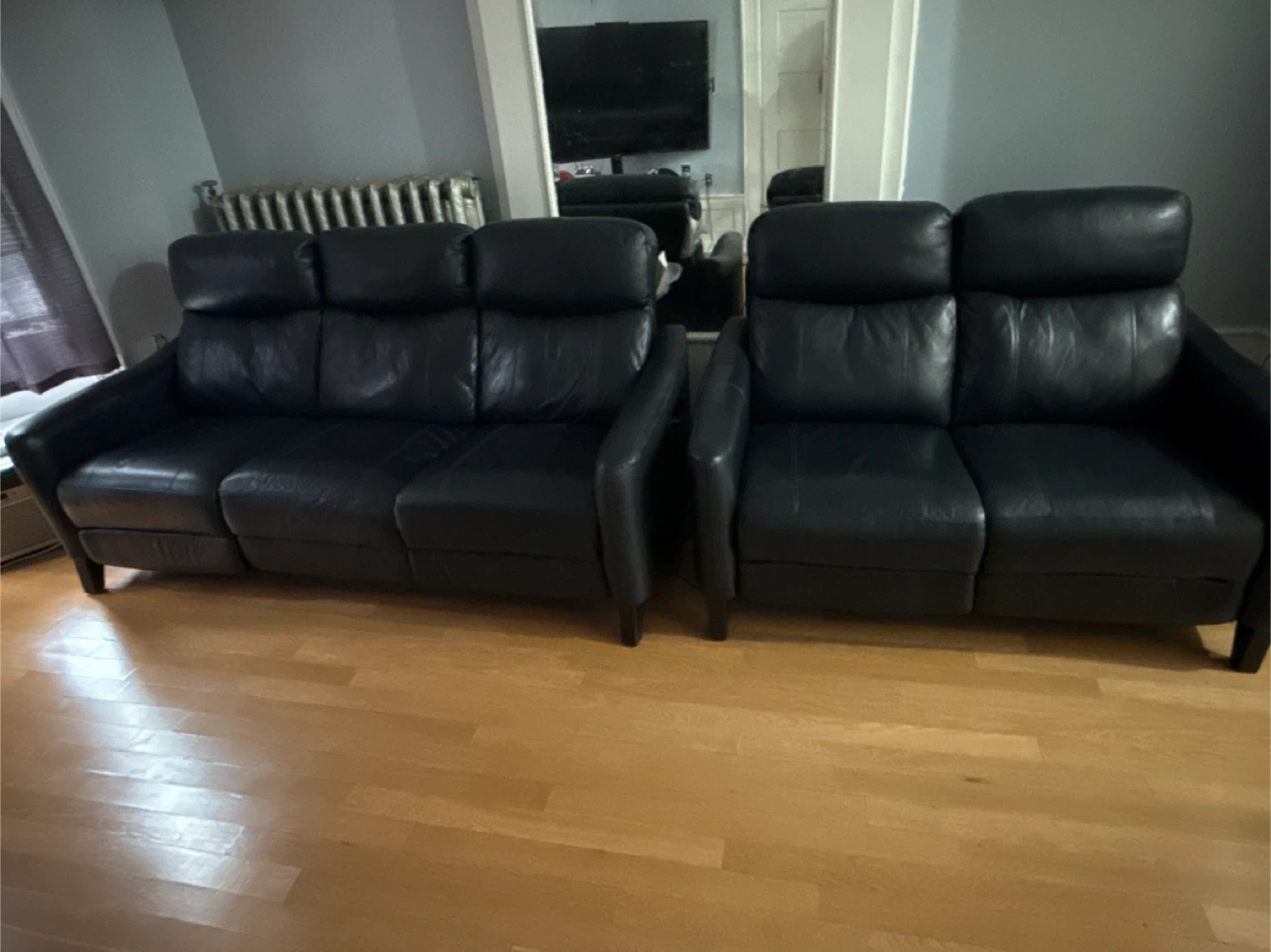 Navy dual reclining sofa and loveseat purchased at Bob's furniture. Extremely well condition! I am moving and would like to sell as quickly as possible