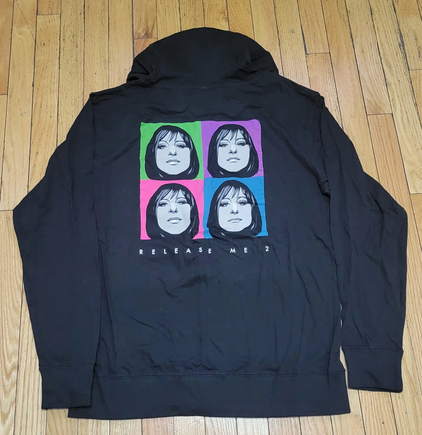 This black zip-up hoodie features Barbra Streisand's "Release Me 2" album art on the back. It's made of 100% cotton and has a size L tag. Come with CD, handkerchief and journal.