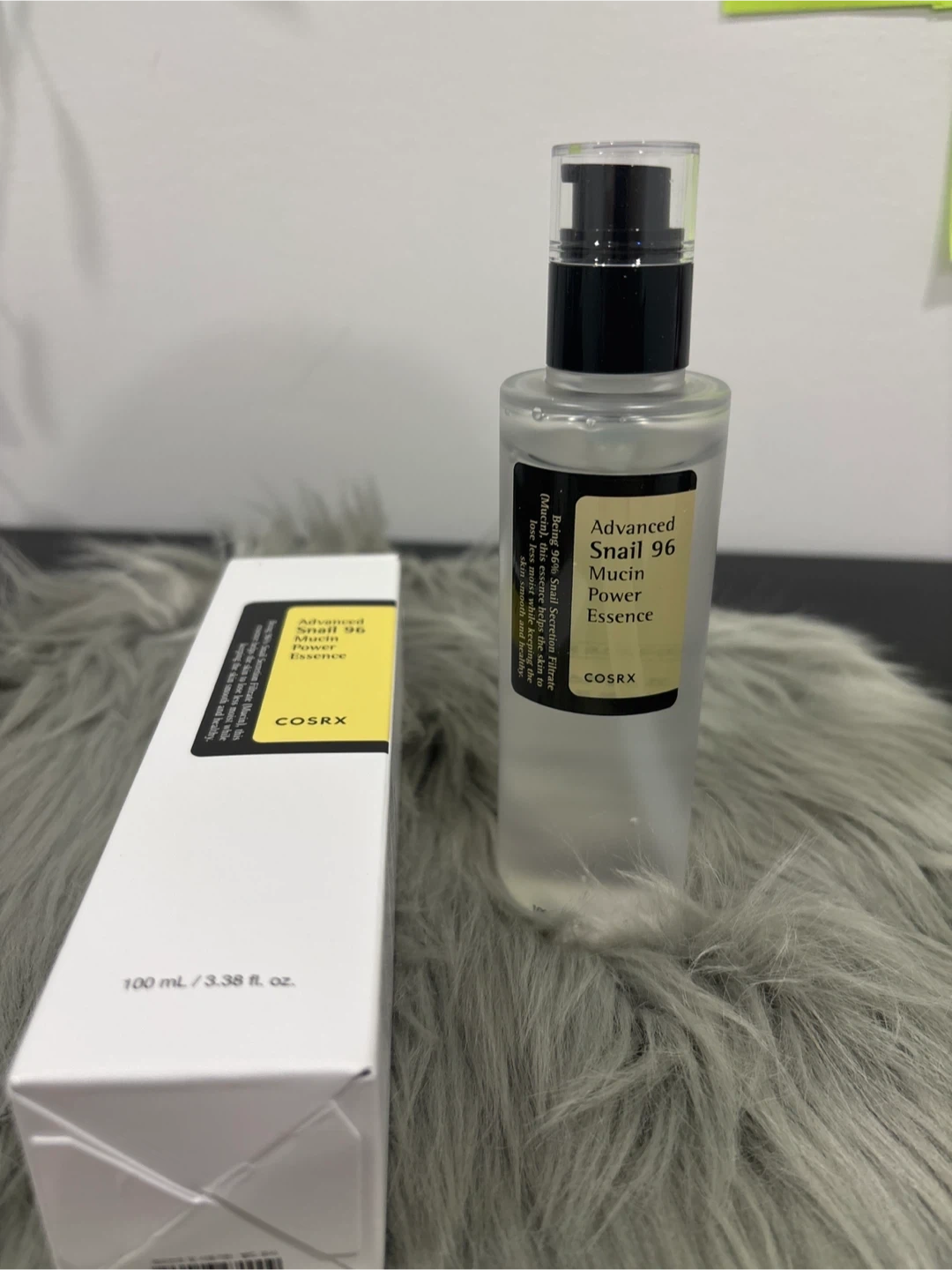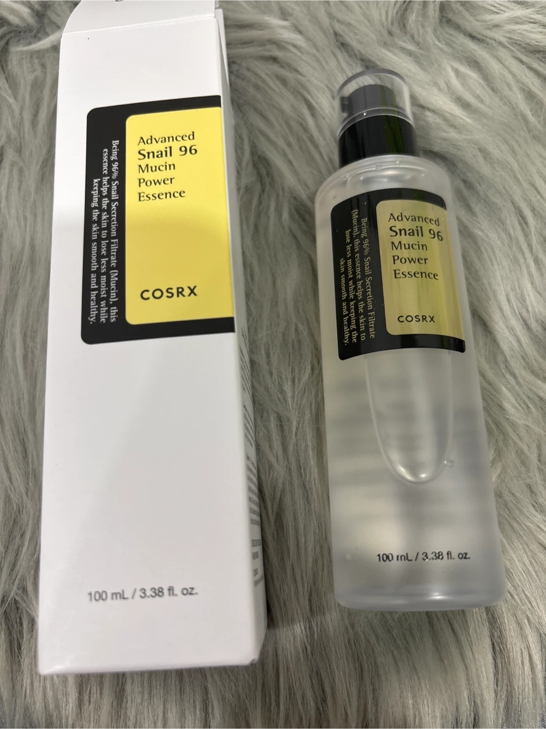 This is the COSRX Advanced Snail 96 Mucin Power Essence. It's formulated with 96% snail secretion filtrate to help moisturize and protect the skin. Includes original box. 100 ml / 3.38 fl. oz.