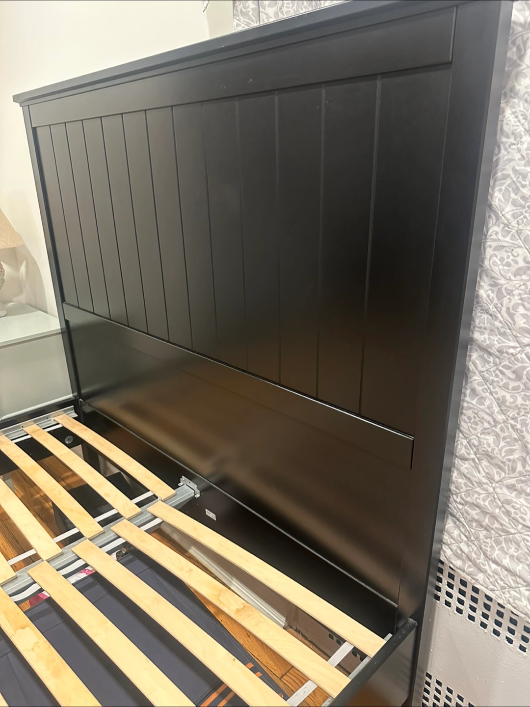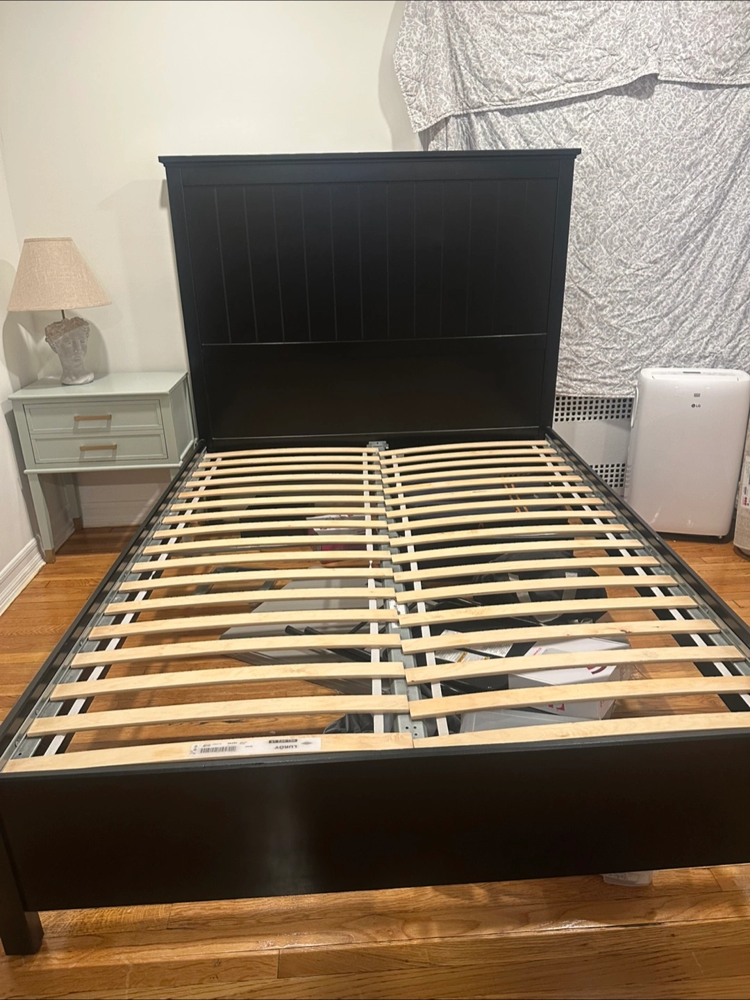Queen size platform bed frame, black finish. Includes slats. Minimal assembly required. Solid wood construction. Modern style.